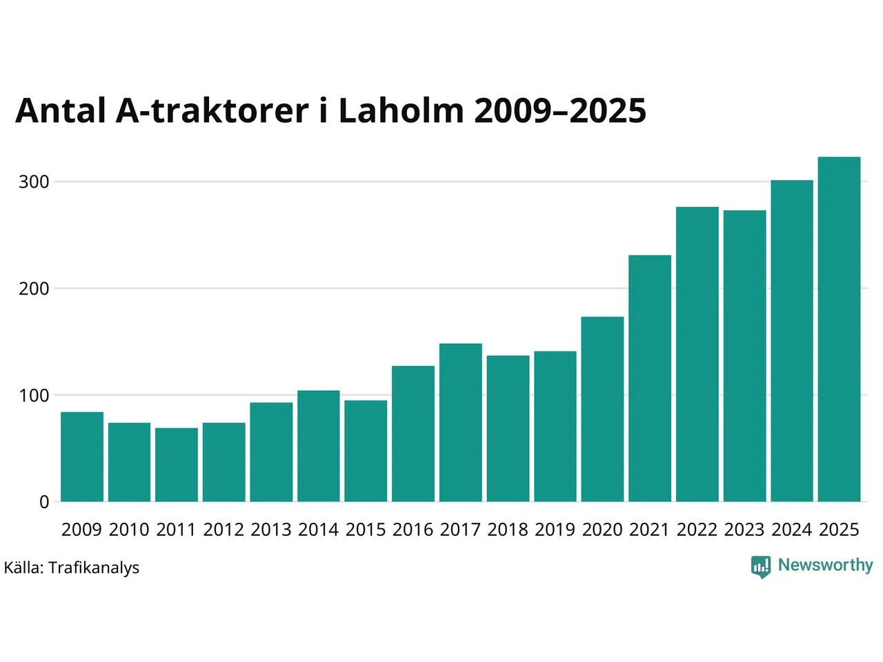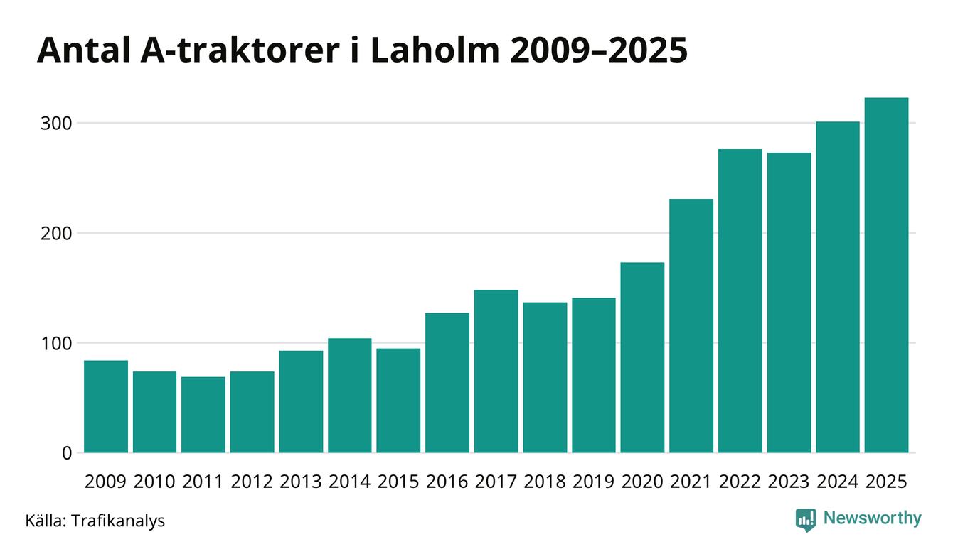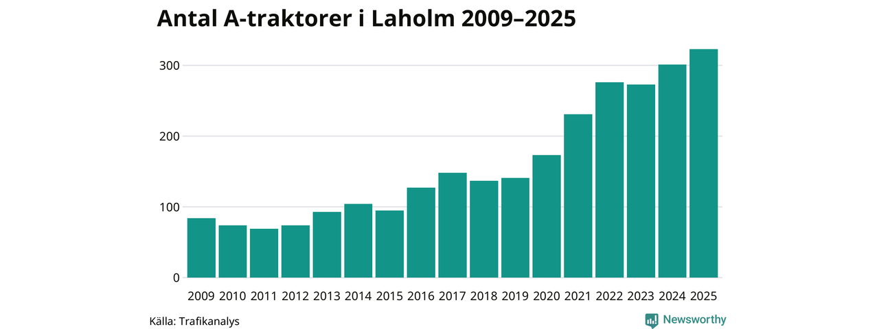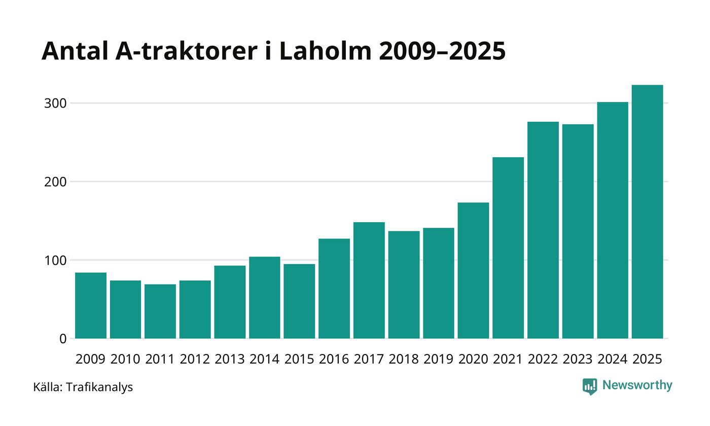 För andra året i rad ökar antalet A-traktorer i Laholms kommun, visar nya siffror från Trafikanalys. I slutet av 2025 fanns 323 A-traktorer registrerade i kommunen, vilket är 22 mer än året innan – en ökning med 7 procent. Det visar nya siffror från Trafikanalys. Inte sedan åtminstone 2009, som är det första året vi har statistik för, har det funnits så många A-traktorer i kommunen.