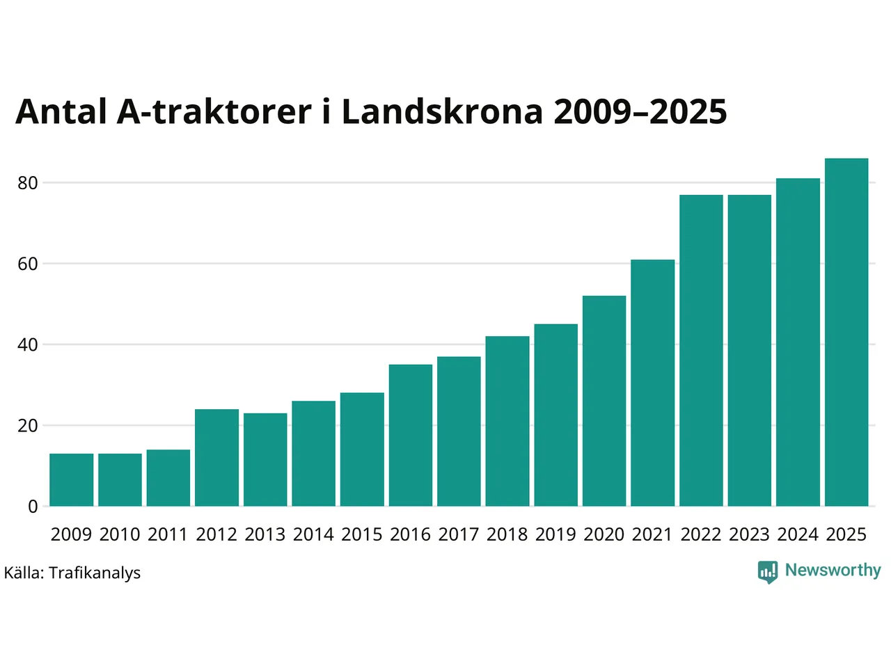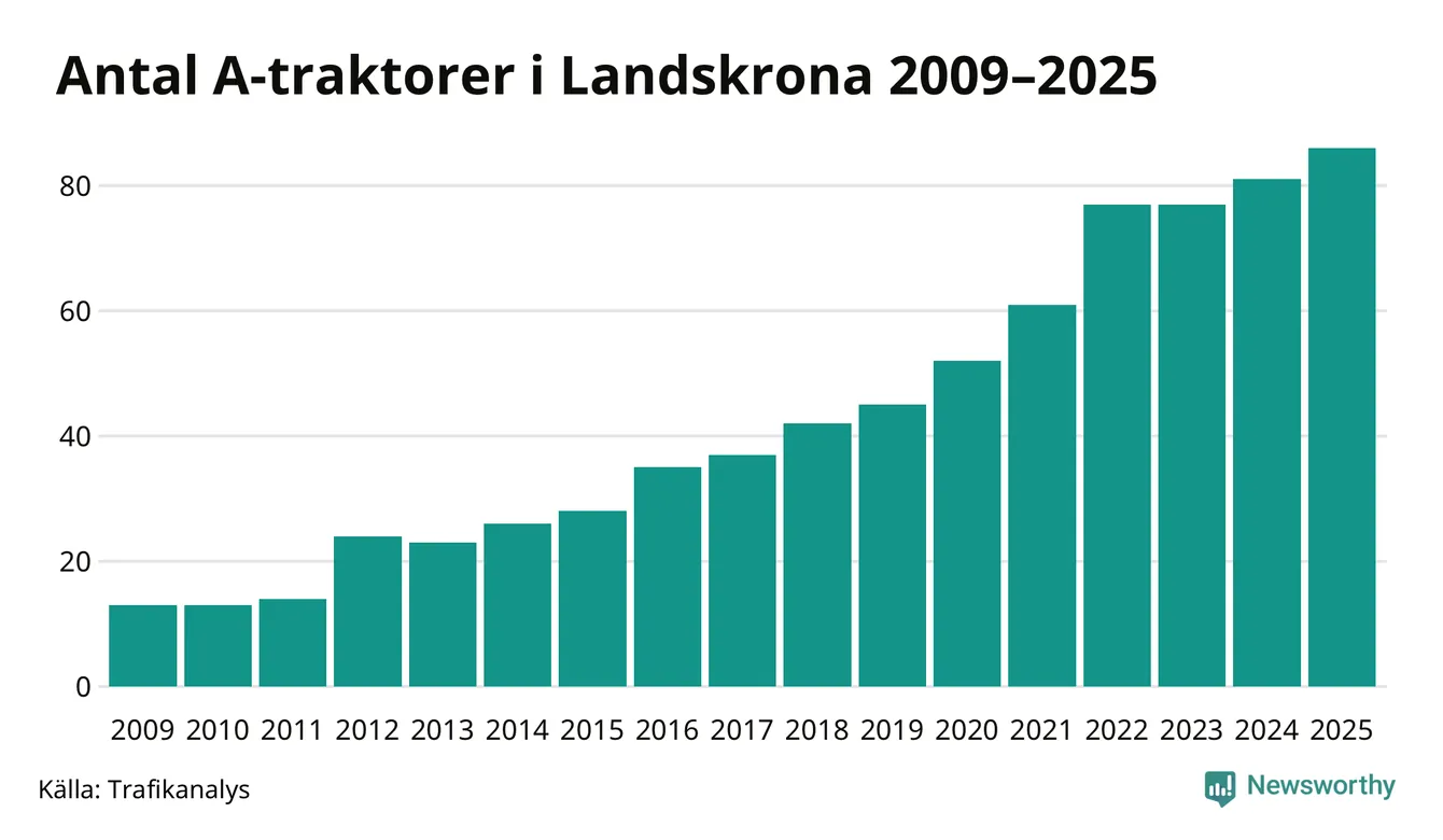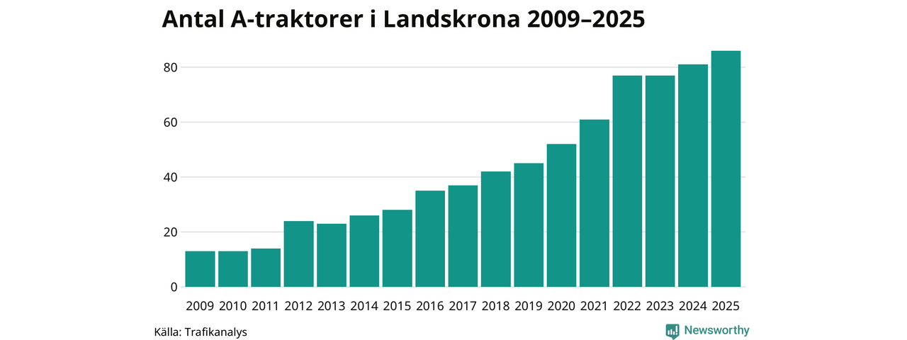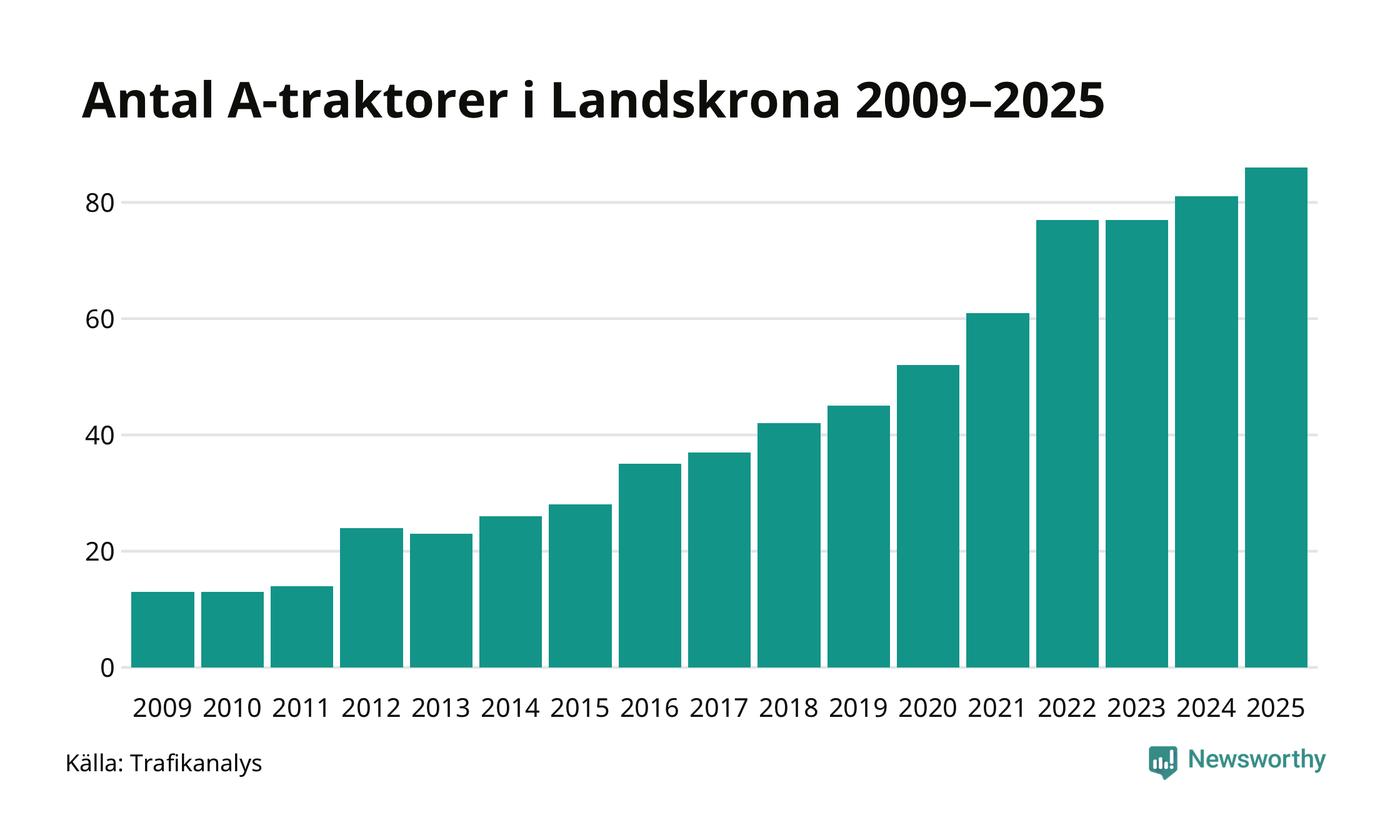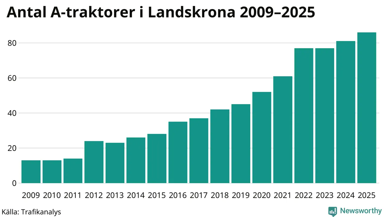 För andra året i rad ökar antalet A-traktorer i Landskrona kommun, visar nya siffror från Trafikanalys. I slutet av 2025 fanns 86 A-traktorer registrerade i kommunen, vilket är fem mer än året innan. Det visar nya siffror från Trafikanalys. Inte sedan åtminstone 2009, som är det första året vi har statistik för, har det funnits så många A-traktorer i kommunen.