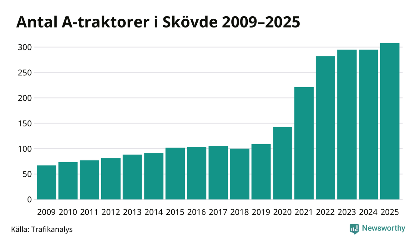 Under det senaste decenniet har antalet A-traktorer femdubblats i Sverige – och under 2025 fortsatte utvecklingen. Även i Skövde blev de fler.