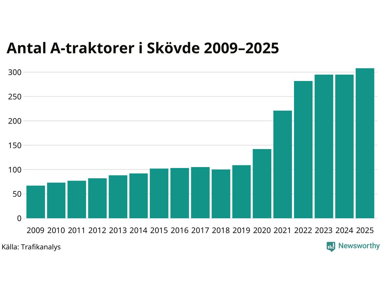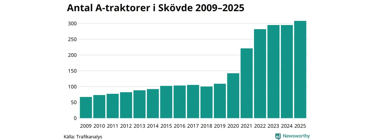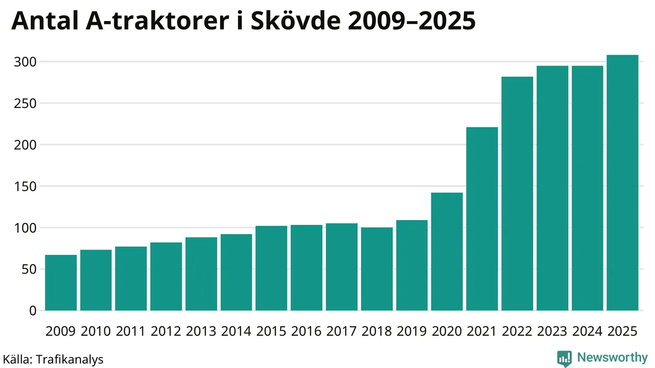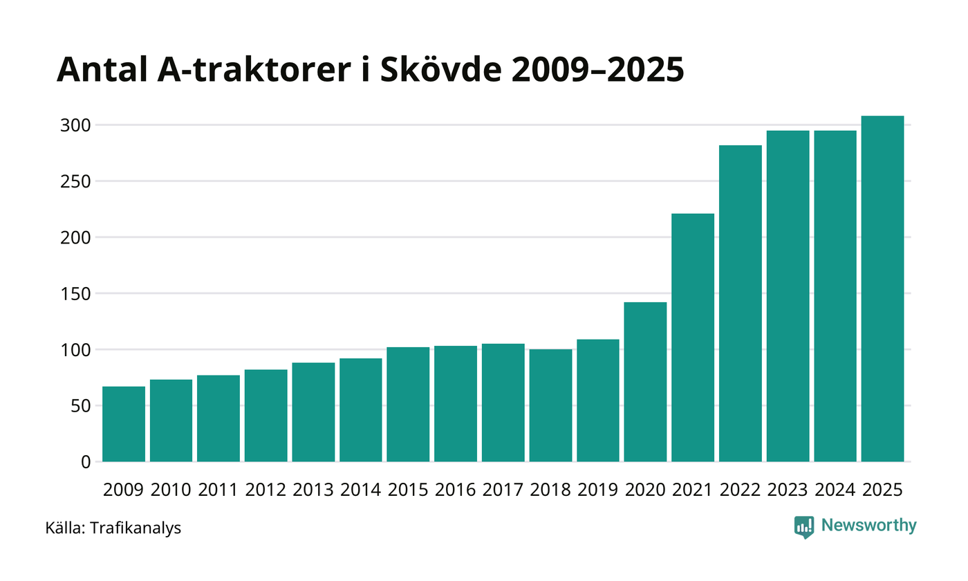 I slutet av 2025 fanns 308 A-traktorer registrerade i kommunen, vilket är 13 mer än året innan – en ökning med 4 procent. Det visar nya siffror från Trafikanalys. Inte sedan åtminstone 2009, som är det första året vi har statistik för, har det funnits så många A-traktorer i kommunen.