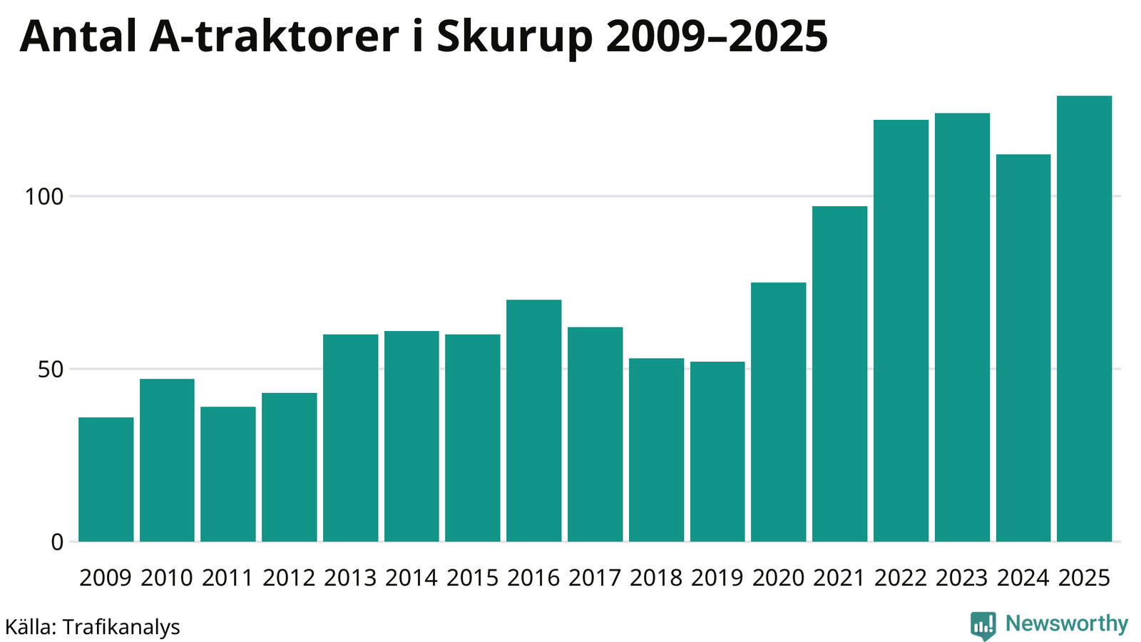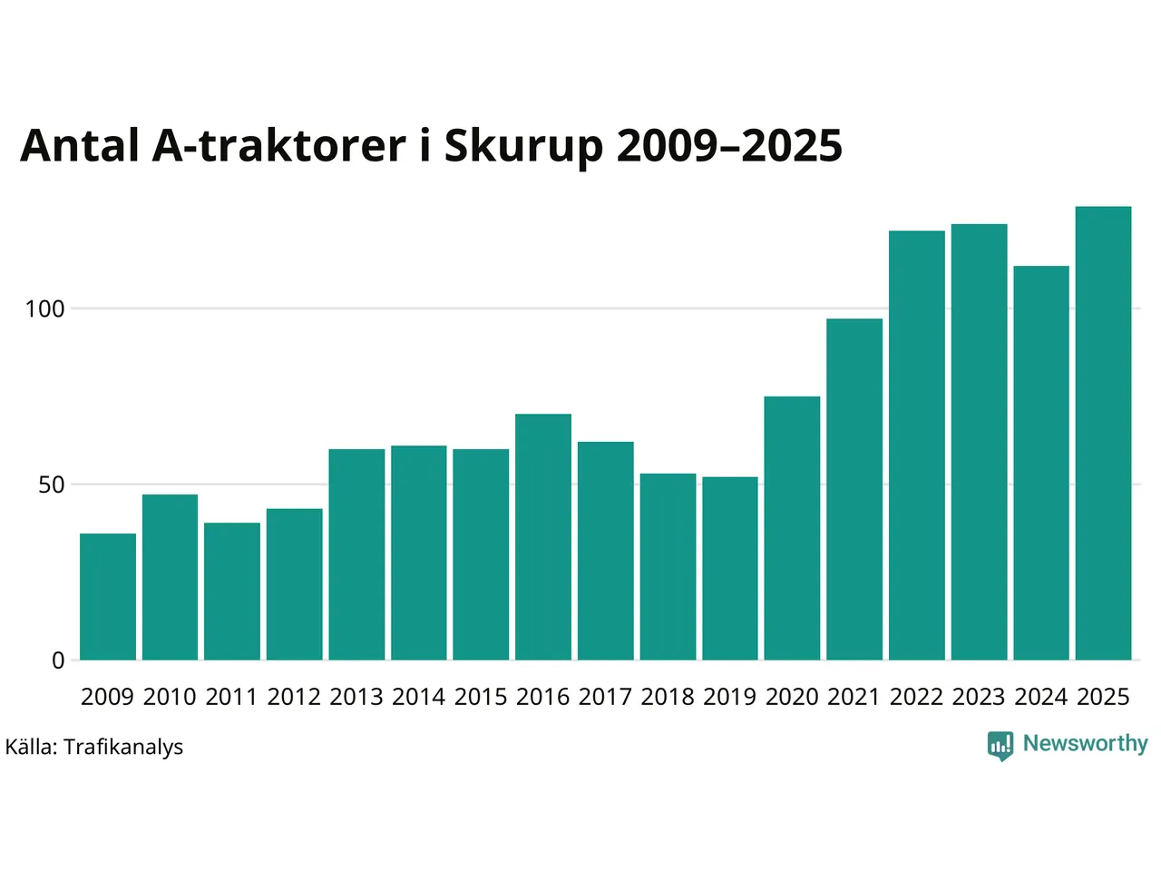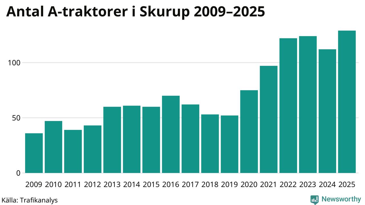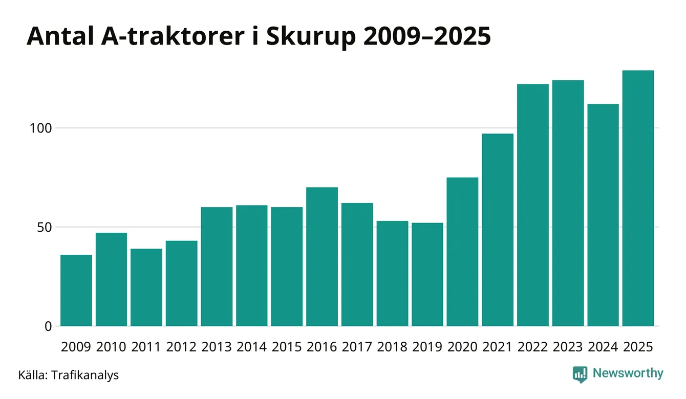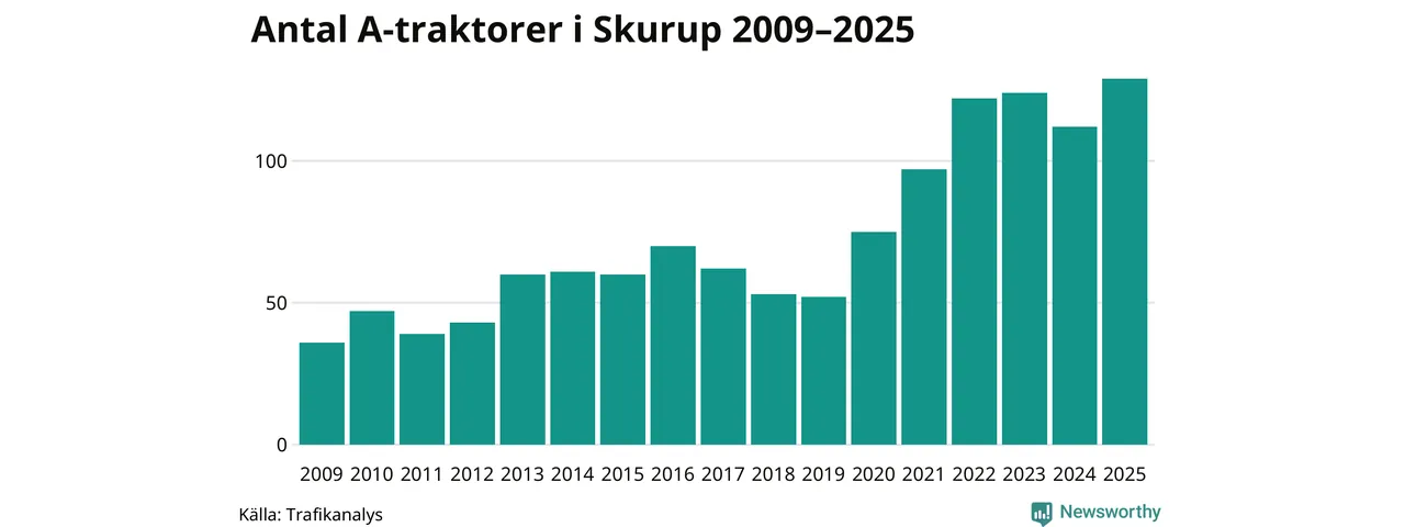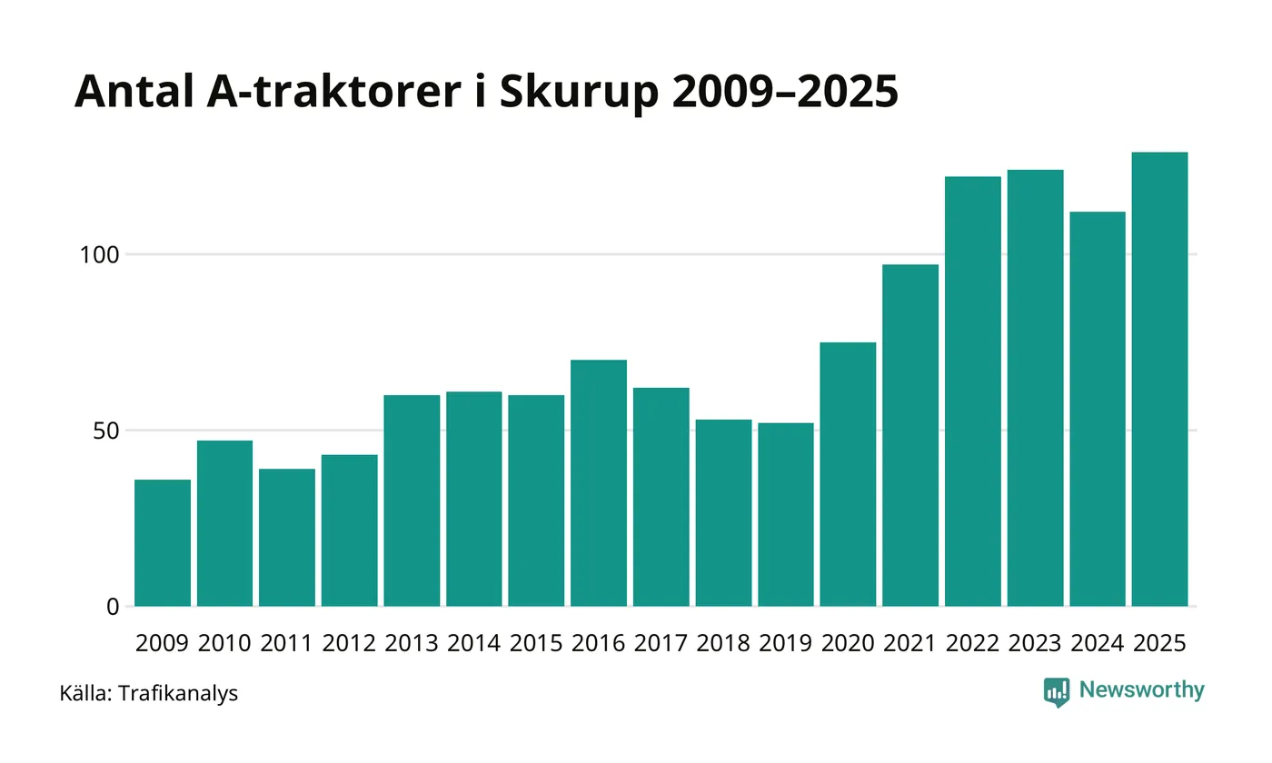 I slutet av 2025 fanns 129 A-traktorer registrerade i kommunen, vilket är 17 mer än året innan – en ökning med 15 procent. Det visar nya siffror från Trafikanalys. Inte sedan åtminstone 2009, som är det första året vi har statistik för, har det funnits så många A-traktorer i kommunen.