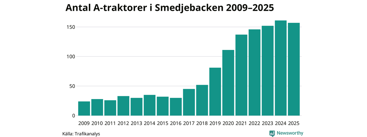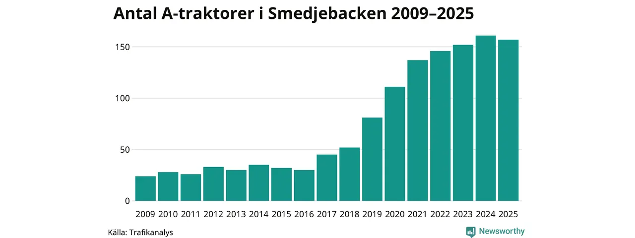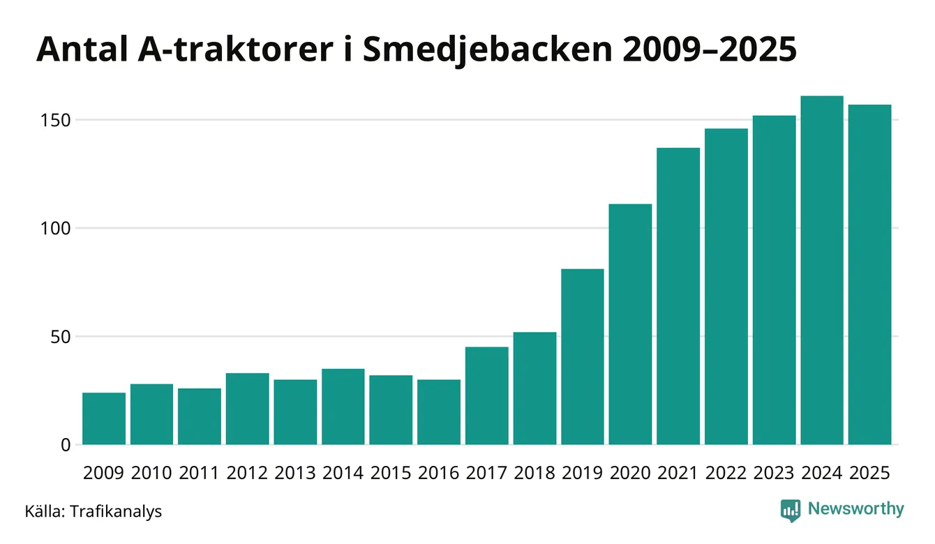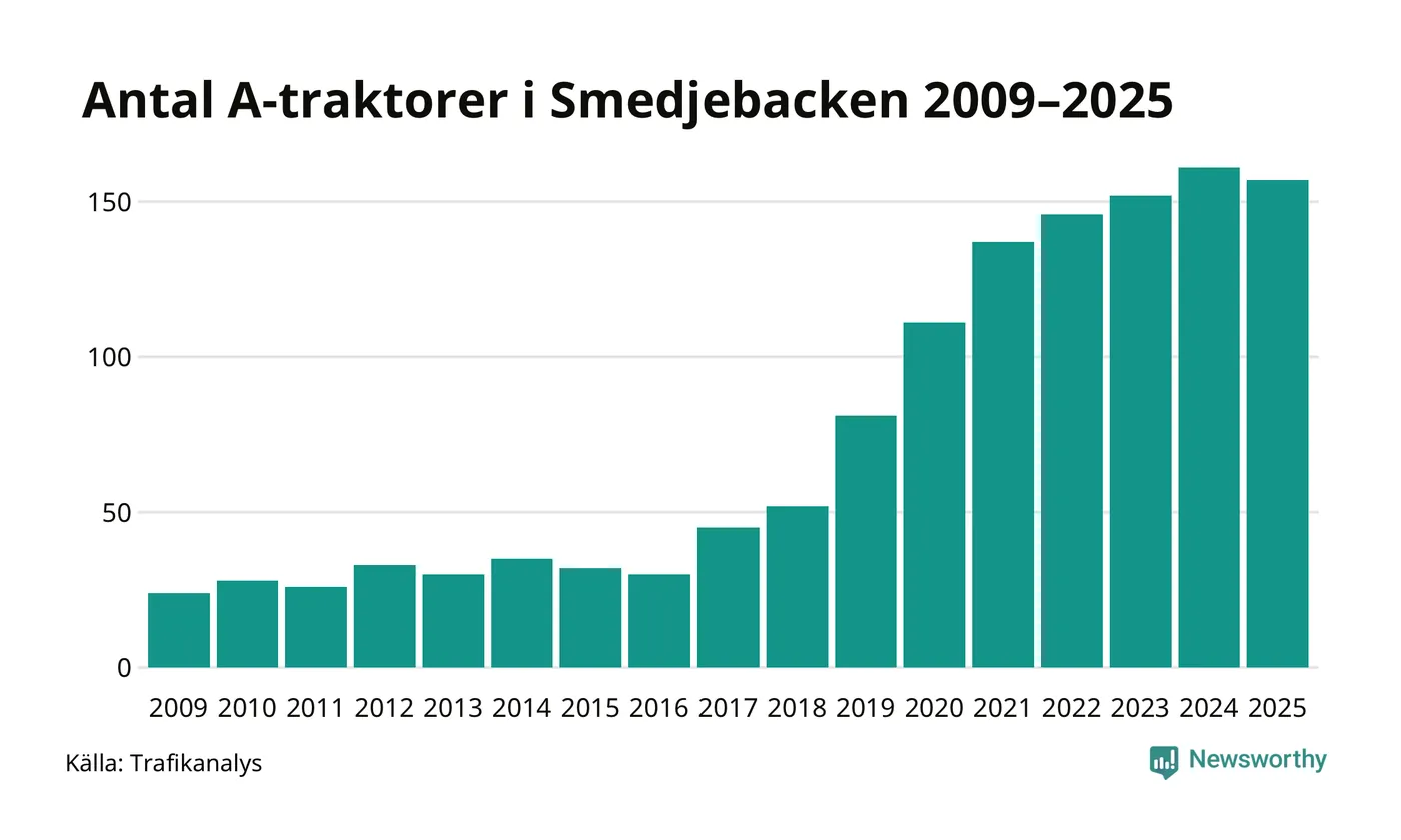 Under det senaste decenniet har antalet A-traktorer femdubblats i Sverige, och under 2025 fortsatte utvecklingen. Men i Smedjebackens kommun blev A-traktorerna färre. Det är första gången sedan 2016 som antalet inte ökar.