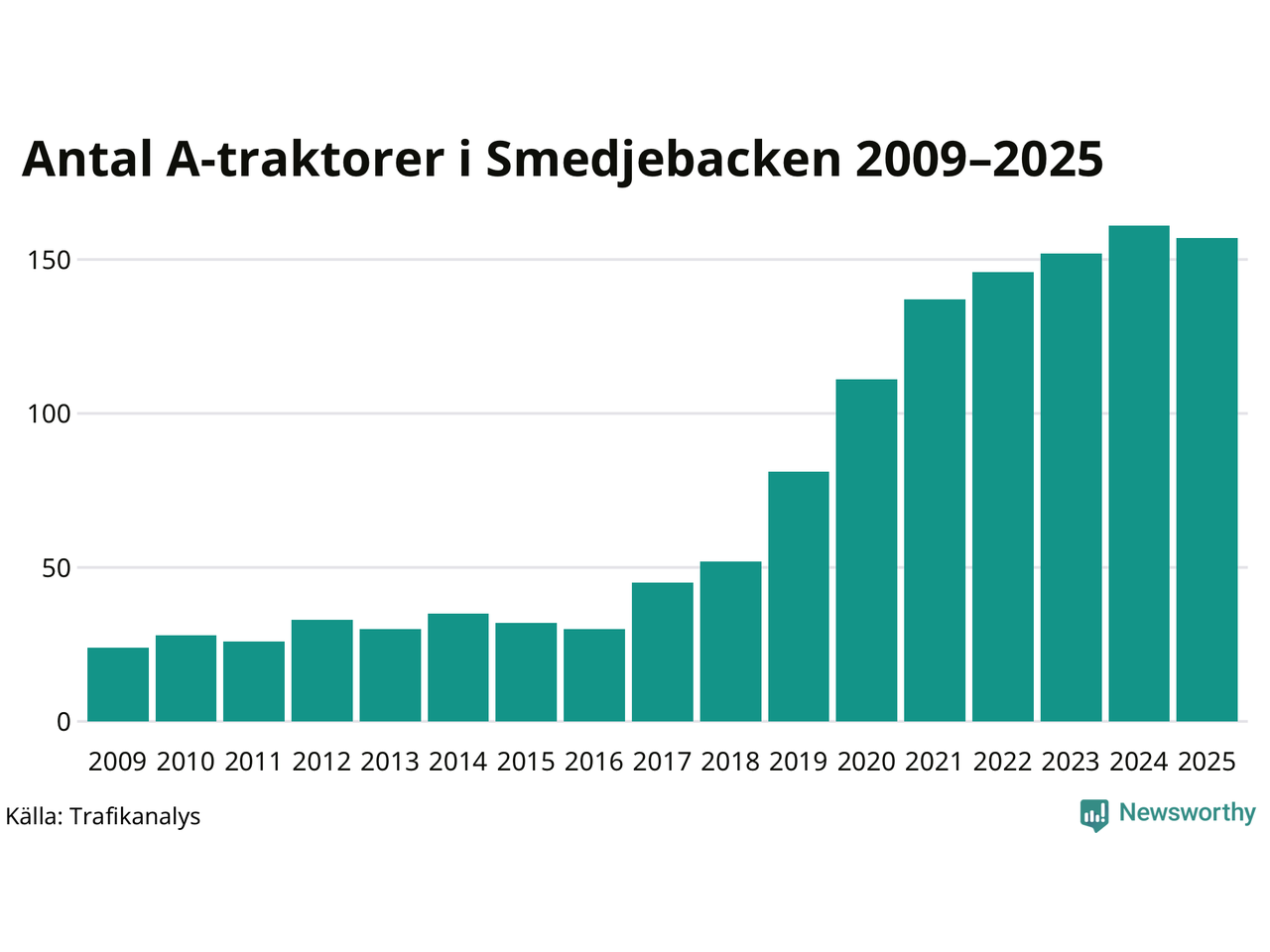 I slutet av 2025 fanns 157 A-traktorer registrerade i Smedjebackens kommun, vilket är fyra mindre än året innan. Det visar nya siffror från Trafikanalys. Det är första gången sedan 2016 som antalet A-traktorer inte ökar i kommunen.