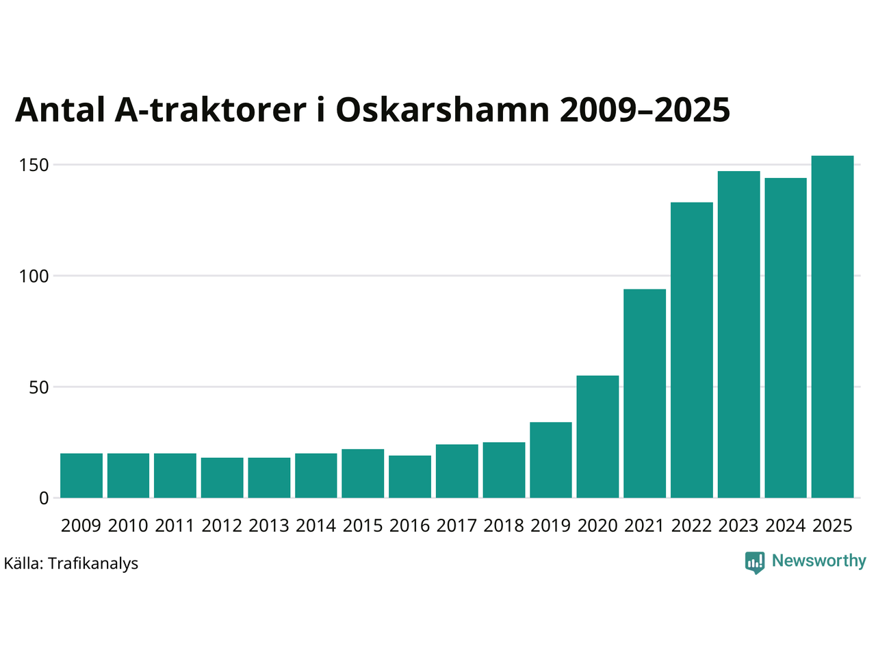 I slutet av 2025 fanns 154 A-traktorer registrerade i kommunen, vilket är tio mer än året innan – en ökning med 7 procent. Det visar nya siffror från Trafikanalys. Inte sedan åtminstone 2009, som är det första året vi har statistik för, har det funnits så många A-traktorer i kommunen.