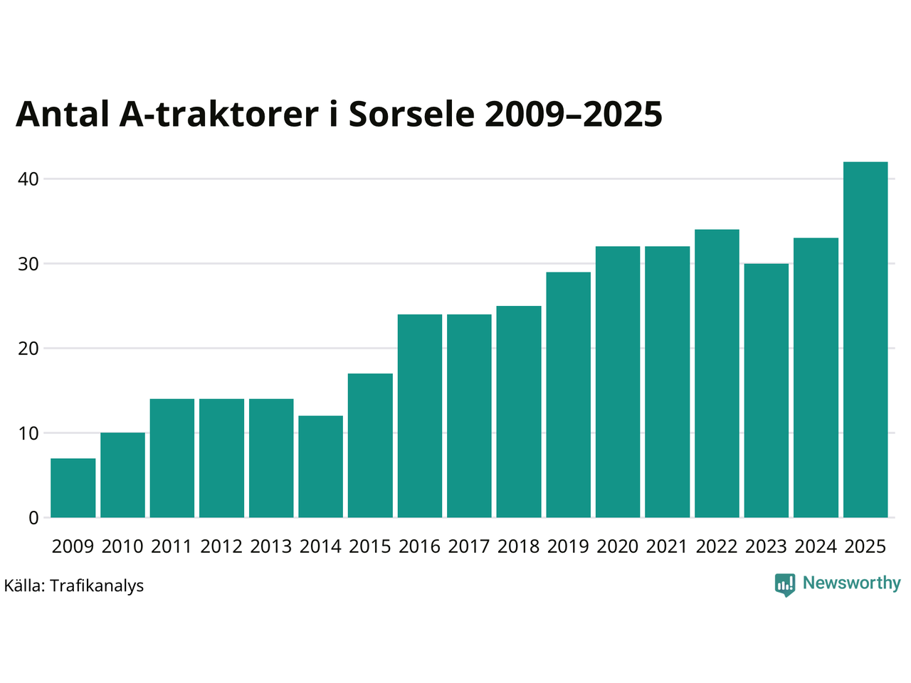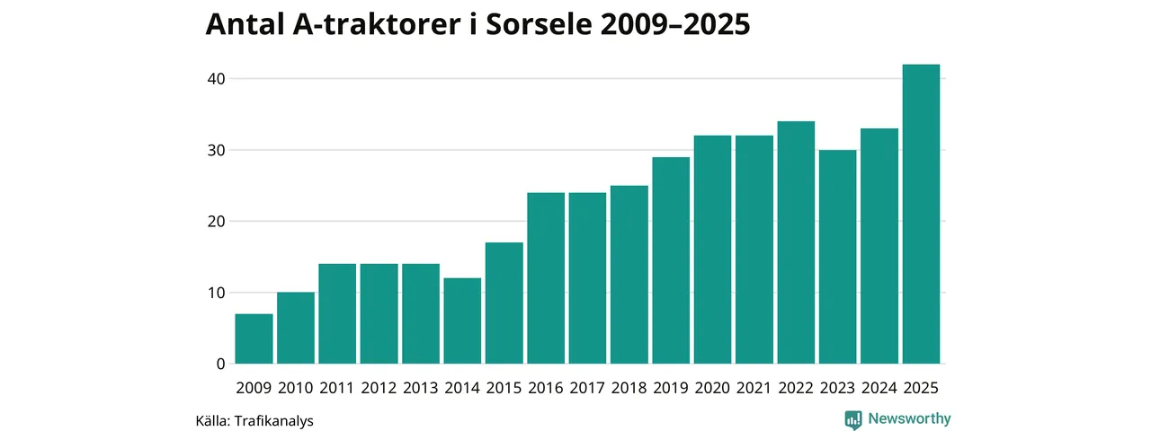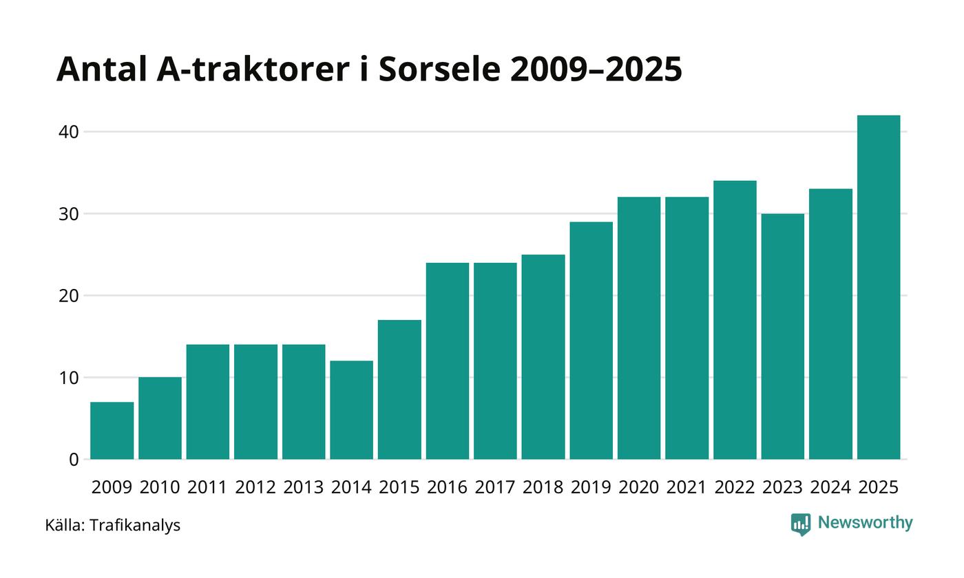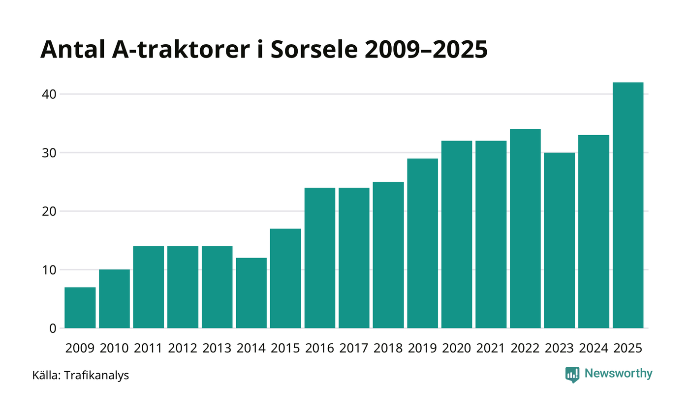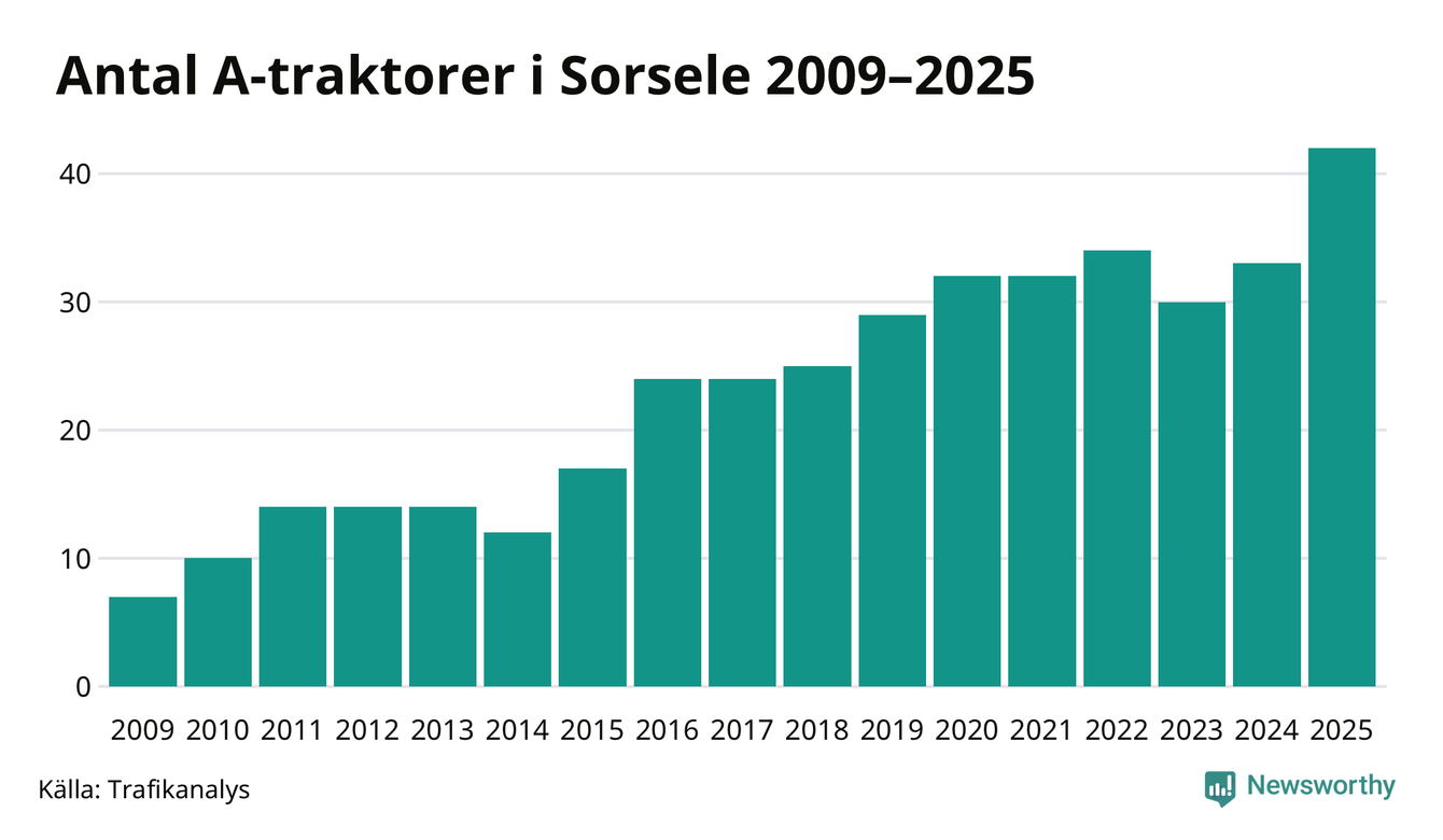 För andra året i rad ökar antalet A-traktorer i Sorsele kommun, visar nya siffror från Trafikanalys. I slutet av 2025 fanns 42 A-traktorer registrerade i kommunen, vilket är nio mer än året innan – en ökning med 27 procent. Det visar nya siffror från Trafikanalys. Ökningen är den största från ett år till ett annat någonsin i Sorsele kommun i absoluta tal och den näst största ökningen i Västerbottens län i år.