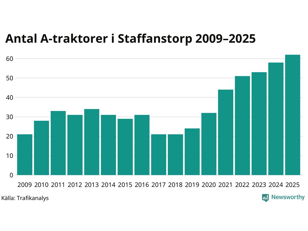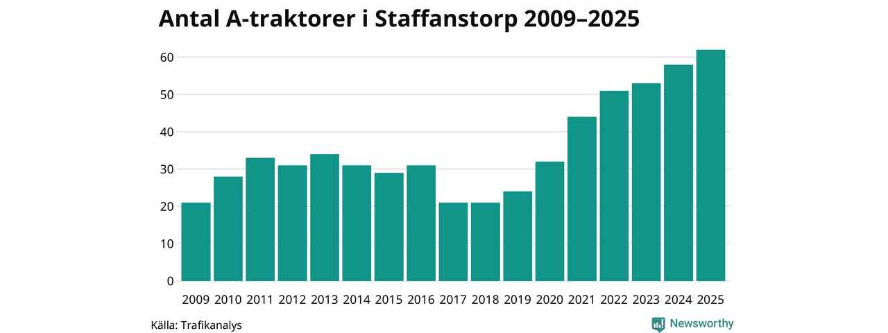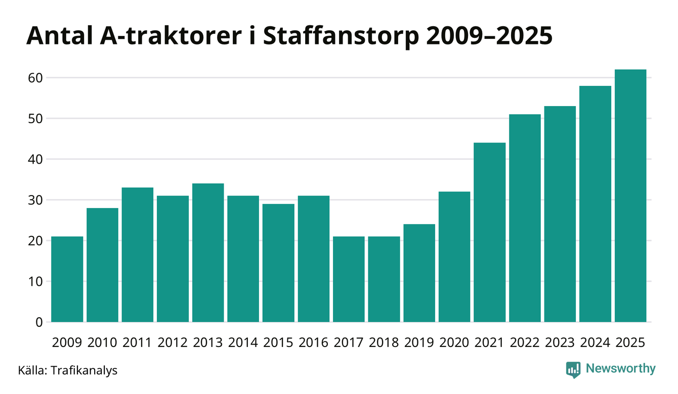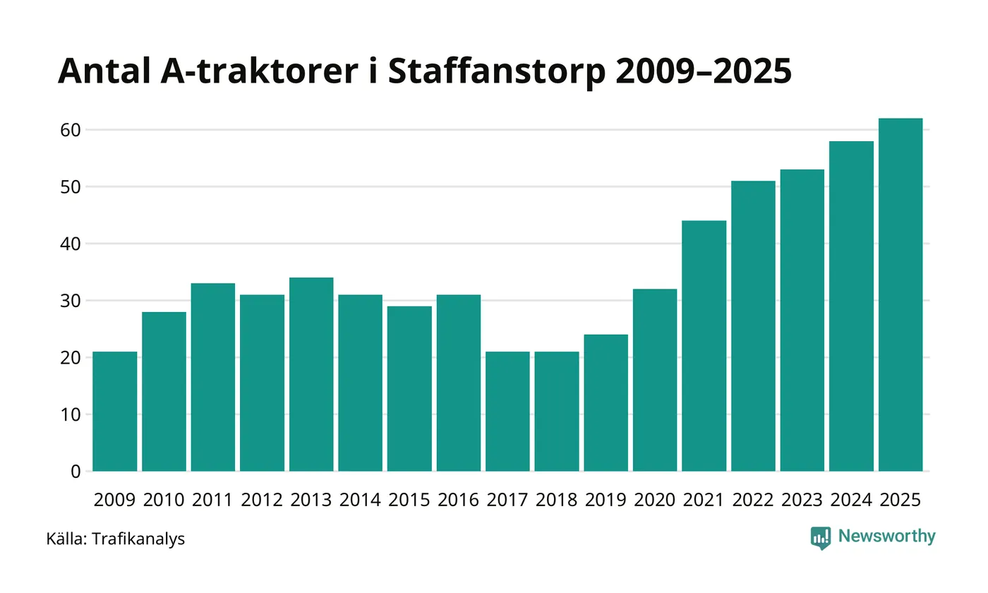För sjunde året i rad ökar antalet A-traktorer i Staffanstorps kommun, visar nya siffror från Trafikanalys. I slutet av 2025 fanns 62 A-traktorer registrerade i kommunen, vilket är fyra mer än året innan. Inte sedan åtminstone 2009, som är det första året vi har statistik för, har det funnits så många A-traktorer i kommunen.