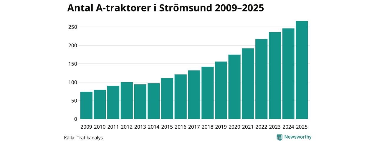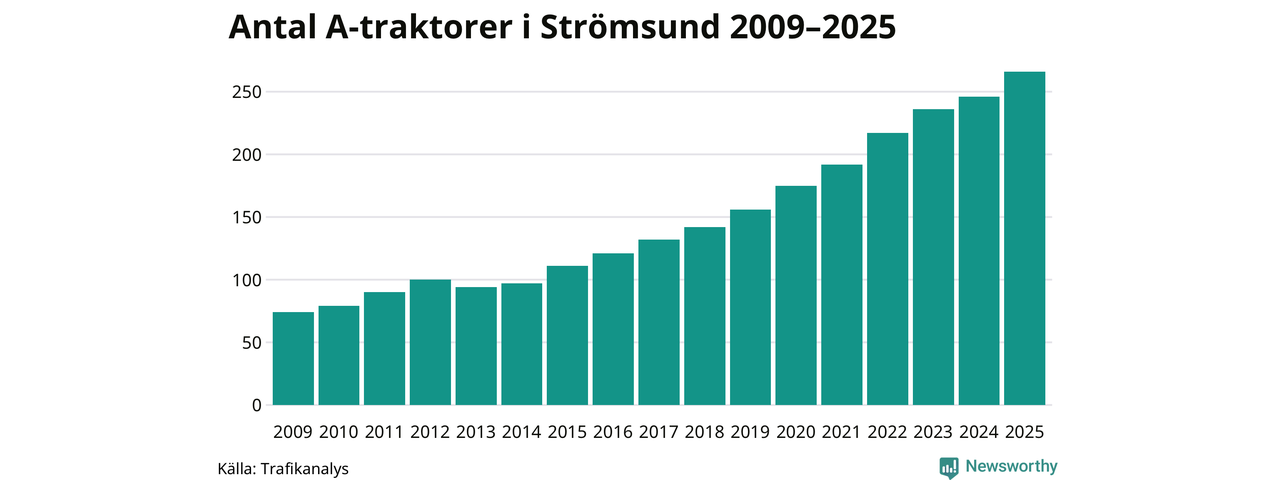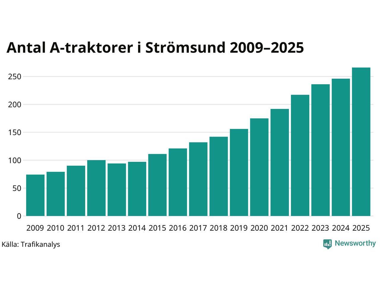 För tolfte året i rad ökar antalet A-traktorer i Strömsunds kommun, visar nya siffror från Trafikanalys. I slutet av 2025 fanns 266 A-traktorer registrerade i kommunen, vilket är 20 mer än året innan – en ökning med 8 procent. Inte sedan åtminstone 2009, som är det första året vi har statistik för, har det funnits så många A-traktorer i kommunen.
