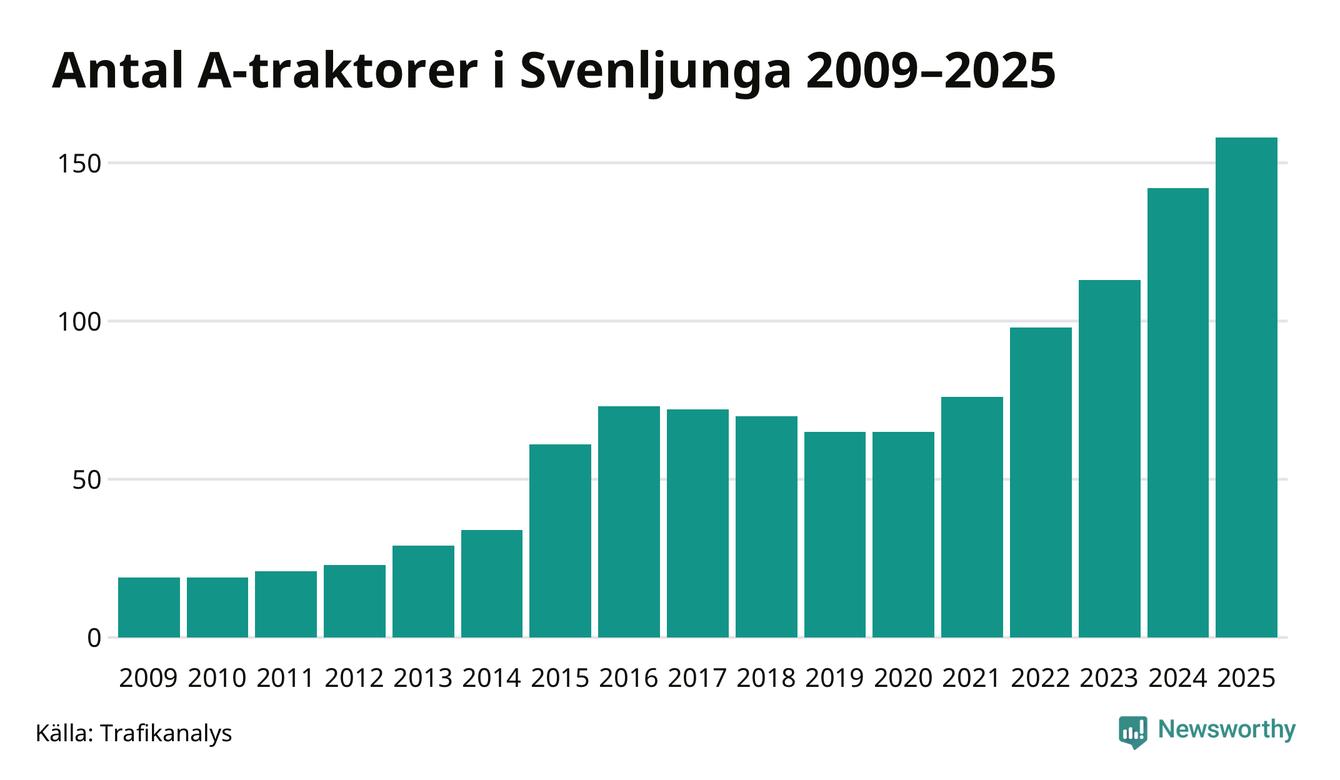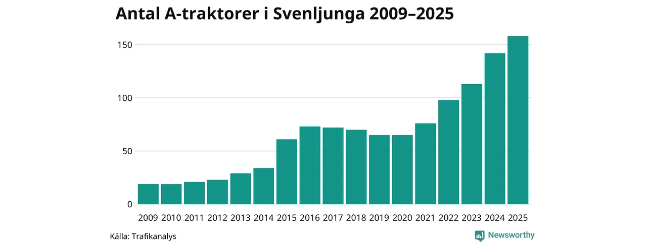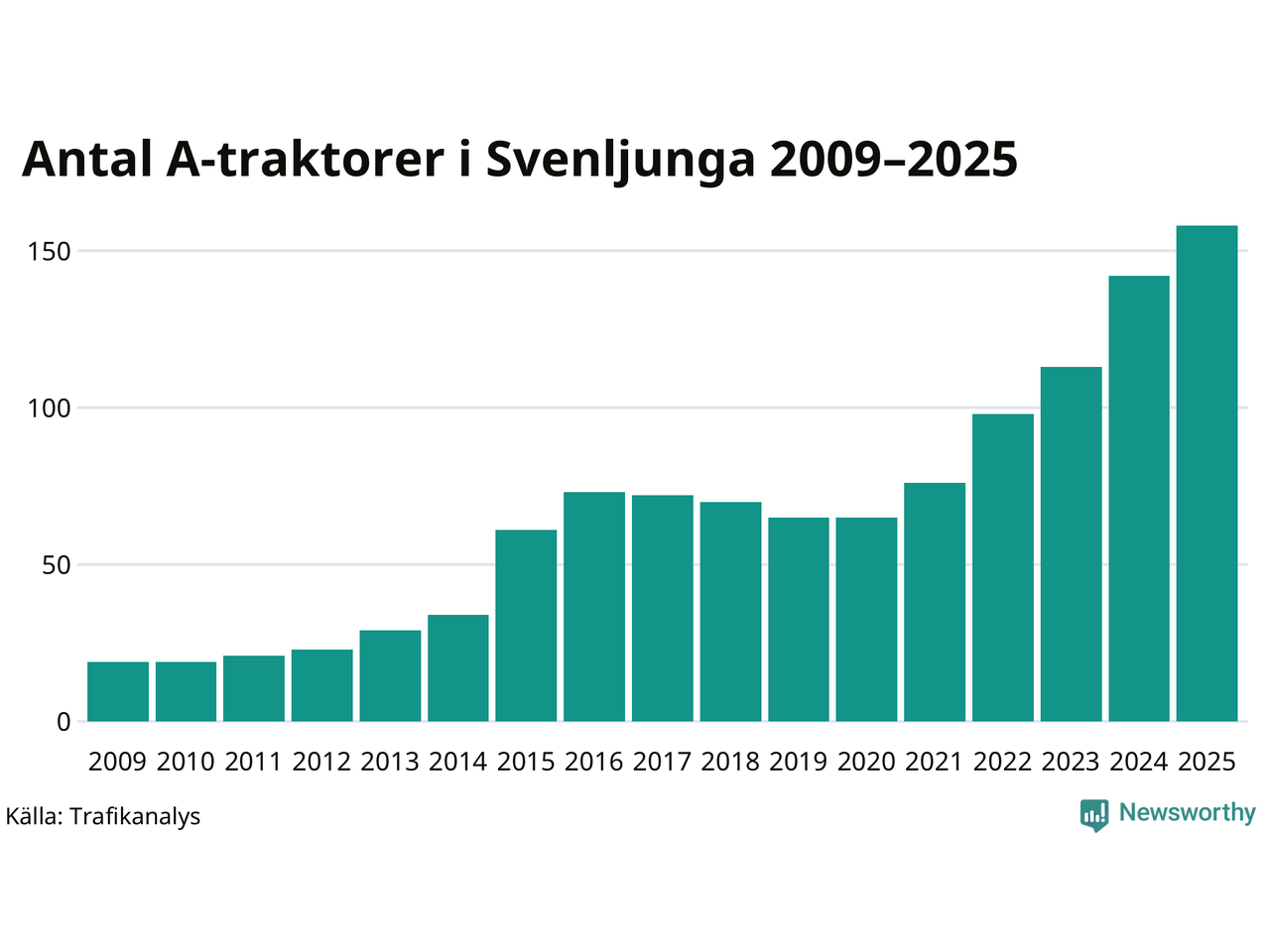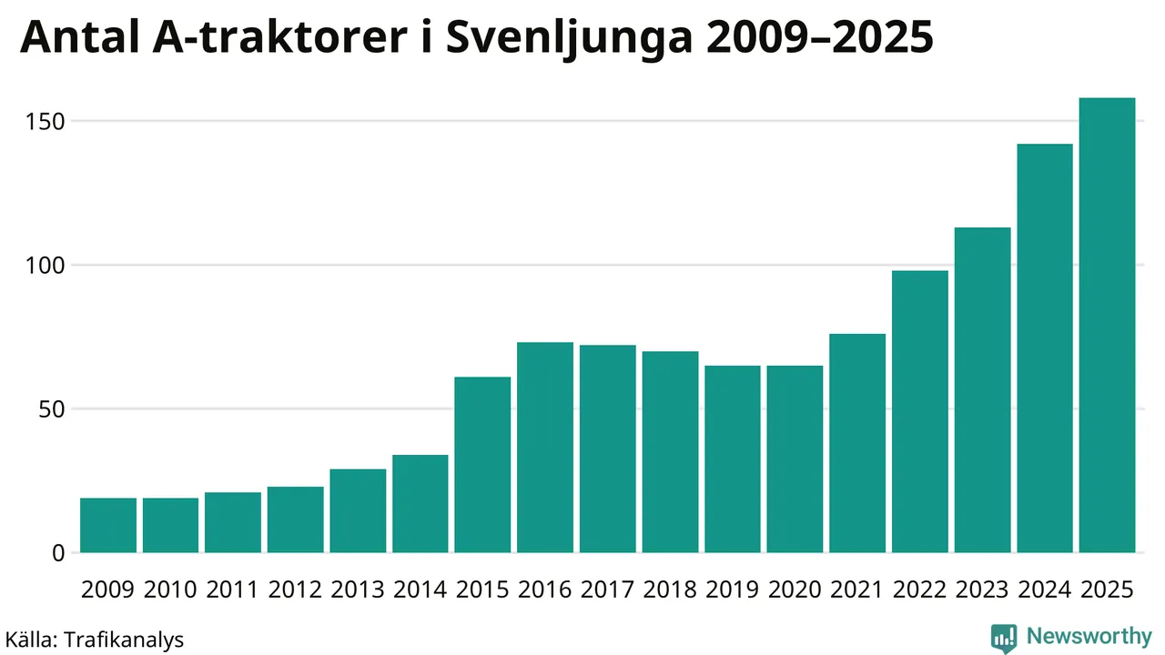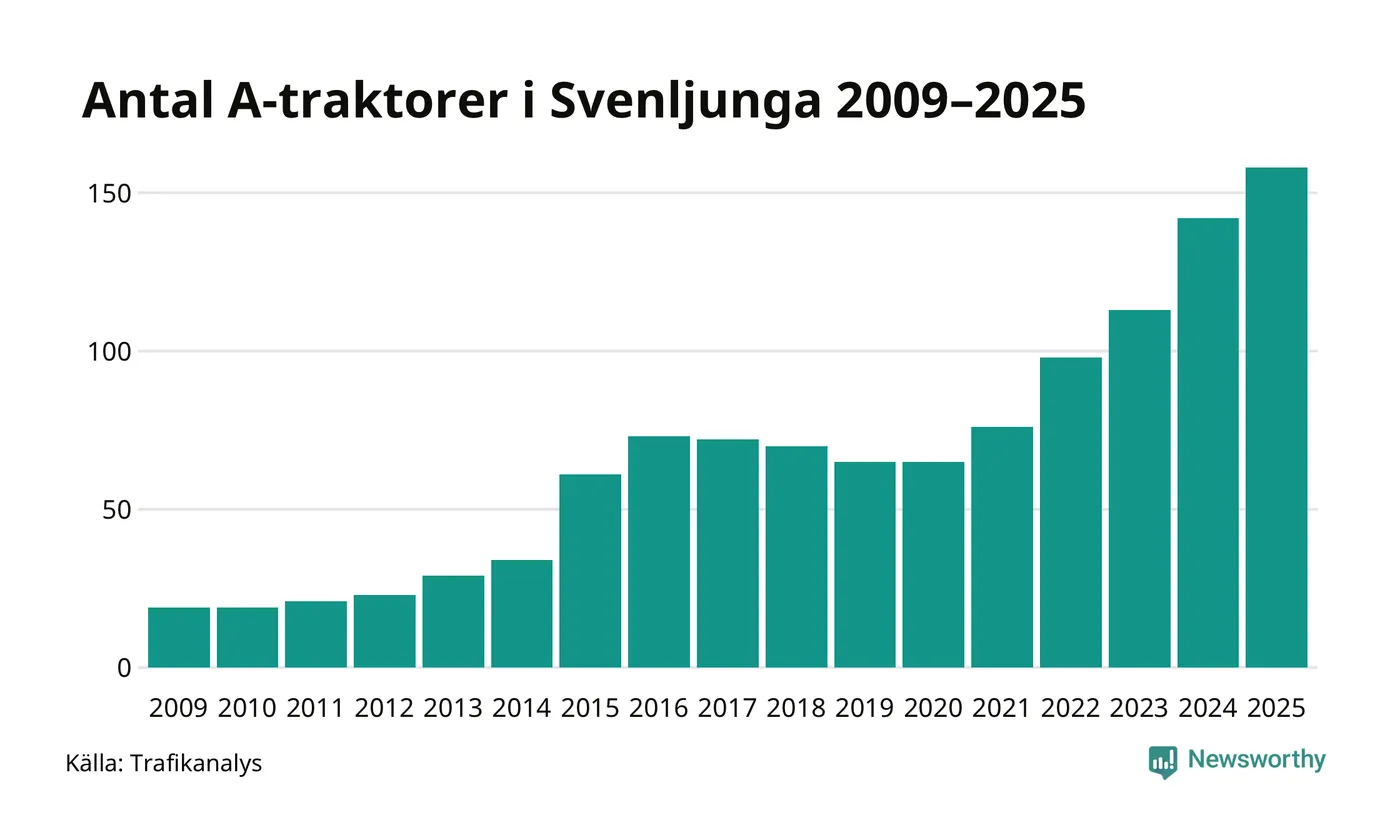 För femte året i rad ökar antalet A-traktorer i Svenljunga kommun, visar nya siffror från Trafikanalys. I slutet av 2025 fanns 158 A-traktorer registrerade i kommunen, vilket är 16 mer än året innan – en ökning med 11 procent. Inte sedan åtminstone 2009, som är det första året vi har statistik för, har det funnits så många A-traktorer i kommunen.
