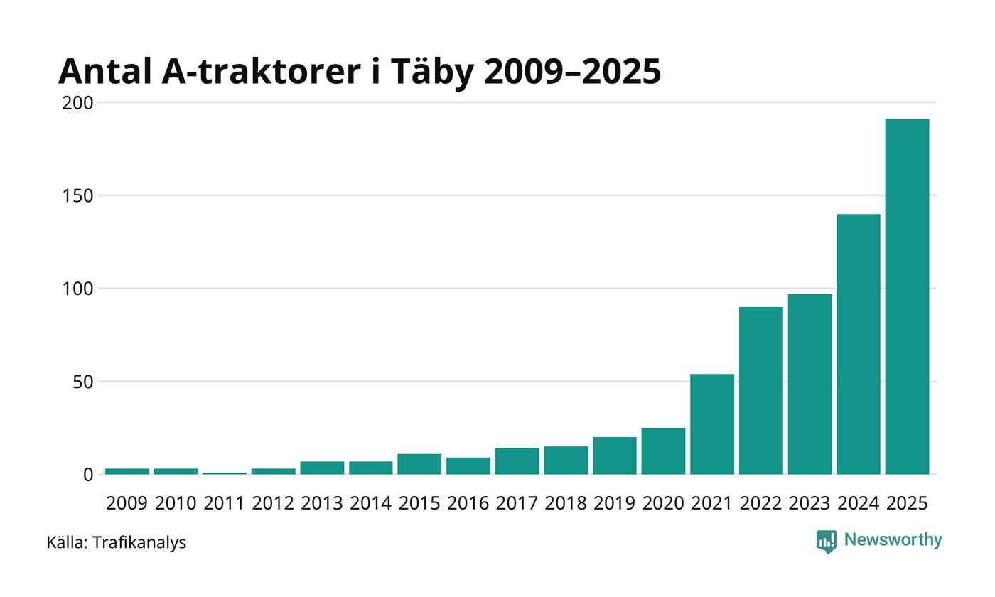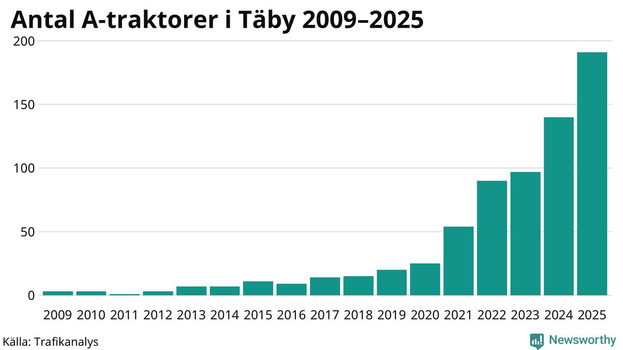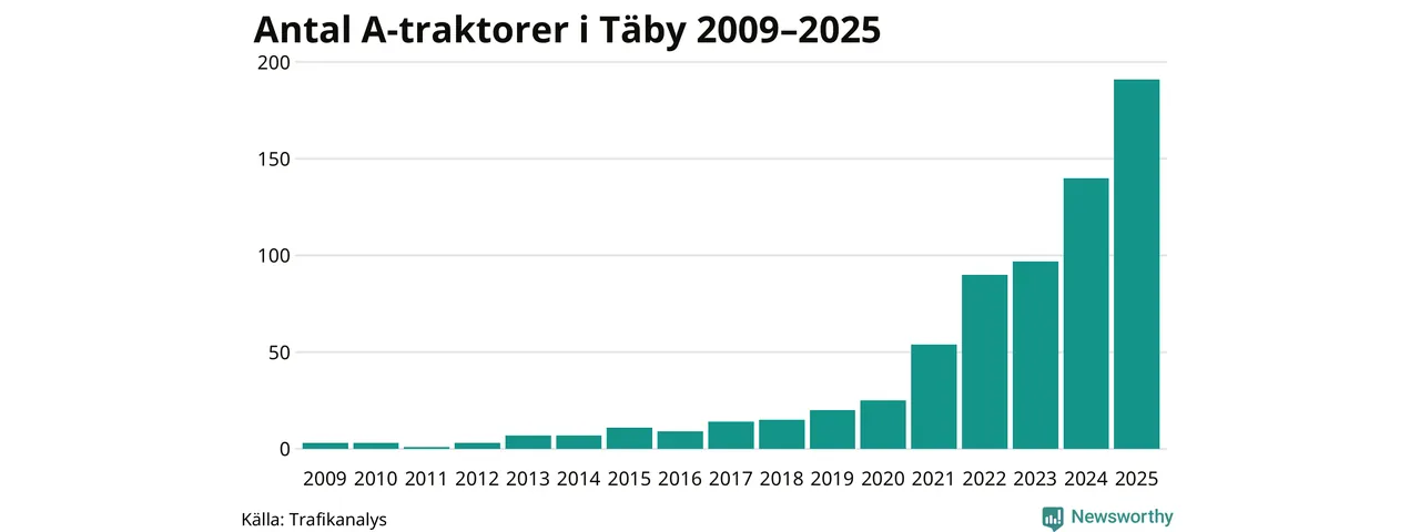 Under det senaste decenniet har antalet A-traktorer femdubblats i Sverige – och under 2025 fortsatte utvecklingen. Ökningen i Täby kommun är den största hittills.