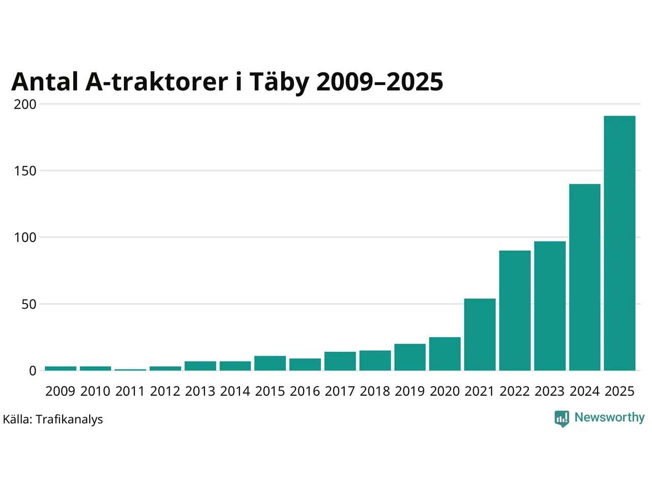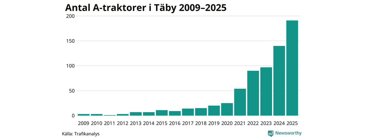 För nionde året i rad ökar antalet A-traktorer i Täby kommun, visar nya siffror från Trafikanalys. I slutet av 2025 fanns 191 A-traktorer registrerade i kommunen, vilket är 51 mer än året innan – en ökning med 36 procent. Ökningen är den största från ett år till ett annat någonsin i Täby kommun i absoluta tal.