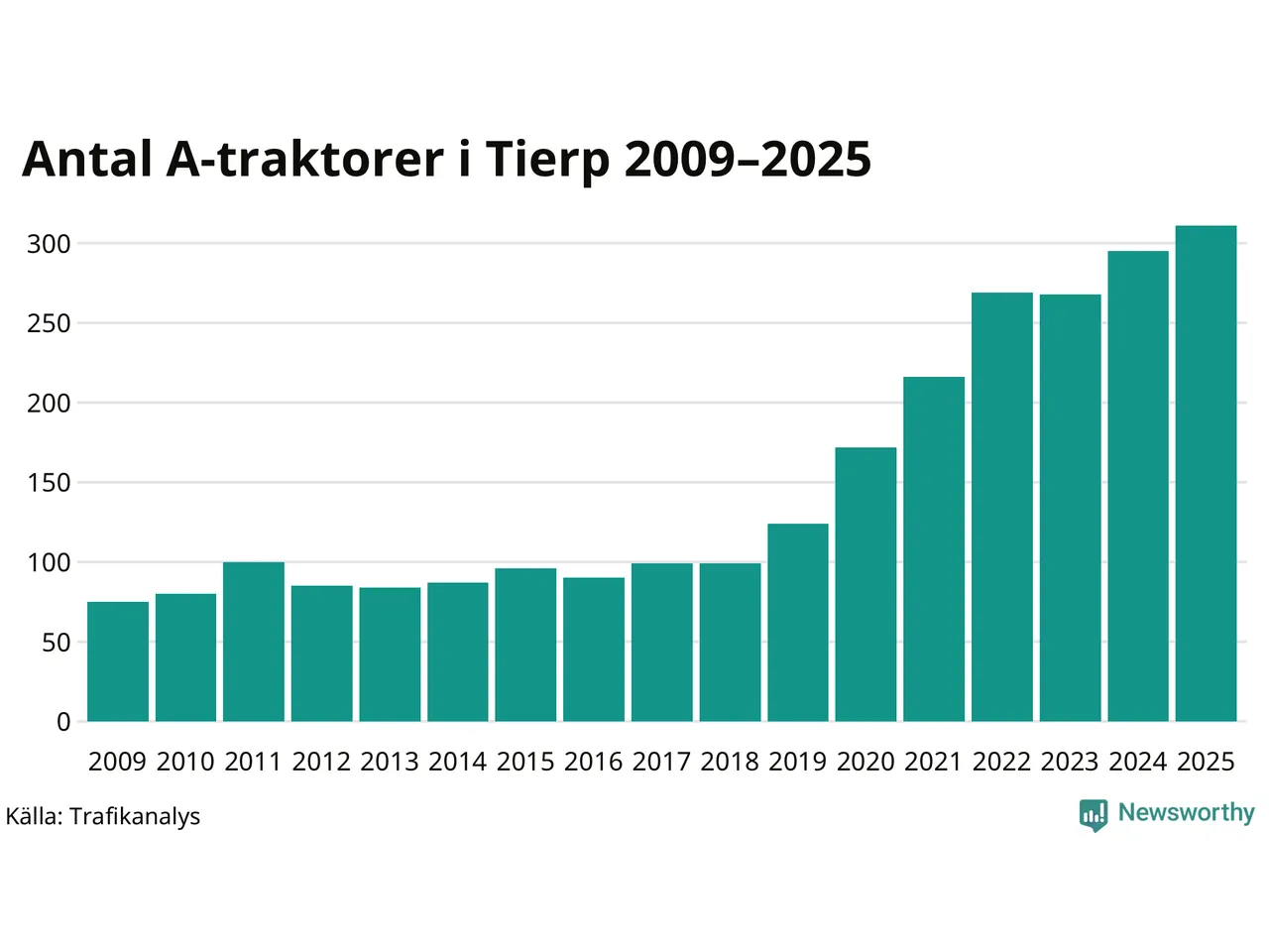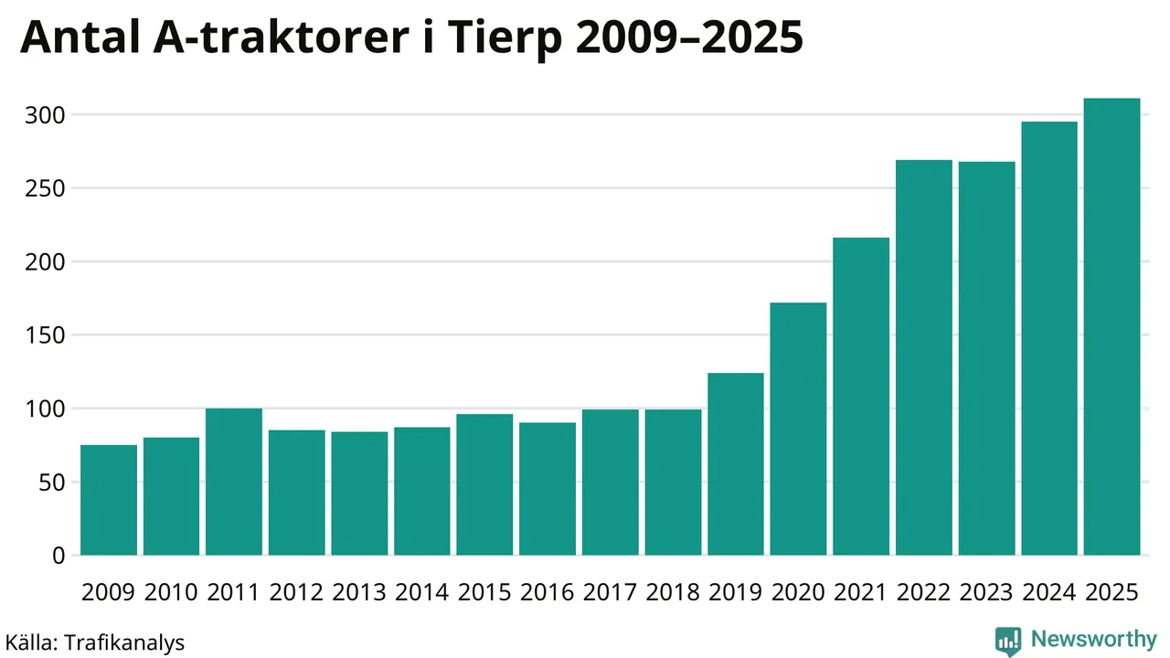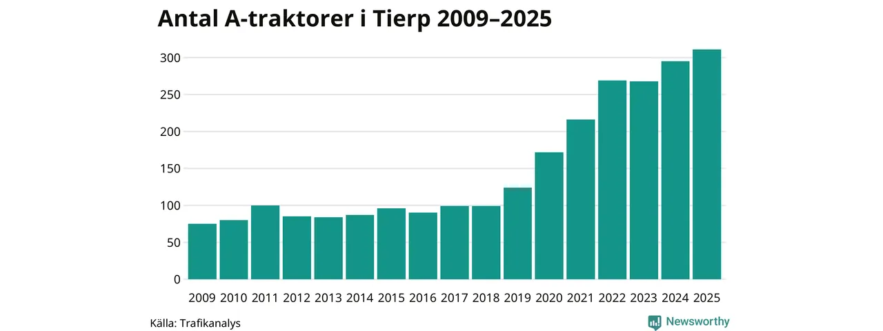 För andra året i rad ökar antalet A-traktorer i Tierps kommun, visar nya siffror från Trafikanalys. I slutet av 2025 fanns 311 A-traktorer registrerade i kommunen, vilket är 16 mer än året innan – en ökning med 5 procent. Det visar nya siffror från Trafikanalys. Inte sedan åtminstone 2009, som är det första året vi har statistik för, har det funnits så många A-traktorer i kommunen.