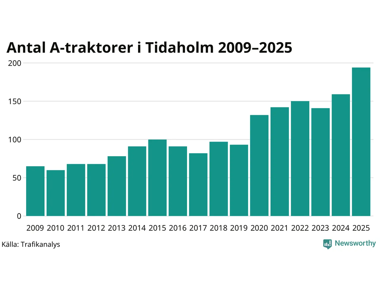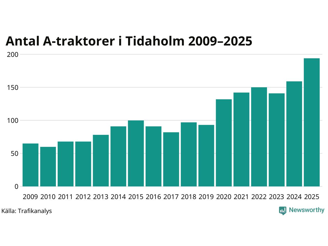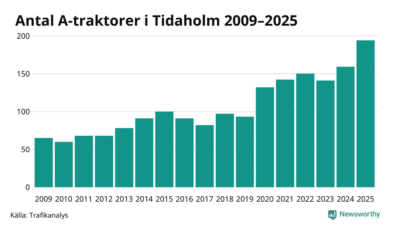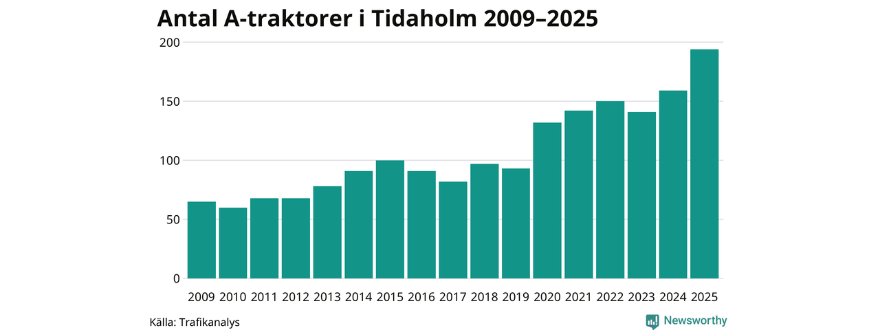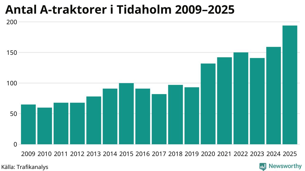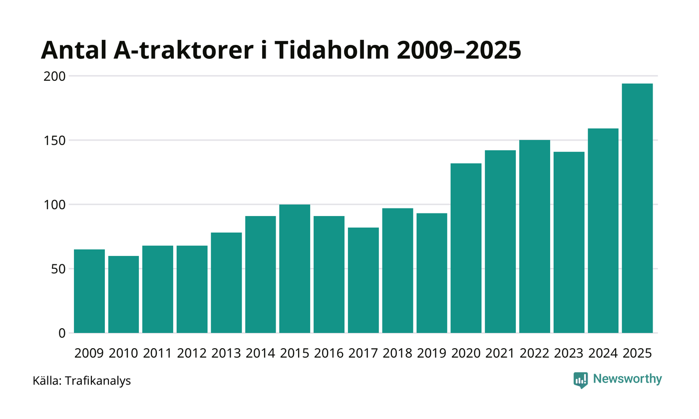 För andra året i rad ökar antalet A-traktorer i Tidaholms kommun, visar nya siffror från Trafikanalys. I slutet av 2025 fanns 194 A-traktorer registrerade i kommunen, vilket är 35 mer än året innan – en ökning med 22 procent. Det visar nya siffror från Trafikanalys. Inte sedan åtminstone 2009, som är det första året vi har statistik för, har det funnits så många A-traktorer i kommunen.