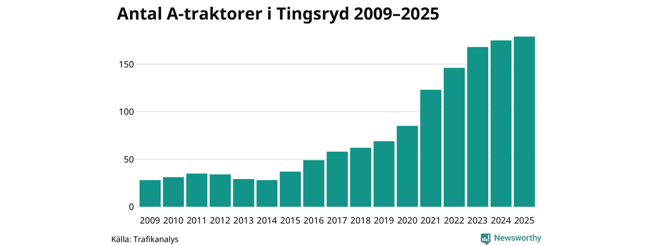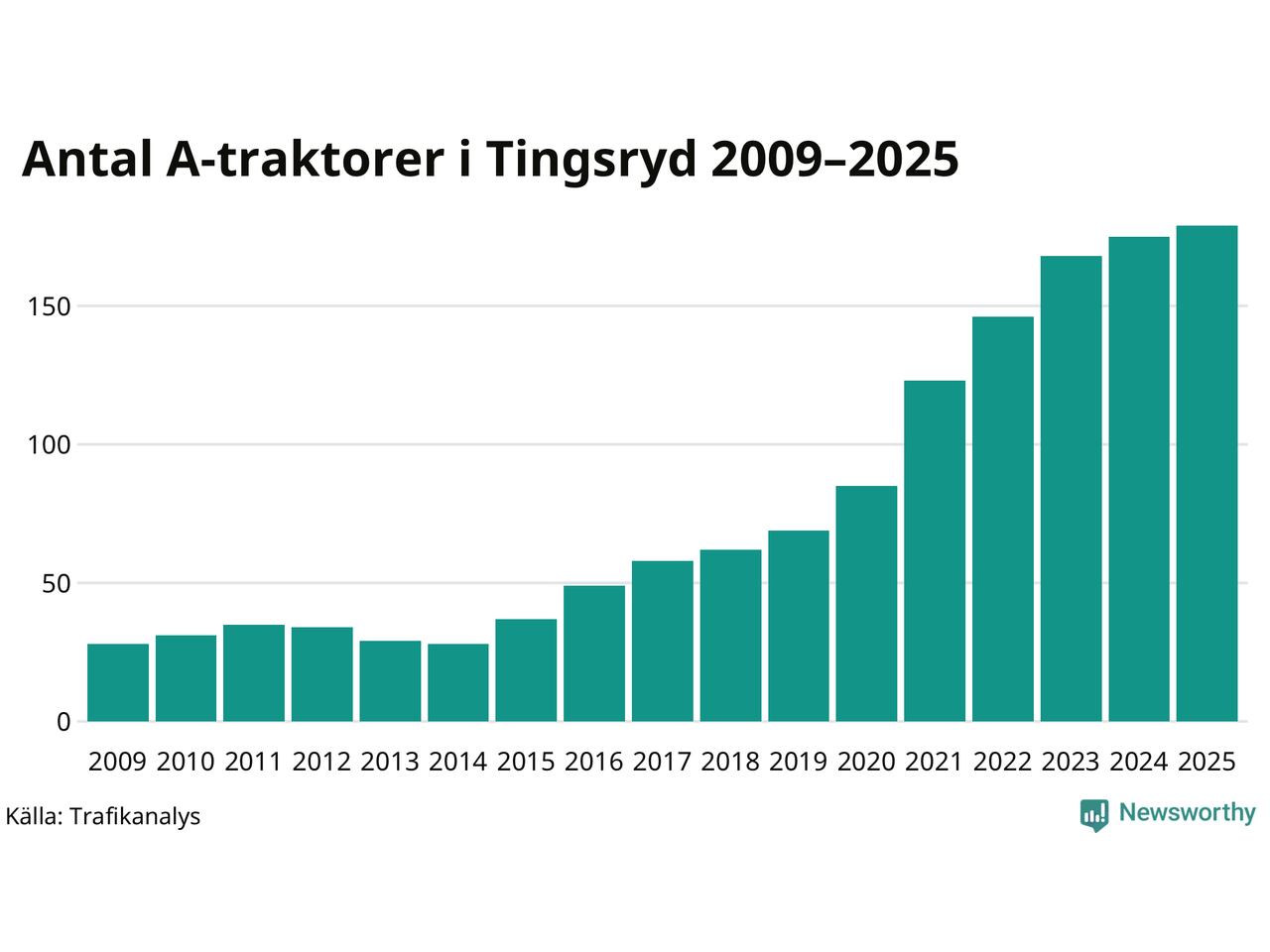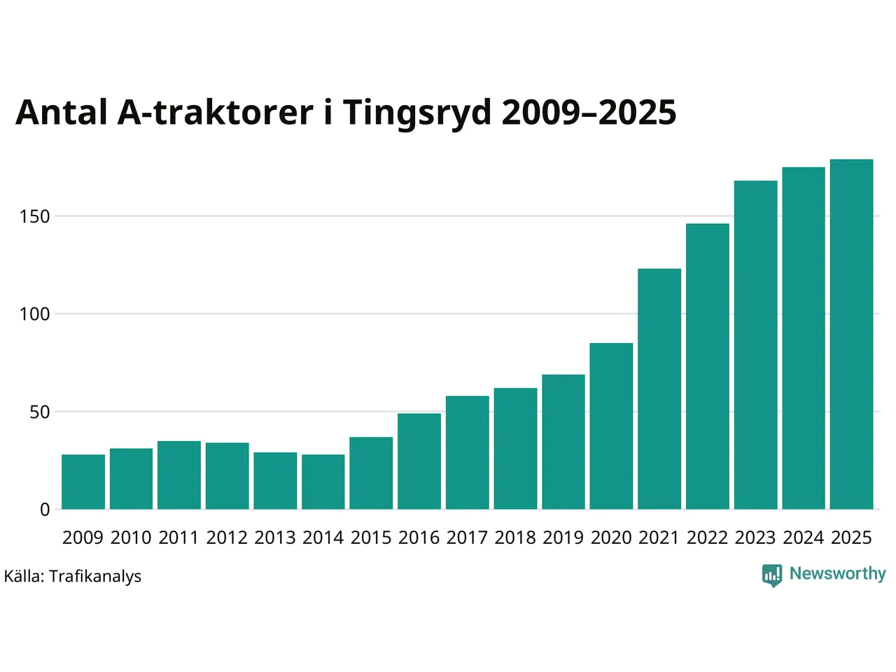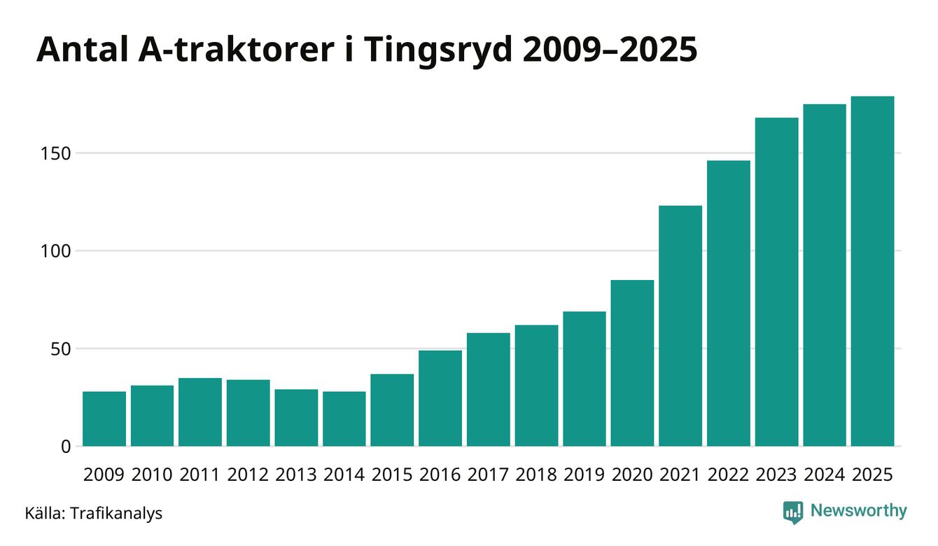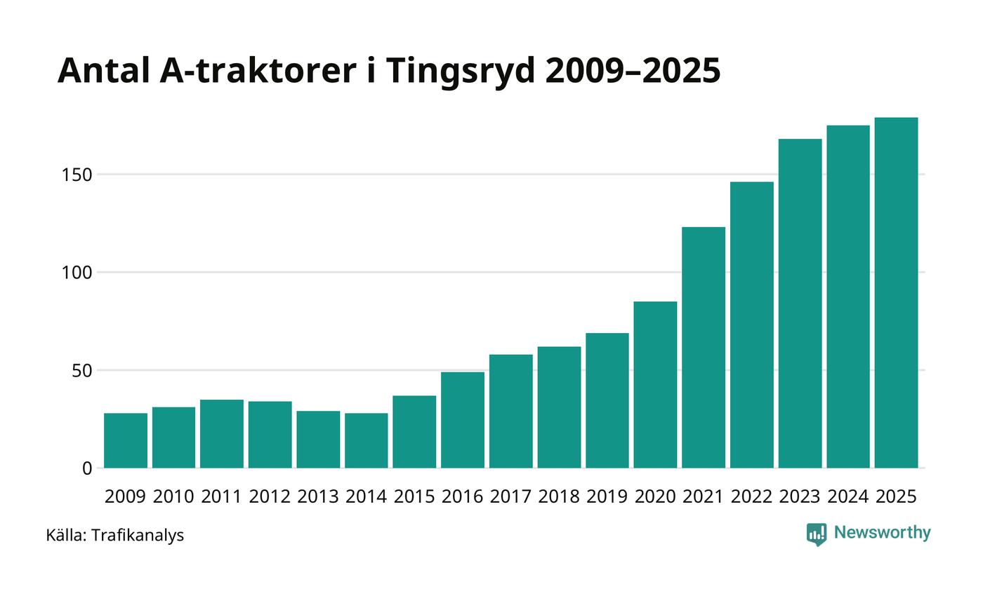 För elfte året i rad ökar antalet A-traktorer i Tingsryds kommun, visar nya siffror från Trafikanalys. I slutet av 2025 fanns 179 A-traktorer registrerade i kommunen, vilket är fyra mer än året innan. Inte sedan åtminstone 2009, som är det första året vi har statistik för, har det funnits så många A-traktorer i kommunen.