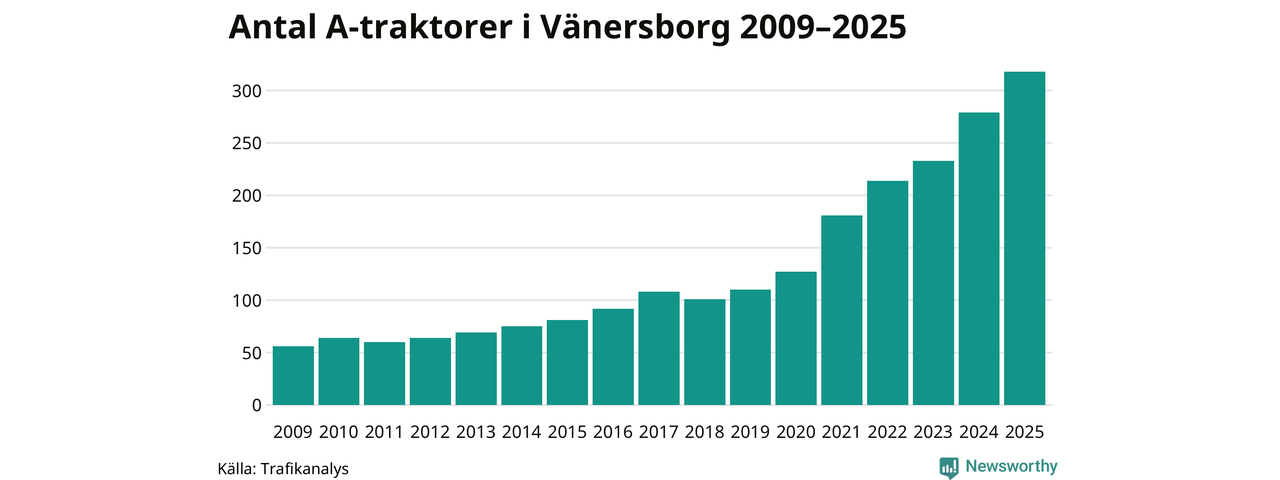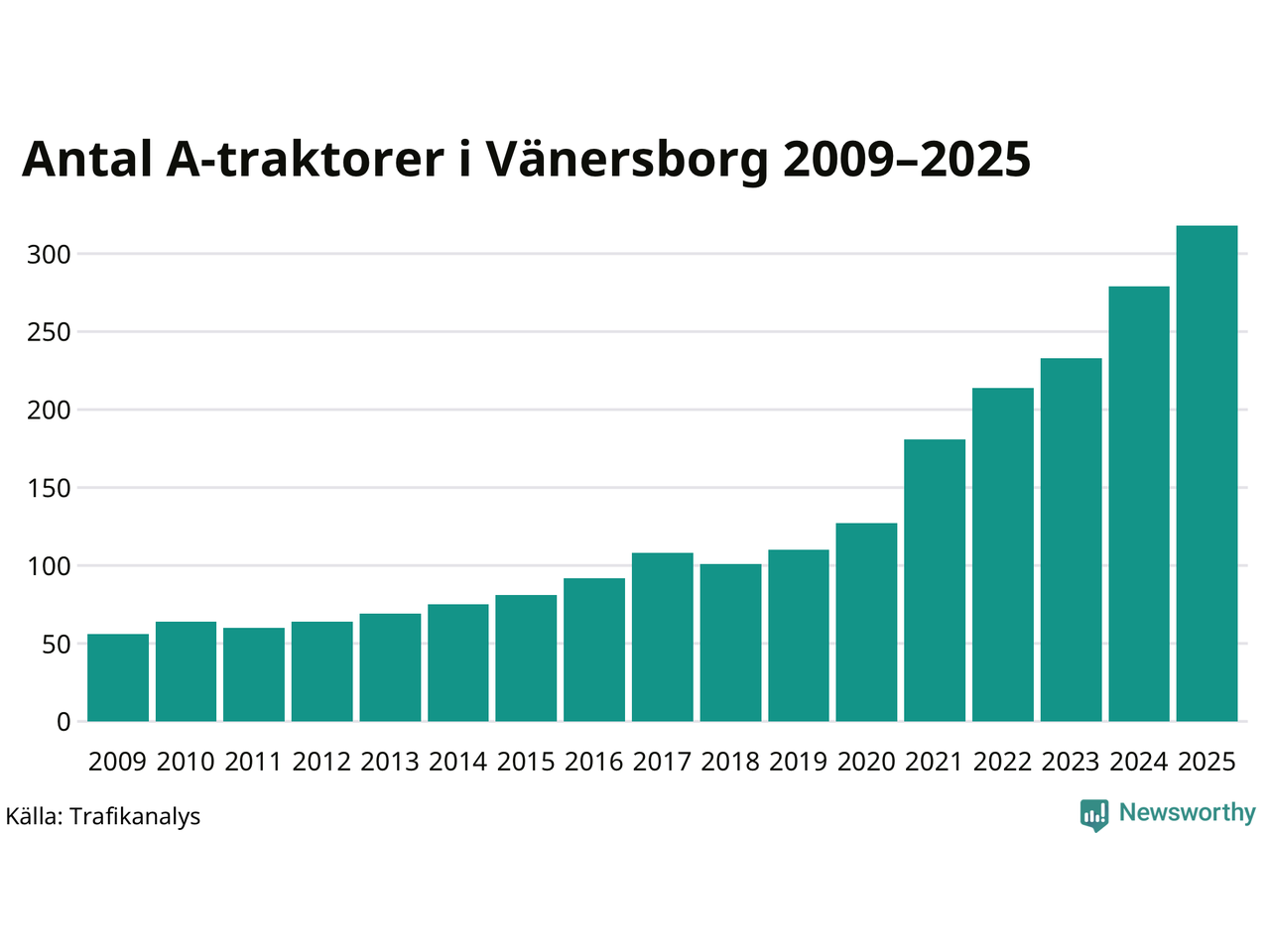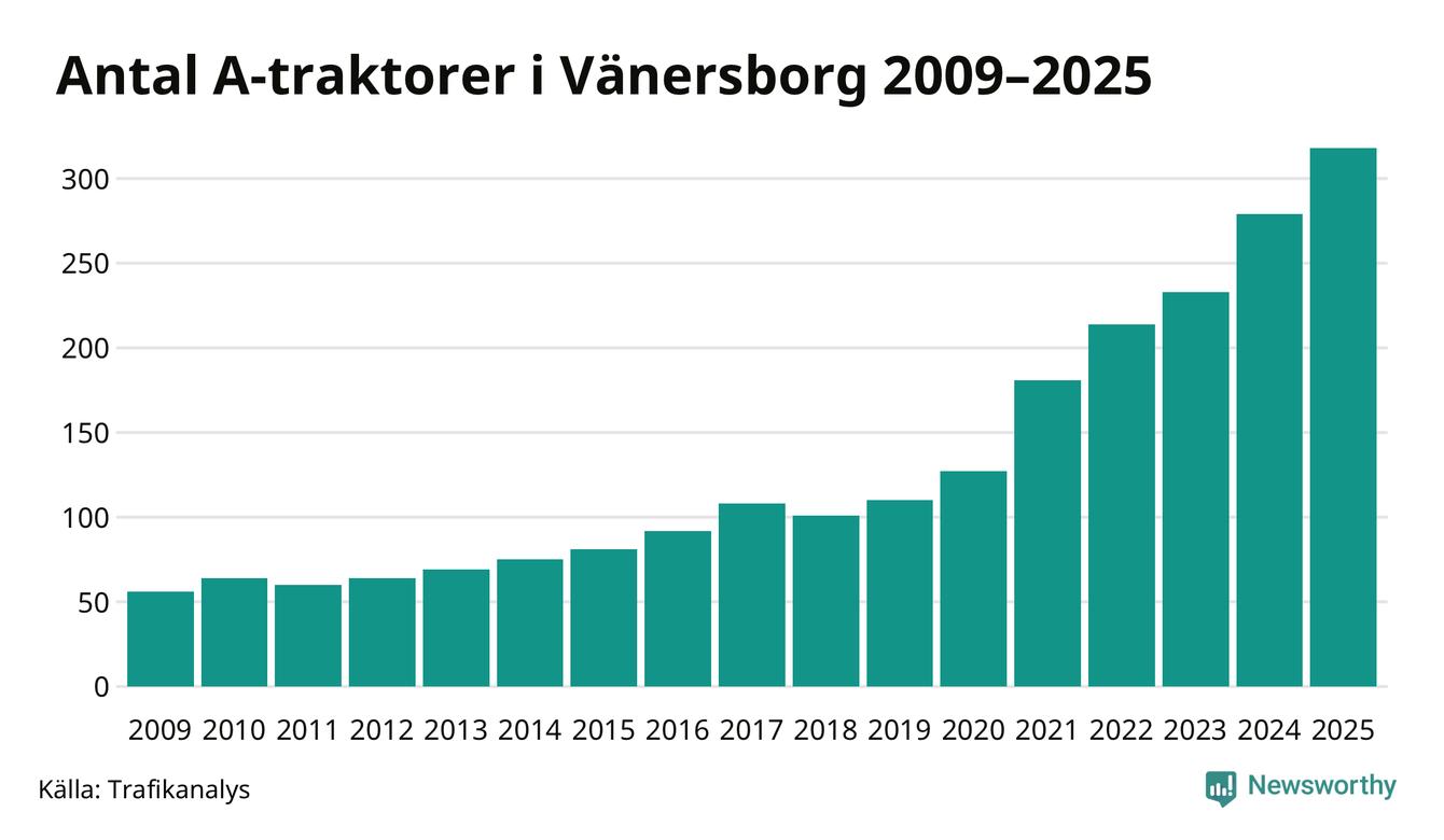 För sjunde året i rad ökar antalet A-traktorer i Vänersborgs kommun, visar nya siffror från Trafikanalys. I slutet av 2025 fanns 318 A-traktorer registrerade i kommunen, vilket är 39 mer än året innan – en ökning med 14 procent. Inte sedan åtminstone 2009, som är det första året vi har statistik för, har det funnits så många A-traktorer i kommunen.
