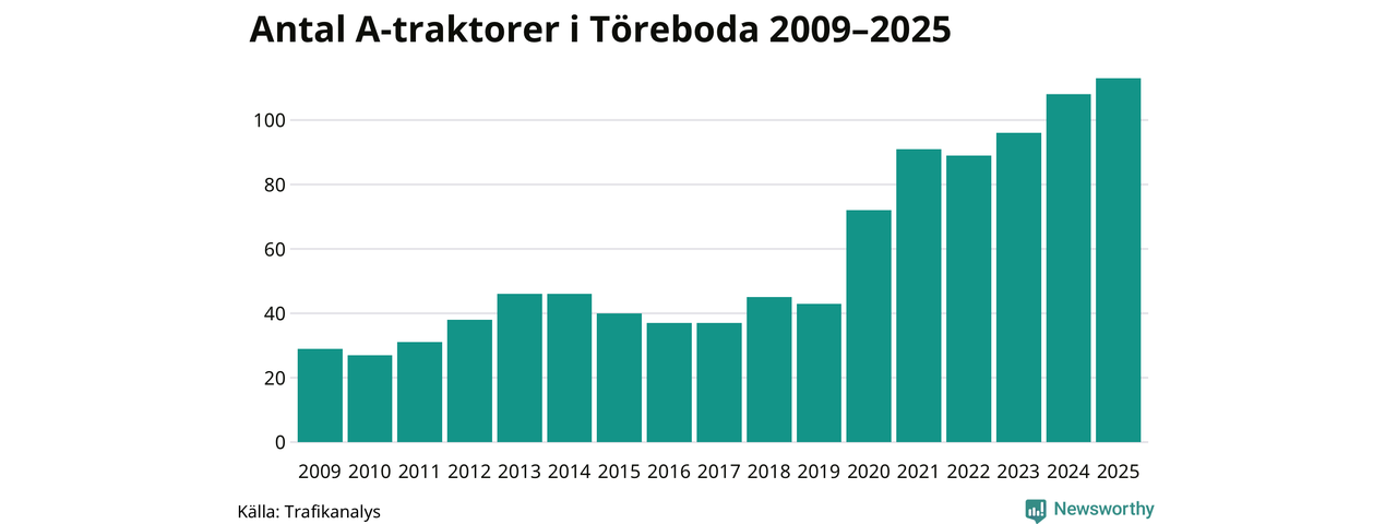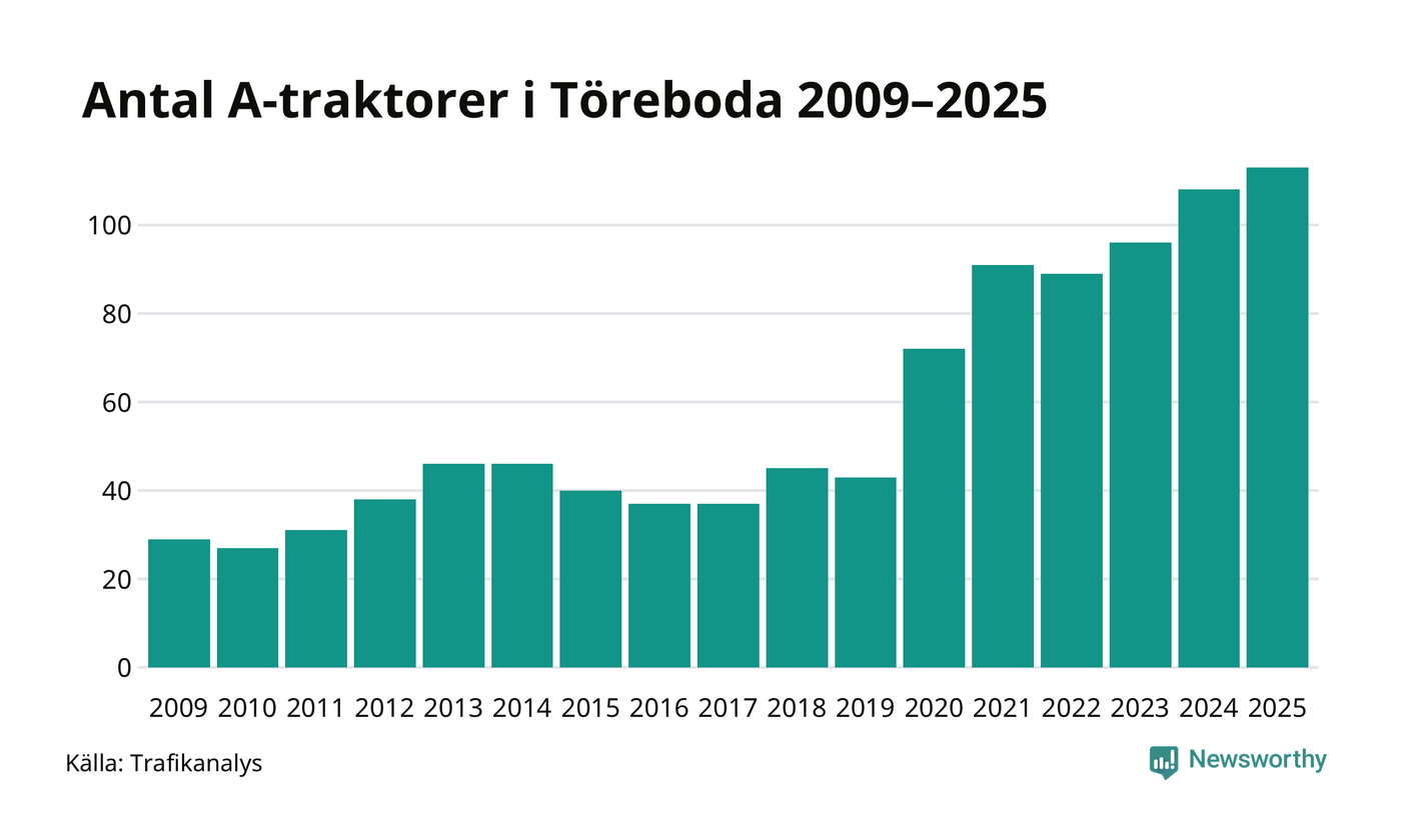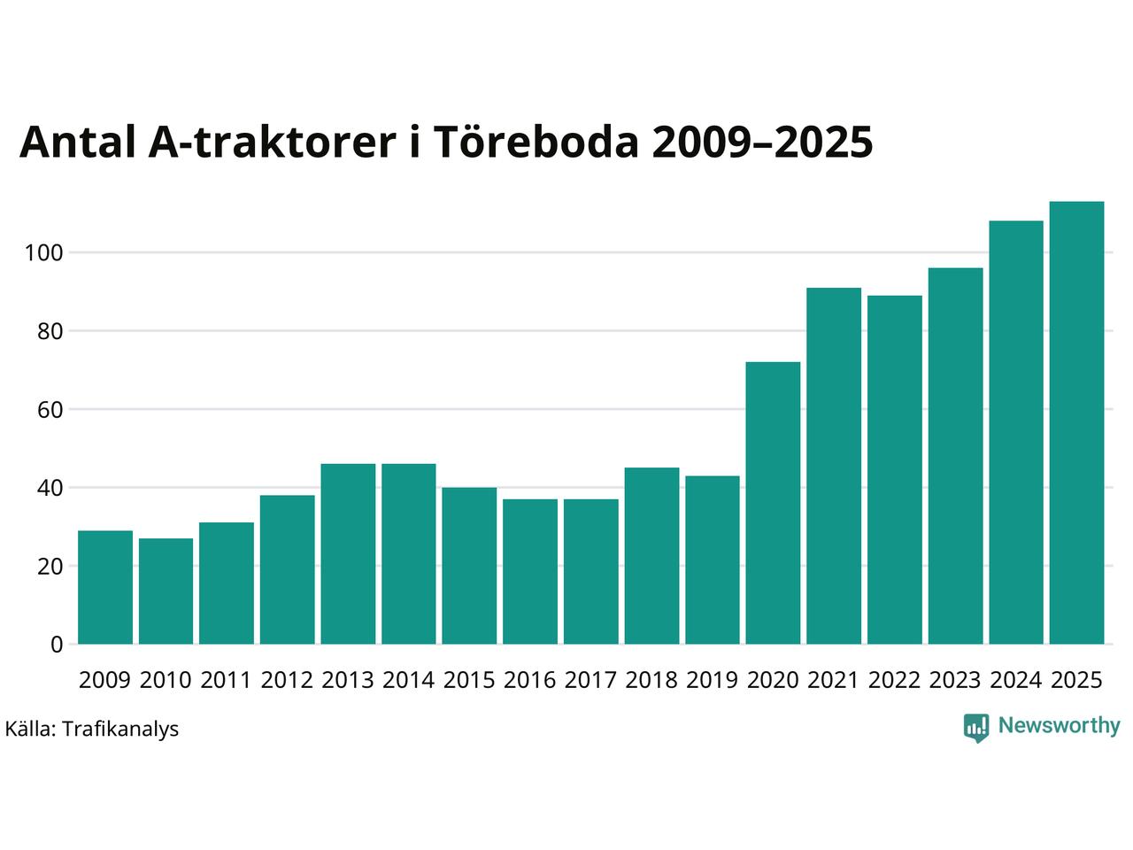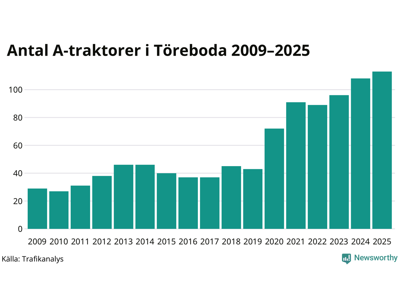 För tredje året i rad ökar antalet A-traktorer i Töreboda kommun, visar nya siffror från Trafikanalys. I slutet av 2025 fanns 113 A-traktorer registrerade i kommunen, vilket är fem mer än året innan. Det visar nya siffror från Trafikanalys. Inte sedan åtminstone 2009, som är det första året vi har statistik för, har det funnits så många A-traktorer i kommunen.