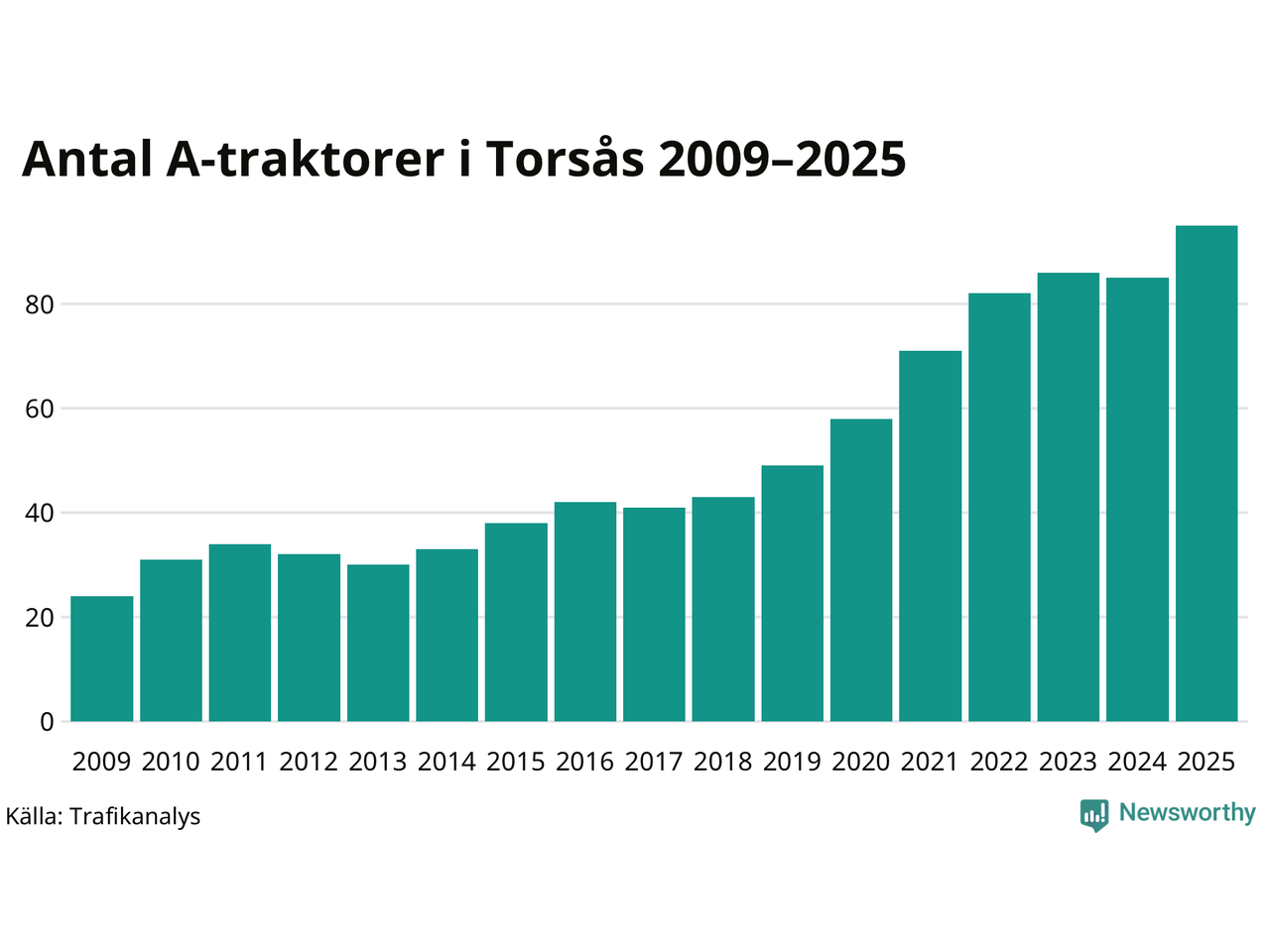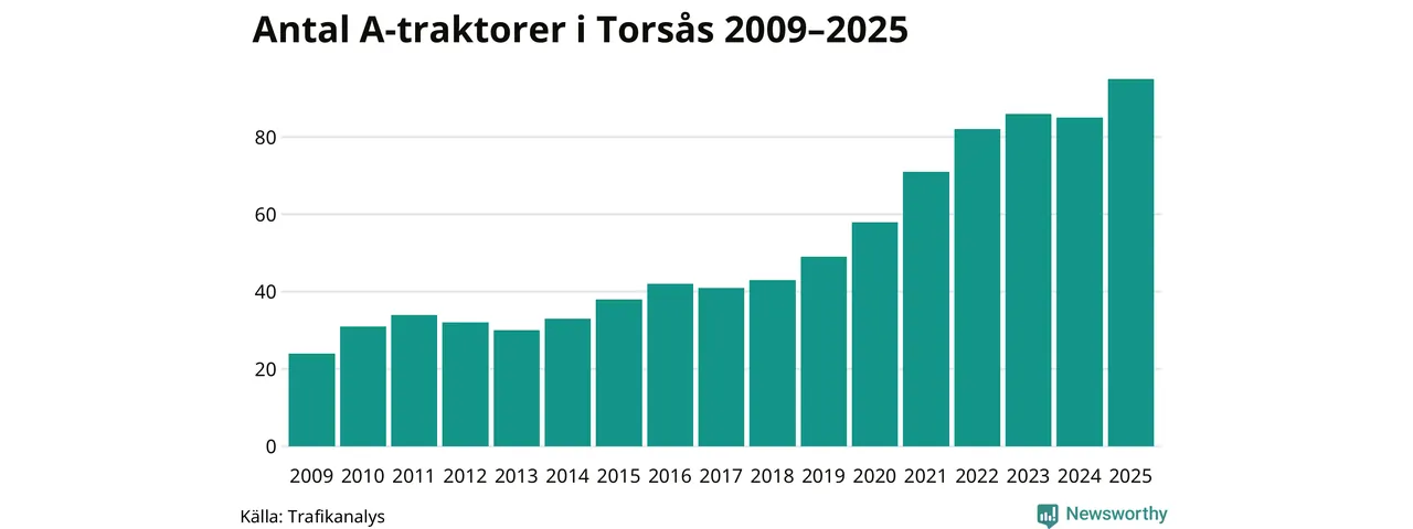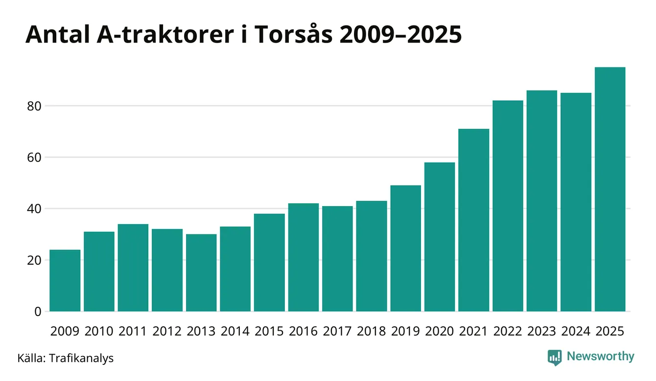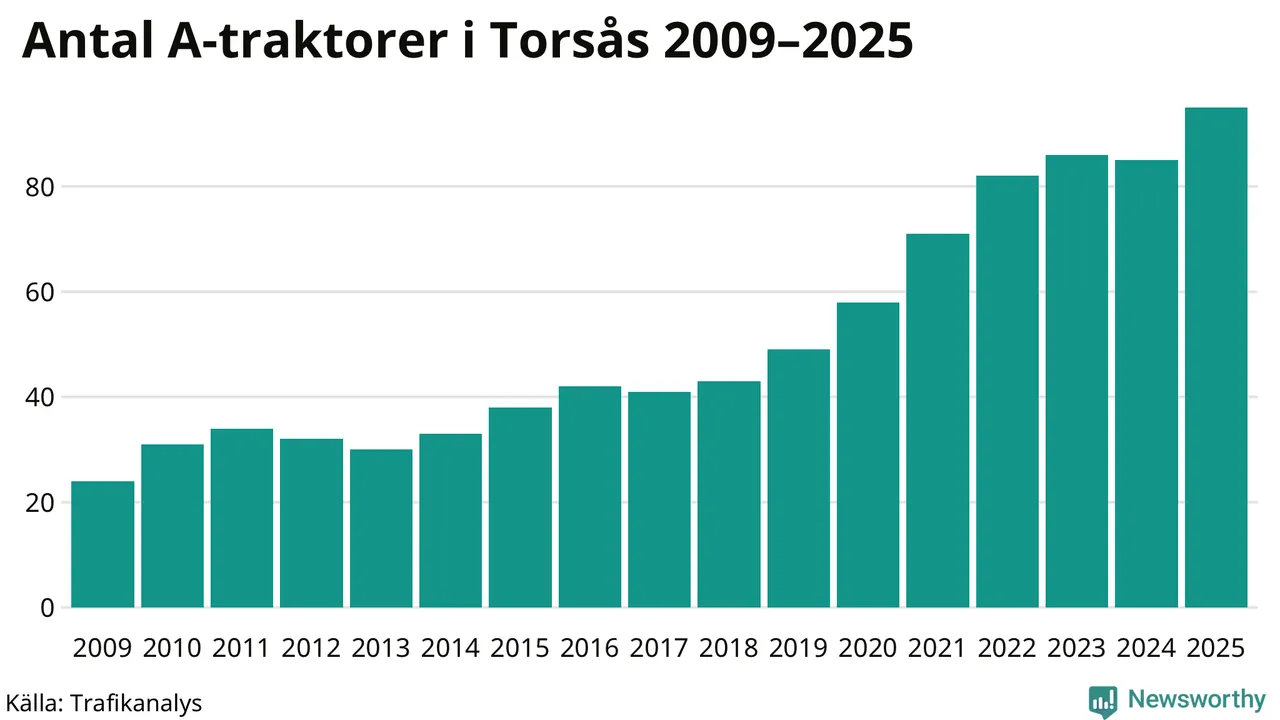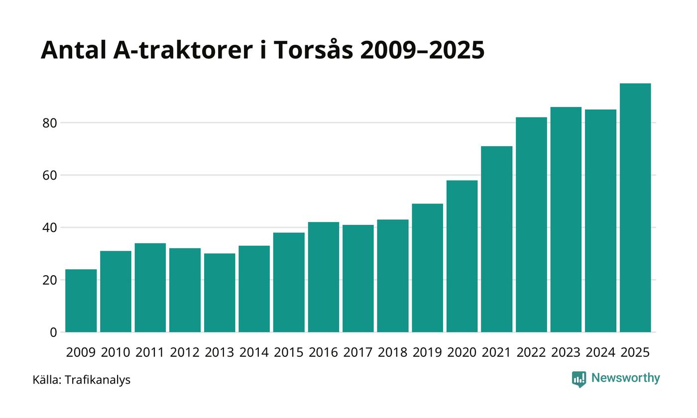 I slutet av 2025 fanns 95 A-traktorer registrerade i kommunen, vilket är tio mer än året innan – en ökning med 12 procent. Det visar nya siffror från Trafikanalys. Inte sedan åtminstone 2009, som är det första året vi har statistik för, har det funnits så många A-traktorer i kommunen.