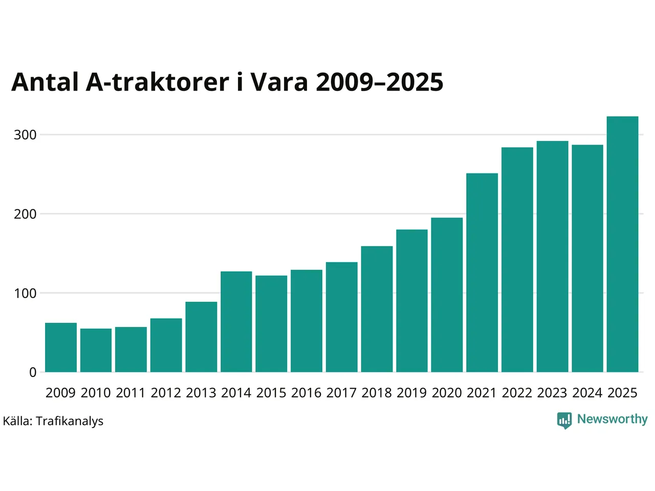 I slutet av 2025 fanns 323 A-traktorer registrerade i kommunen, vilket är 36 mer än året innan – en ökning med 13 procent. Det visar nya siffror från Trafikanalys. Inte sedan åtminstone 2009, som är det första året vi har statistik för, har det funnits så många A-traktorer i kommunen.