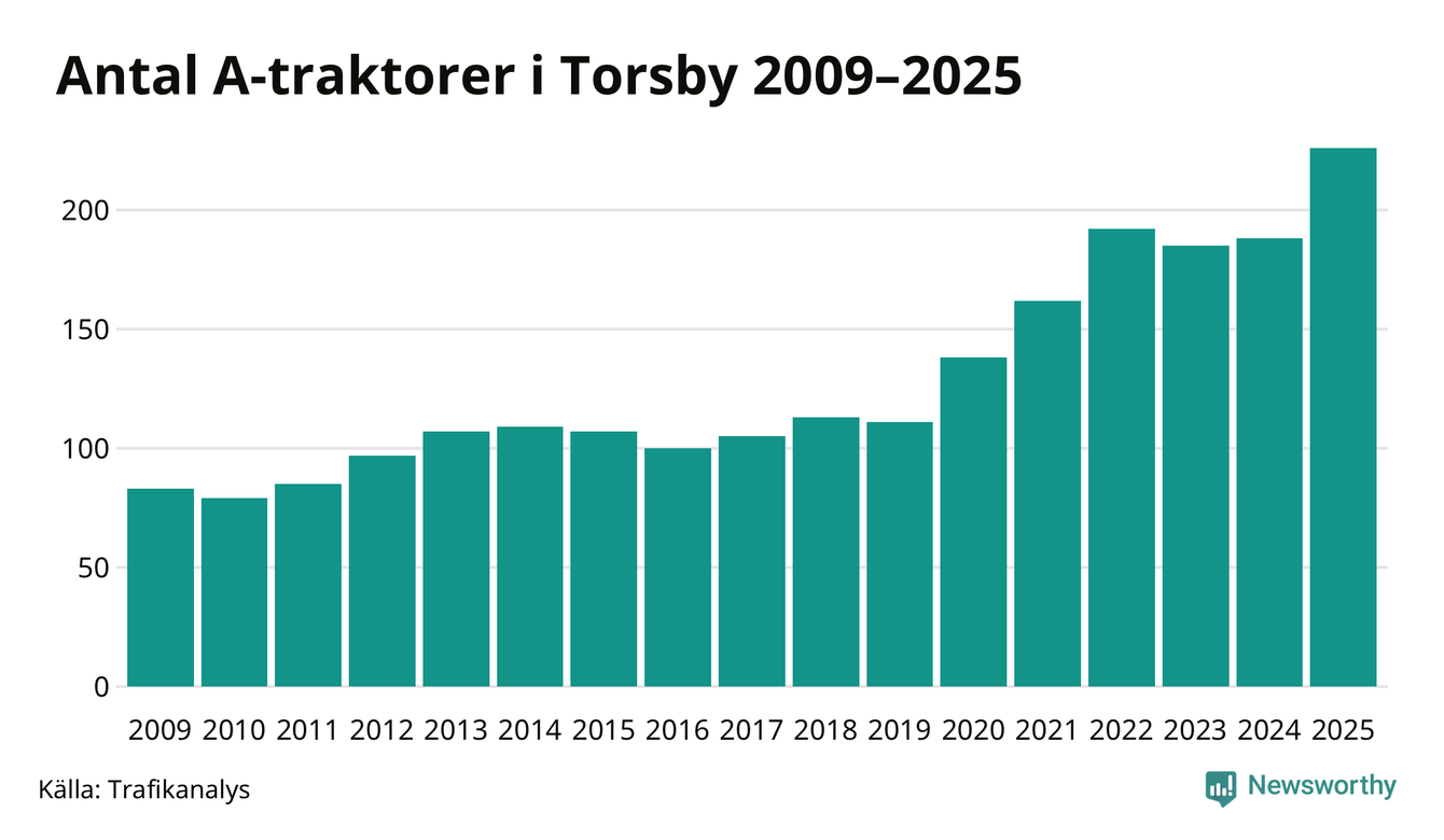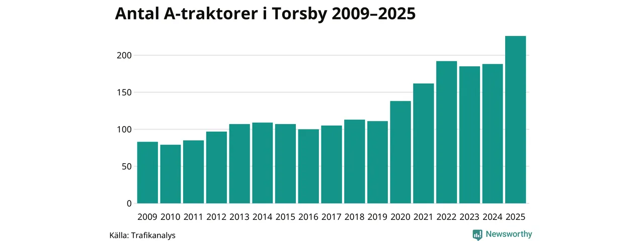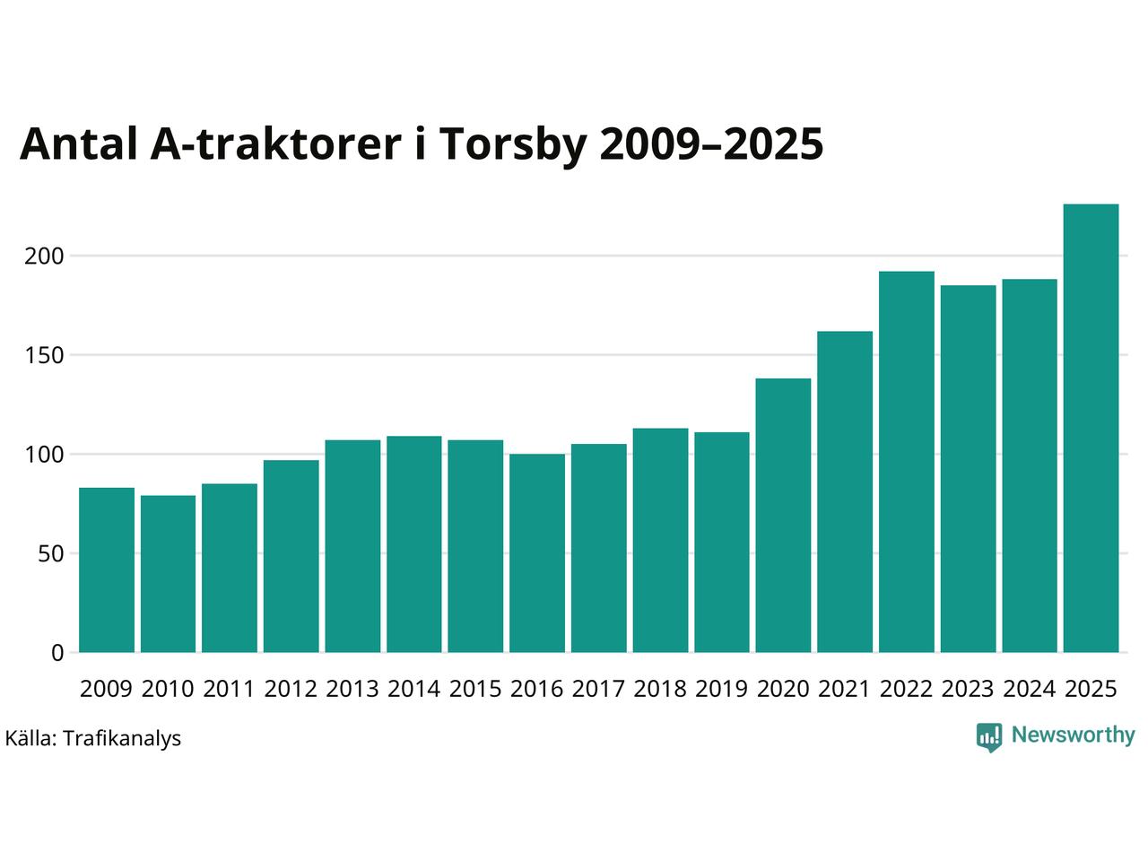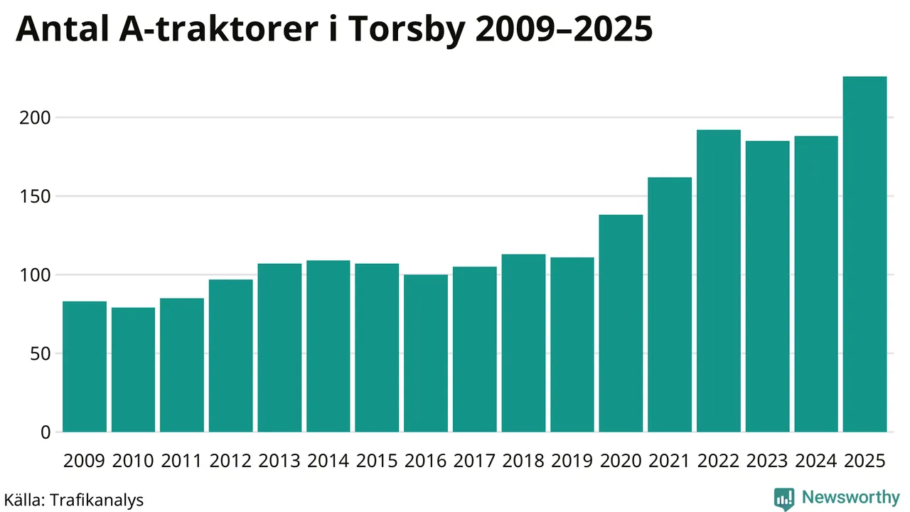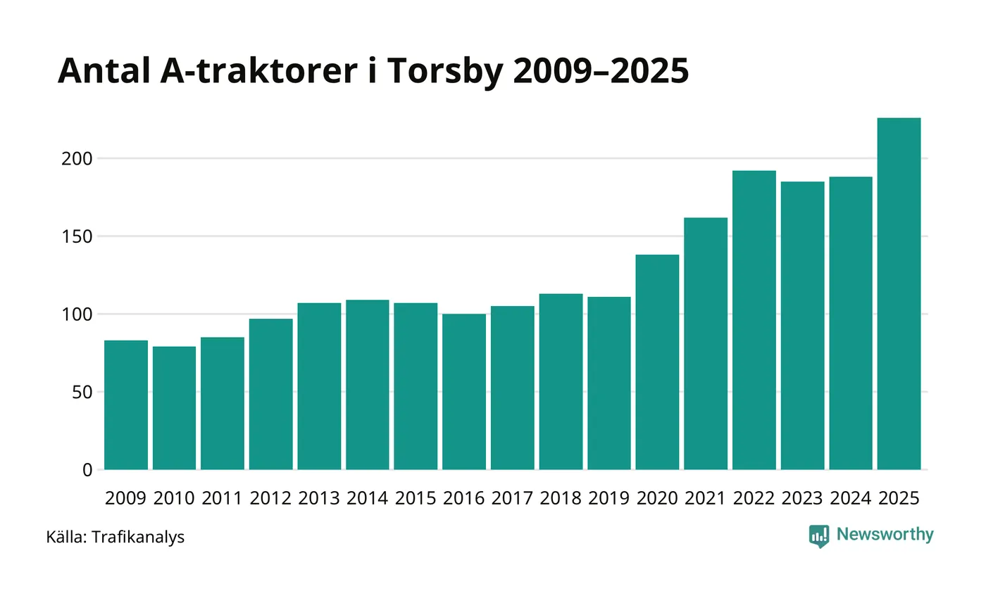 För andra året i rad ökar antalet A-traktorer i Torsby kommun, visar nya siffror från Trafikanalys. I slutet av 2025 fanns 226 A-traktorer registrerade i kommunen, vilket är 38 mer än året innan – en ökning med 20 procent. Det visar nya siffror från Trafikanalys. Ökningen är den största från ett år till ett annat någonsin i Torsby kommun i absoluta tal och den största ökningen i Värmlands län i år.