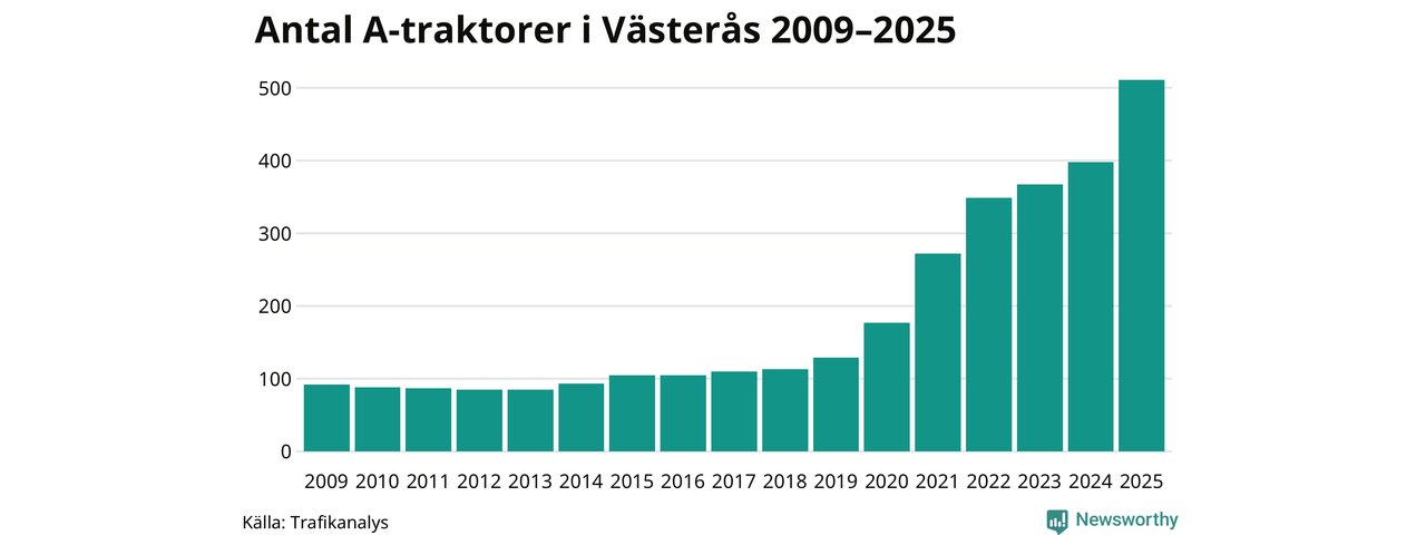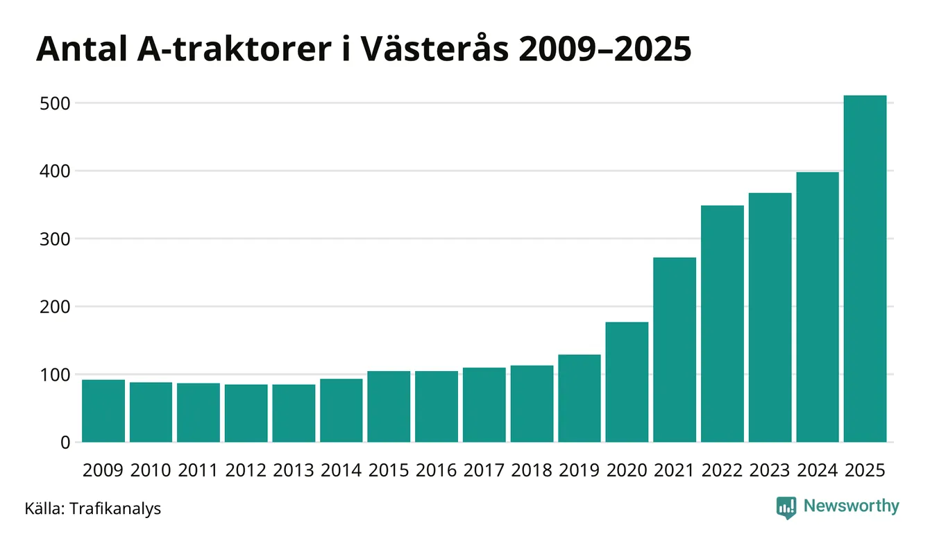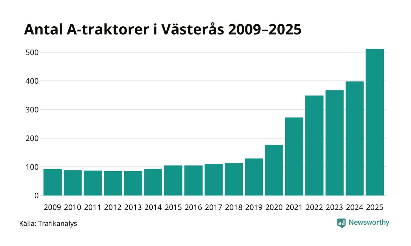För nionde året i rad ökar antalet A-traktorer i Västerås kommun, visar nya siffror från Trafikanalys. I slutet av 2025 fanns 511 A-traktorer registrerade i kommunen, vilket är 113 mer än året innan – en ökning med 28 procent. Ökningen är den största från ett år till ett annat någonsin i Västerås kommun i absoluta tal och den största ökningen i Västmanlands län i år.