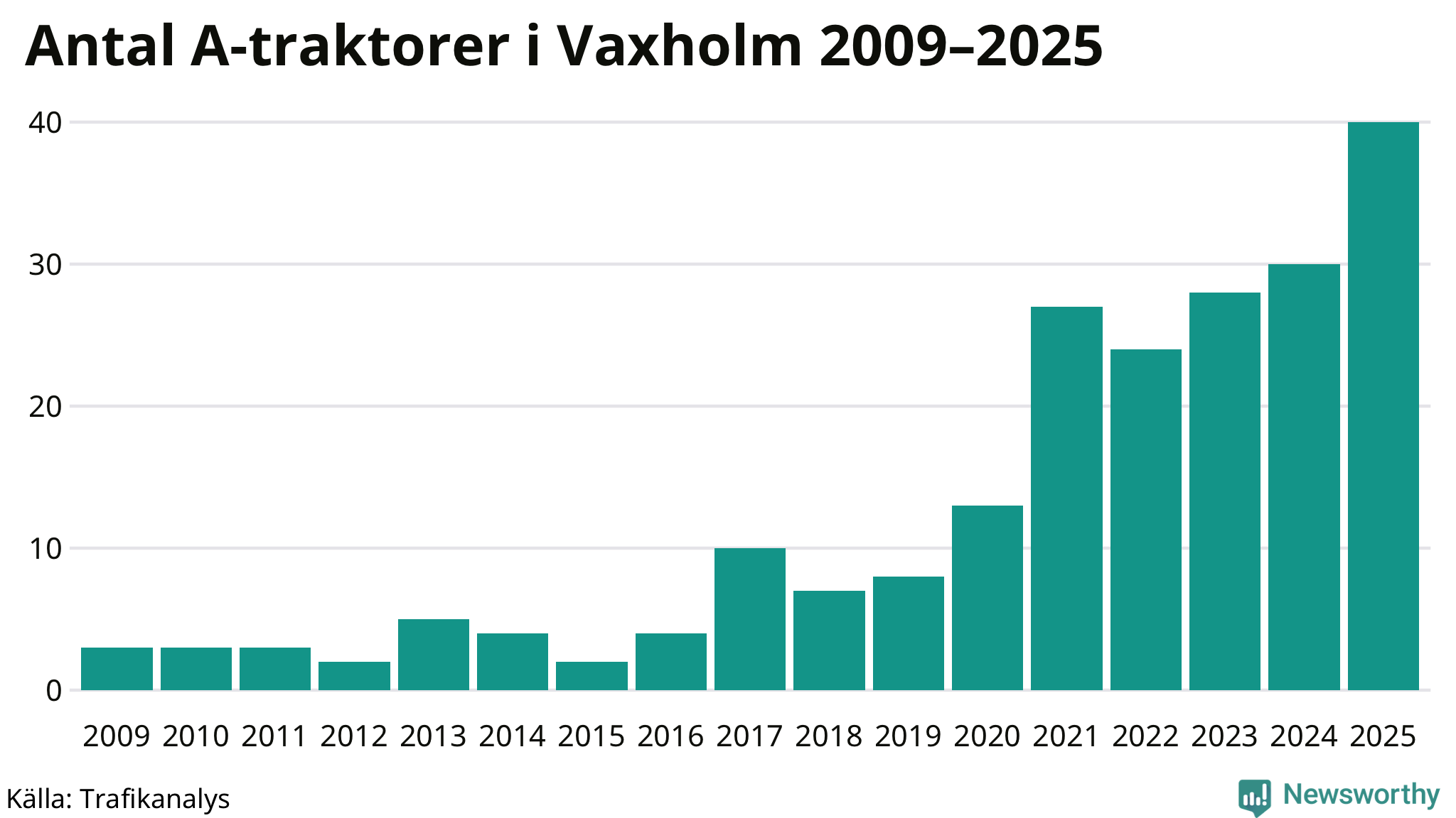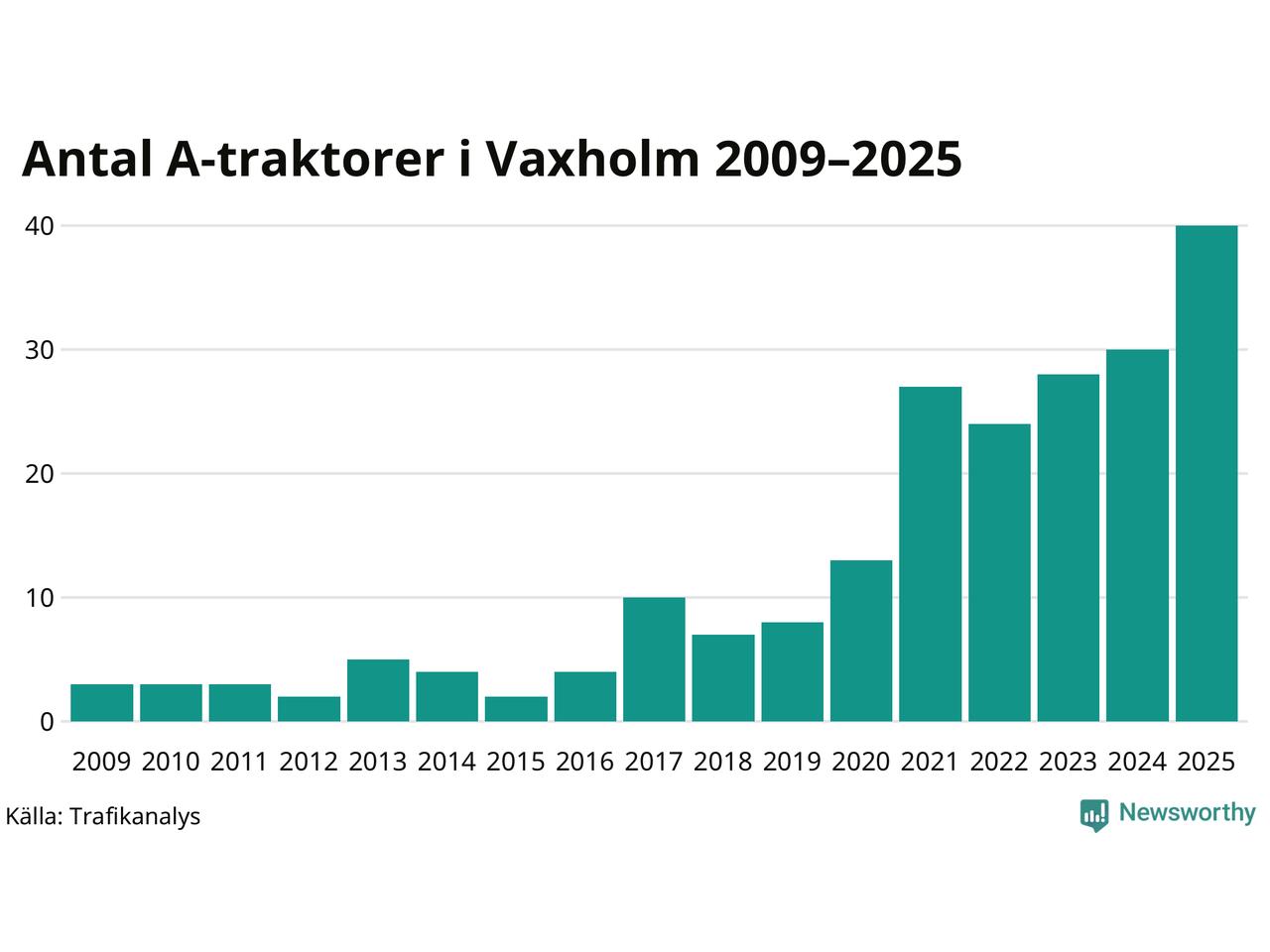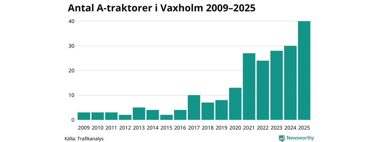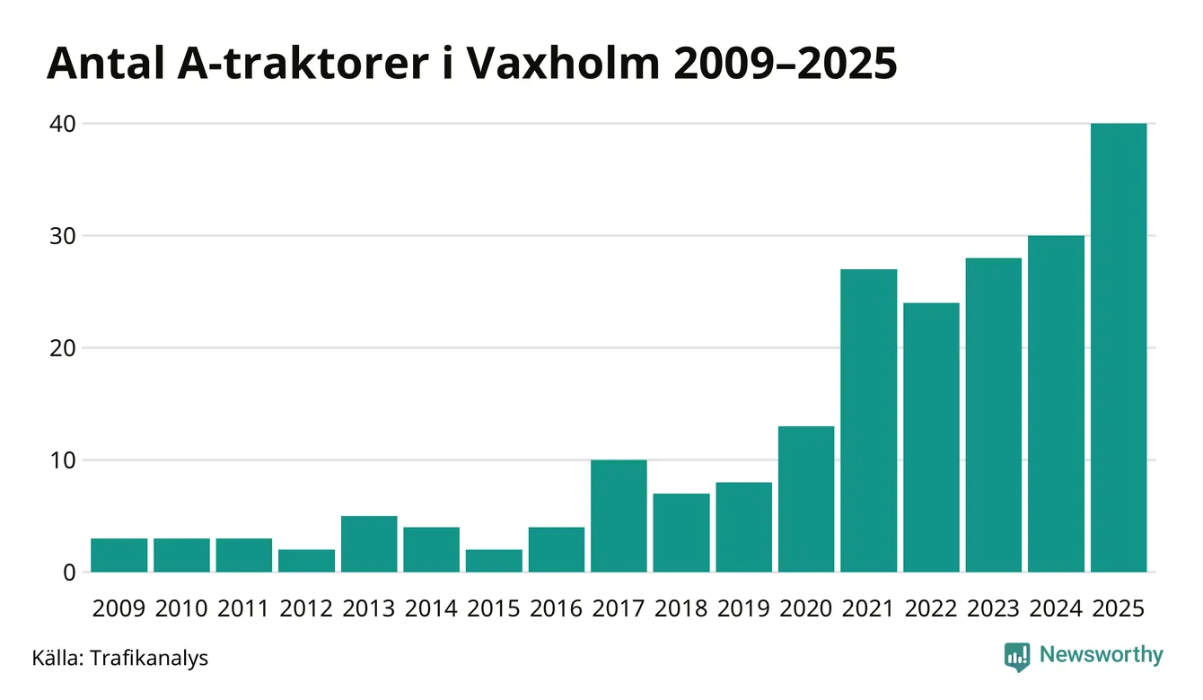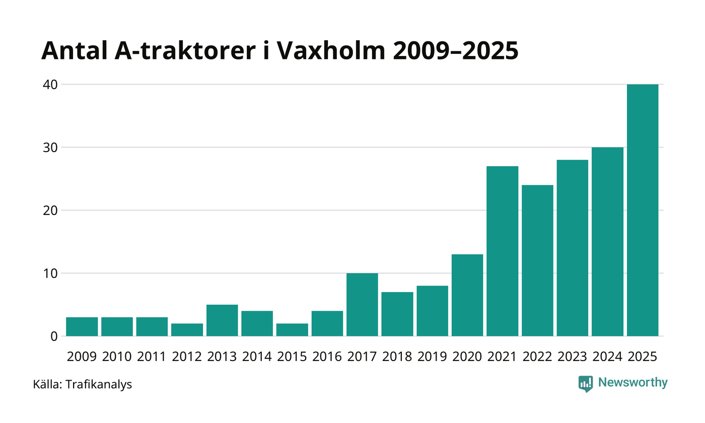 För tredje året i rad ökar antalet A-traktorer i Vaxholms kommun, visar nya siffror från Trafikanalys. I slutet av 2025 fanns 40 A-traktorer registrerade i kommunen, vilket är tio mer än året innan – en ökning med 33 procent. Det visar nya siffror från Trafikanalys. Inte sedan åtminstone 2009, som är det första året vi har statistik för, har det funnits så många A-traktorer i kommunen.
