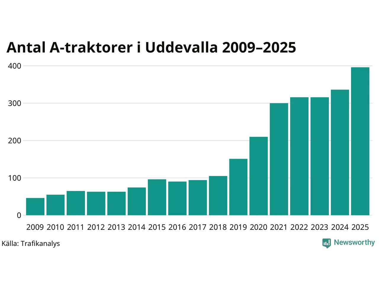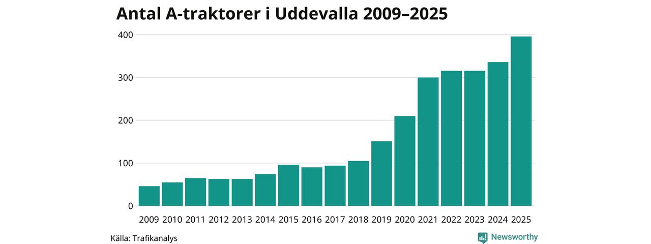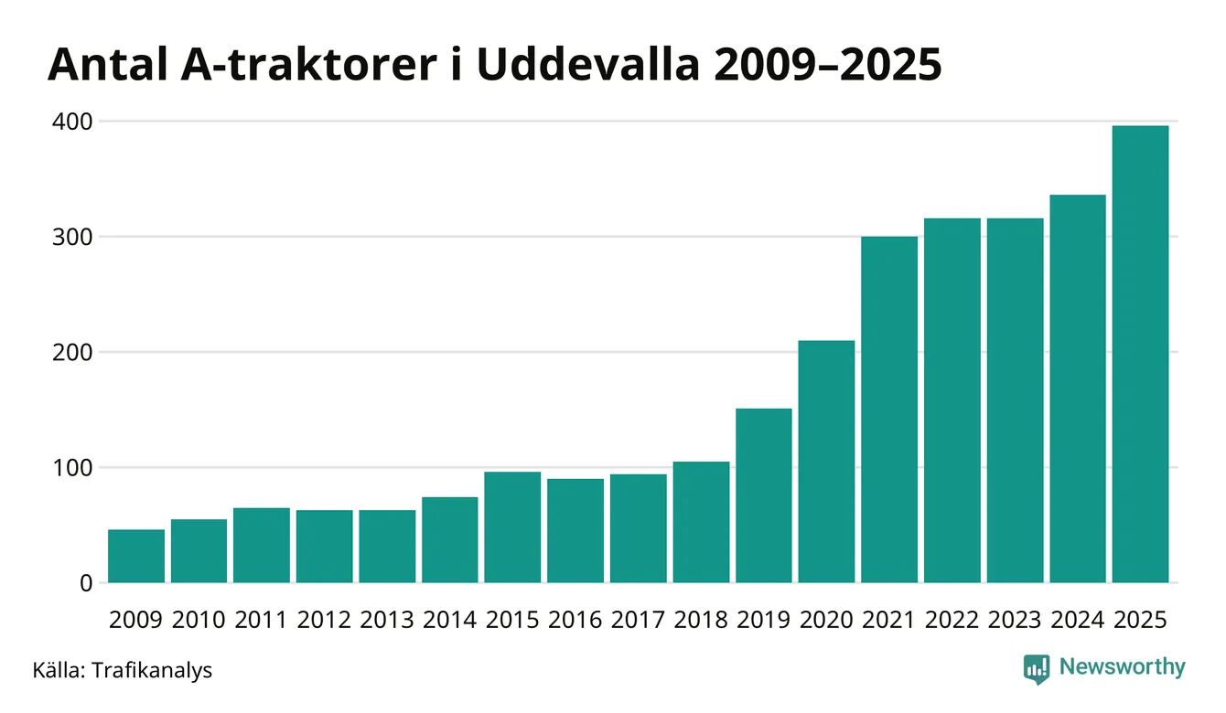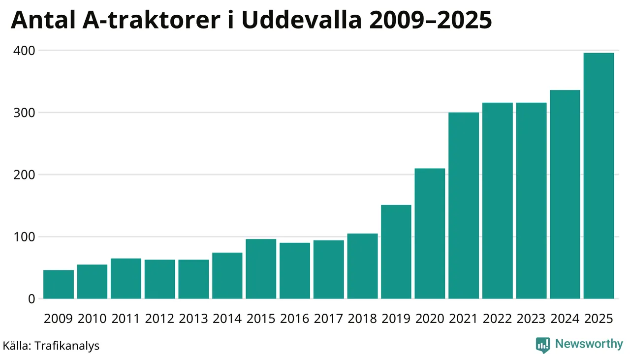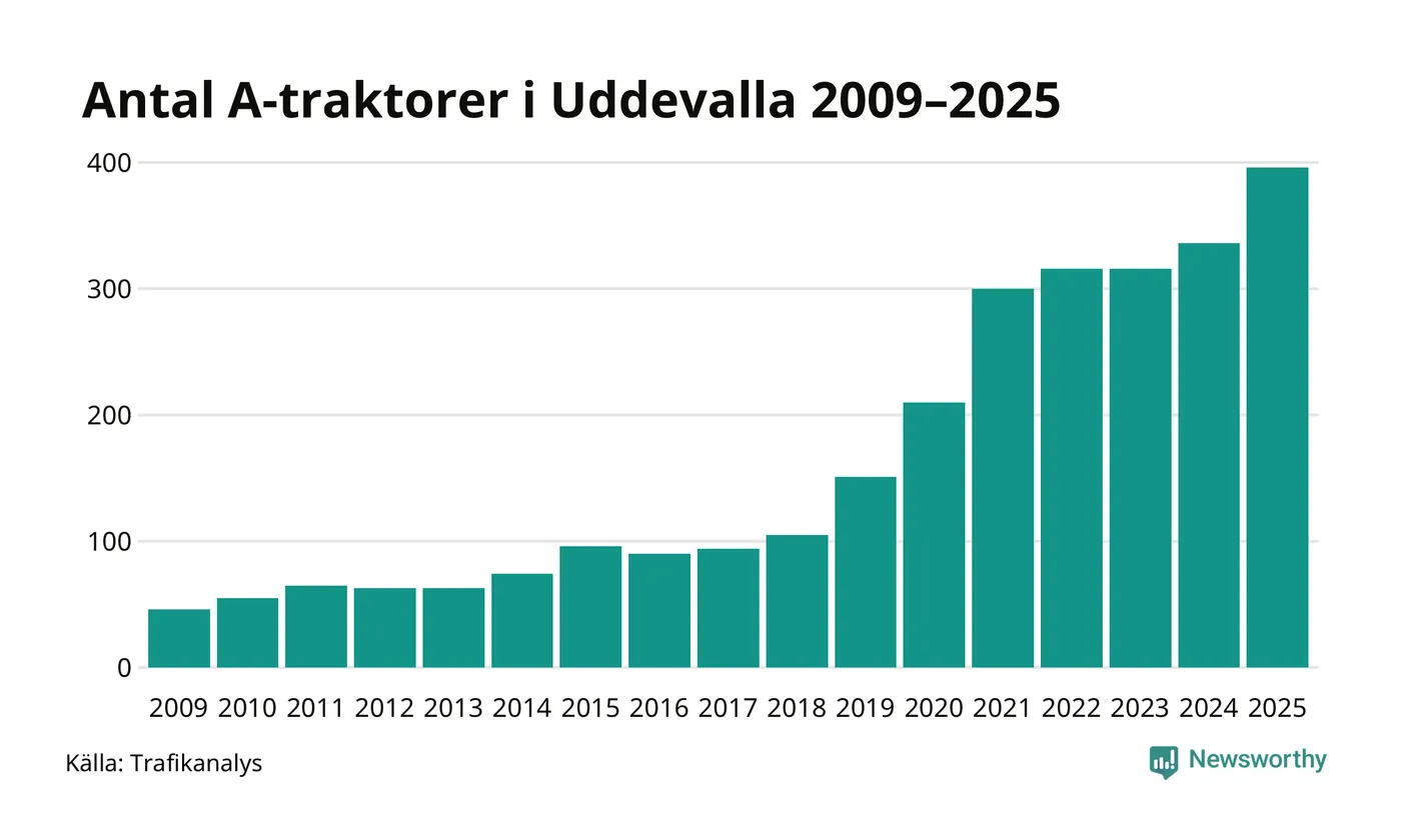 För andra året i rad ökar antalet A-traktorer i Uddevalla kommun, visar nya siffror från Trafikanalys. I slutet av 2025 fanns 396 A-traktorer registrerade i kommunen, vilket är 60 mer än året innan – en ökning med 18 procent. Det visar nya siffror från Trafikanalys. Inte sedan åtminstone 2009, som är det första året vi har statistik för, har det funnits så många A-traktorer i kommunen.
