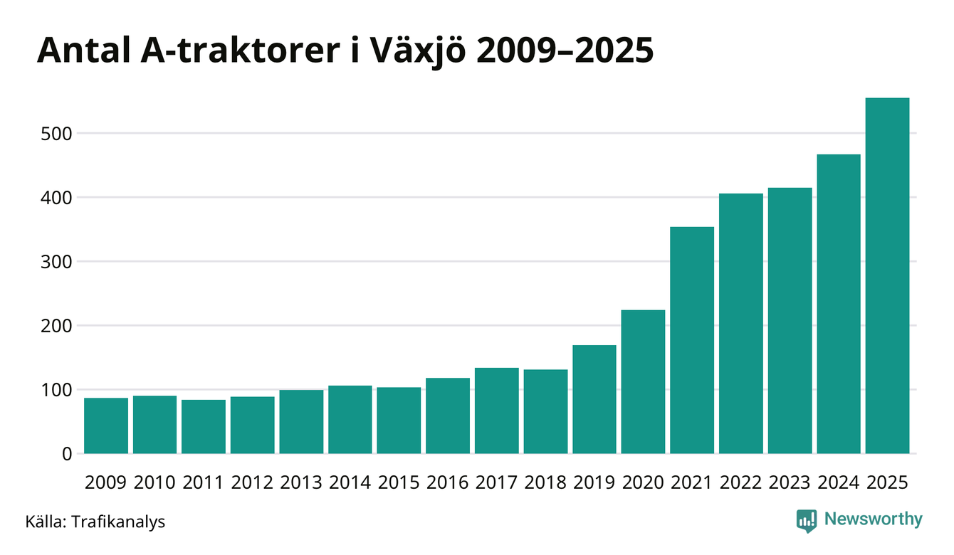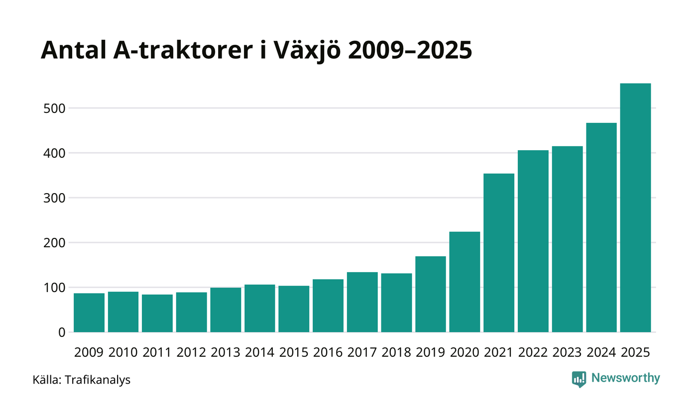 För sjunde året i rad ökar antalet A-traktorer i Växjö kommun, visar nya siffror från Trafikanalys. I slutet av 2025 fanns 555 A-traktorer registrerade i kommunen, vilket är 88 mer än året innan – en ökning med 19 procent. Det är den näst största ökningen i Kronobergs län. Inte sedan åtminstone 2009, som är det första året vi har statistik för, har det funnits så många A-traktorer i kommunen.