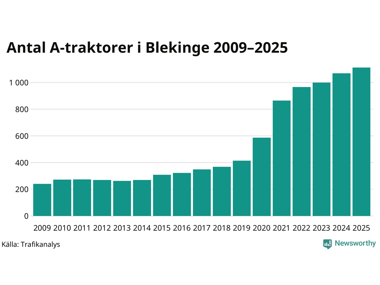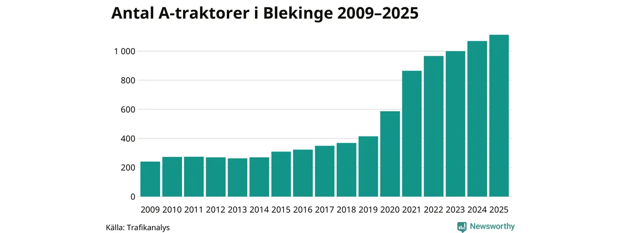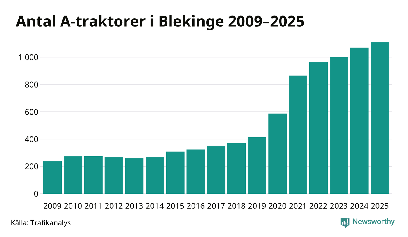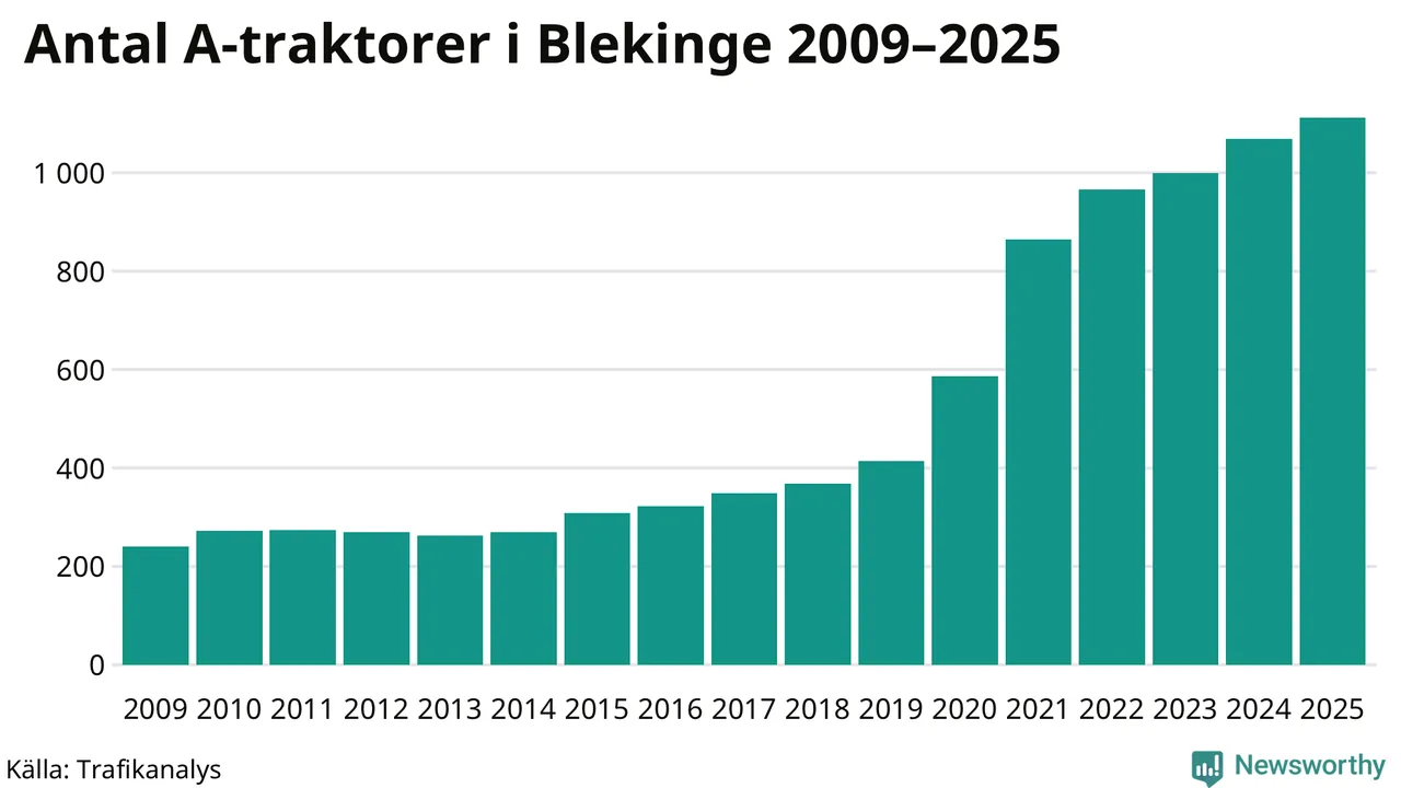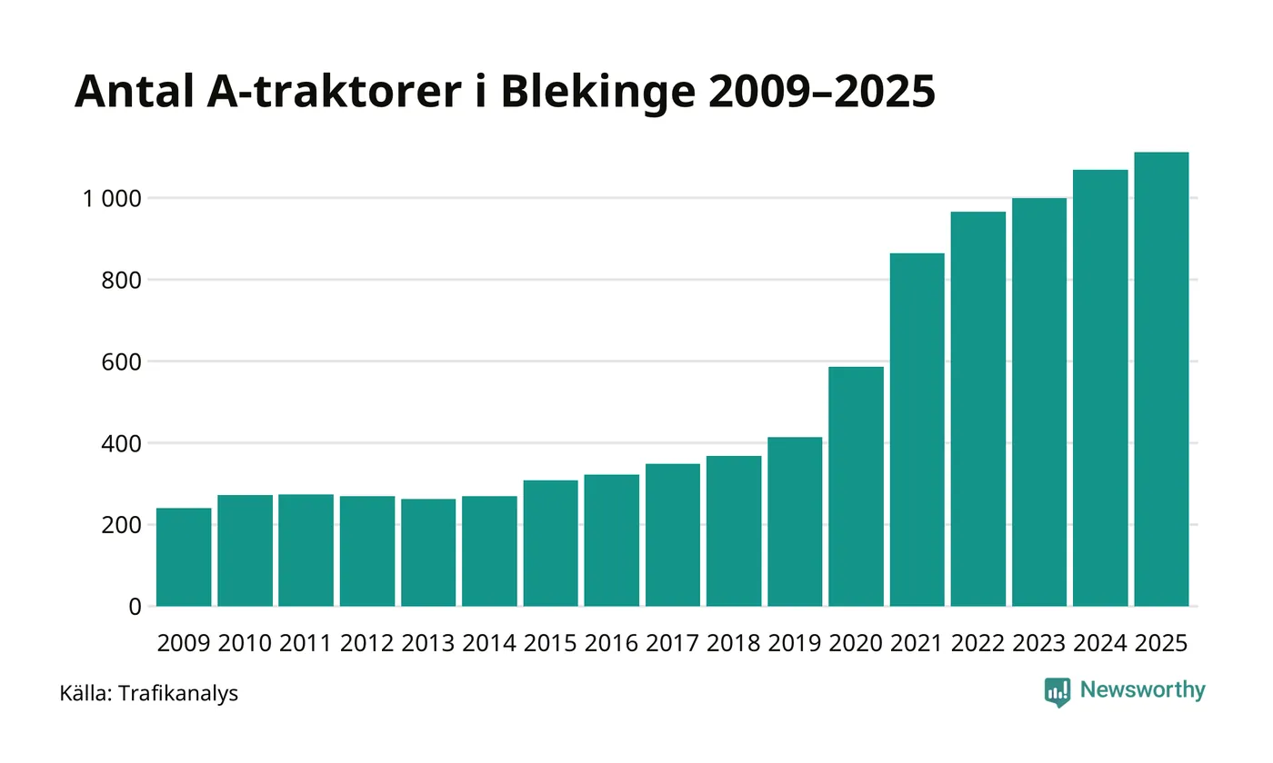 För tolfte året i rad ökar antalet A-traktorer i Blekinge län, visar nya siffror från Trafikanalys. I slutet av 2025 fanns 1 112 A-traktorer registrerade i länet, vilket är 43 mer än året innan – en ökning med 4 procent. Inte sedan åtminstone 2009, som är det första året vi har statistik för, har det funnits så många A-traktorer i länet.