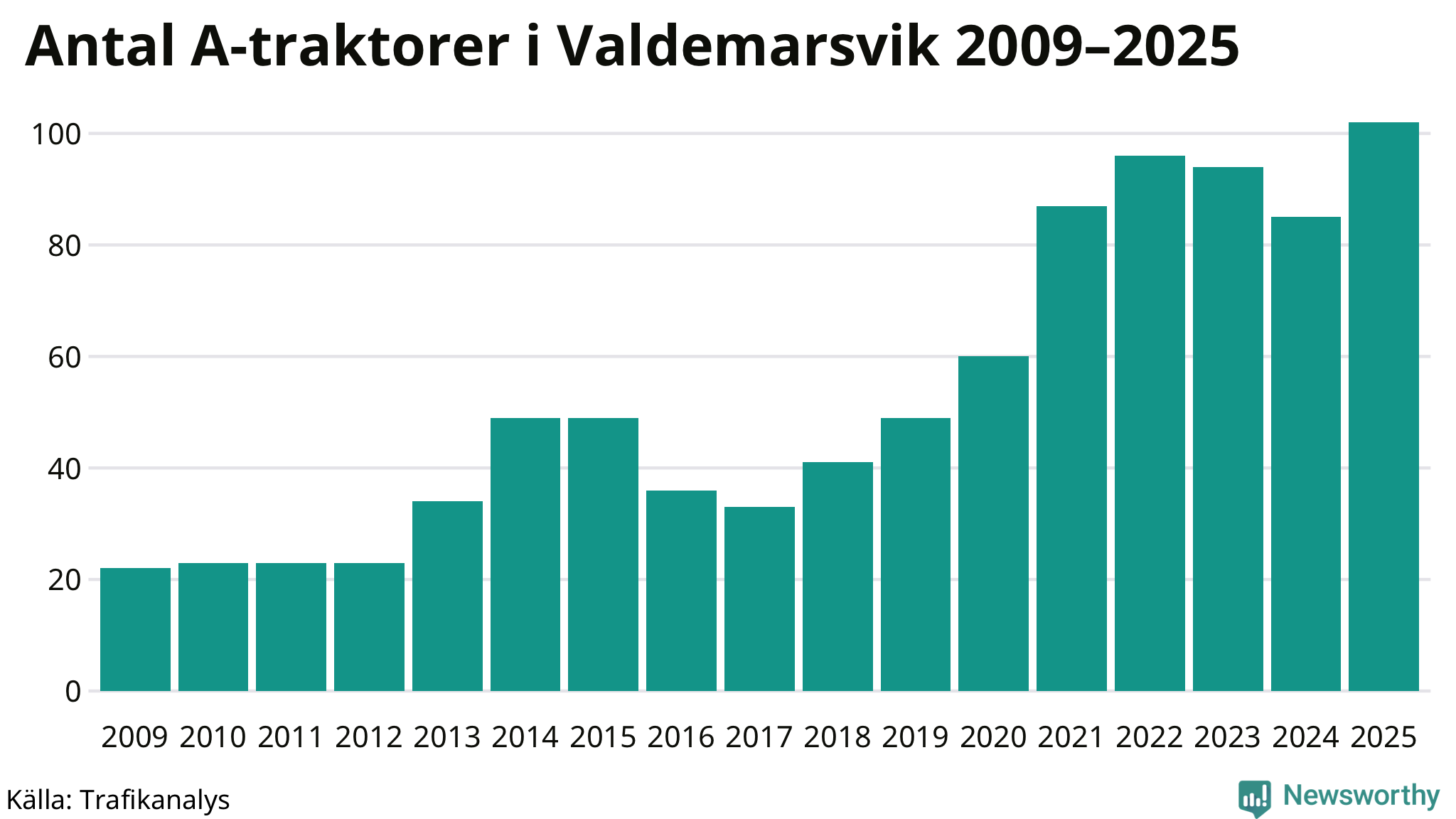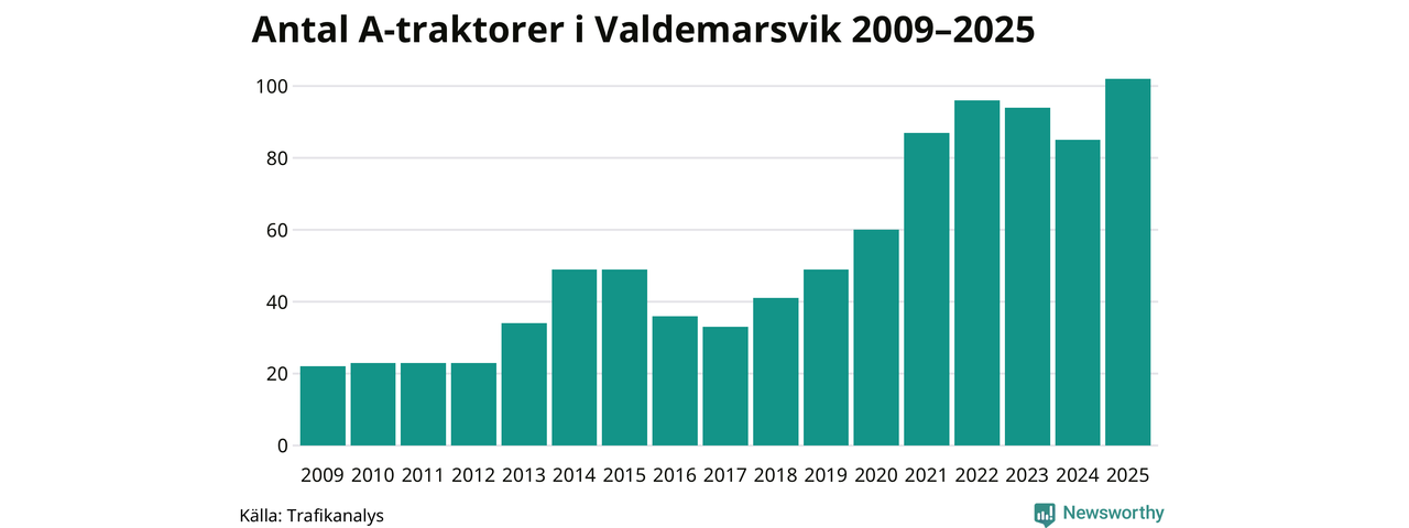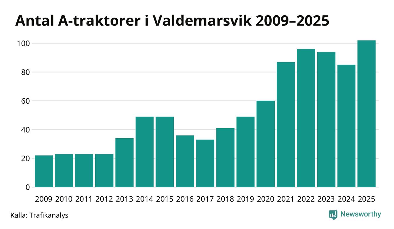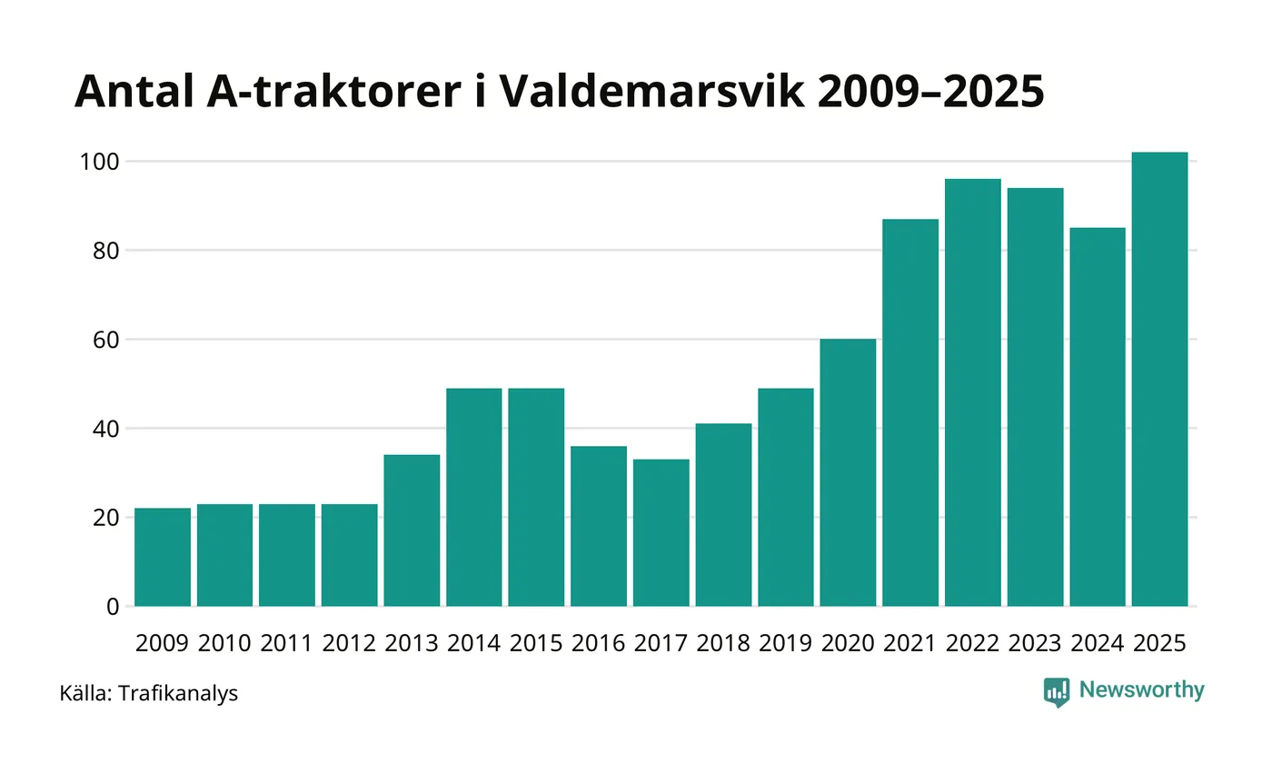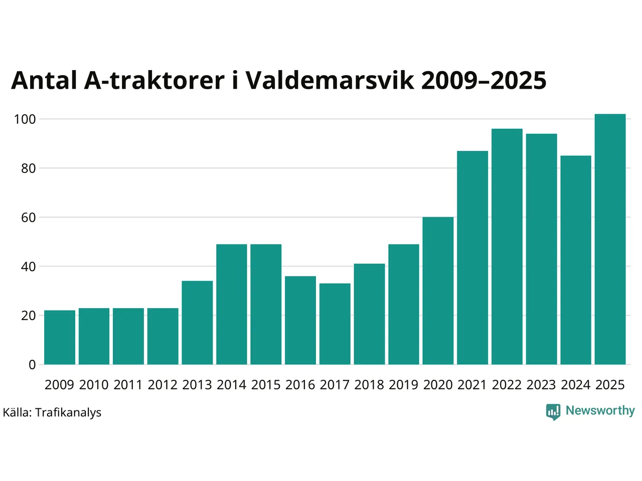 I slutet av 2025 fanns 102 A-traktorer registrerade i kommunen, vilket är 17 mer än året innan – en ökning med 20 procent. Det visar nya siffror från Trafikanalys. Inte sedan åtminstone 2009, som är det första året vi har statistik för, har det funnits så många A-traktorer i kommunen.