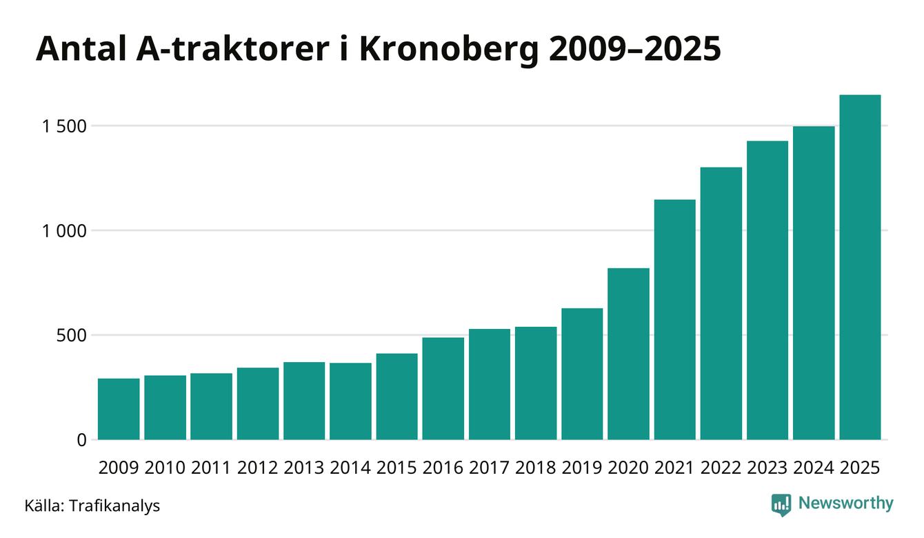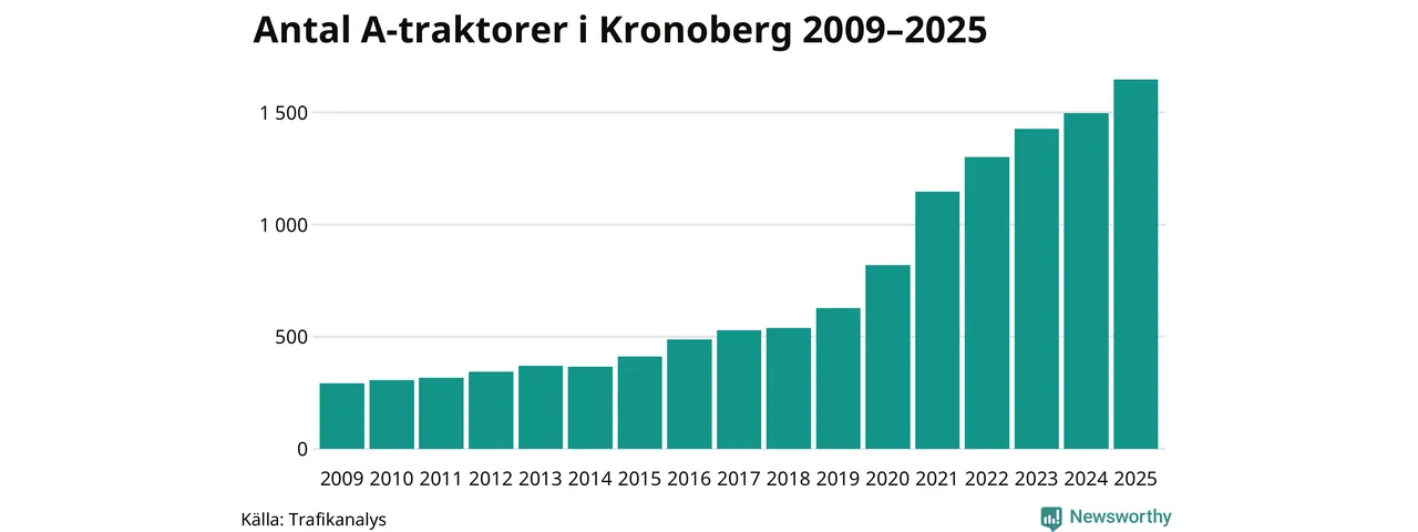 För elfte året i rad ökar antalet A-traktorer i Kronobergs län, visar nya siffror från Trafikanalys. I slutet av 2025 fanns 1 647 A-traktorer registrerade i länet, vilket är 150 mer än året innan – en ökning med 10 procent. Inte sedan åtminstone 2009, som är det första året vi har statistik för, har det funnits så många A-traktorer i länet.