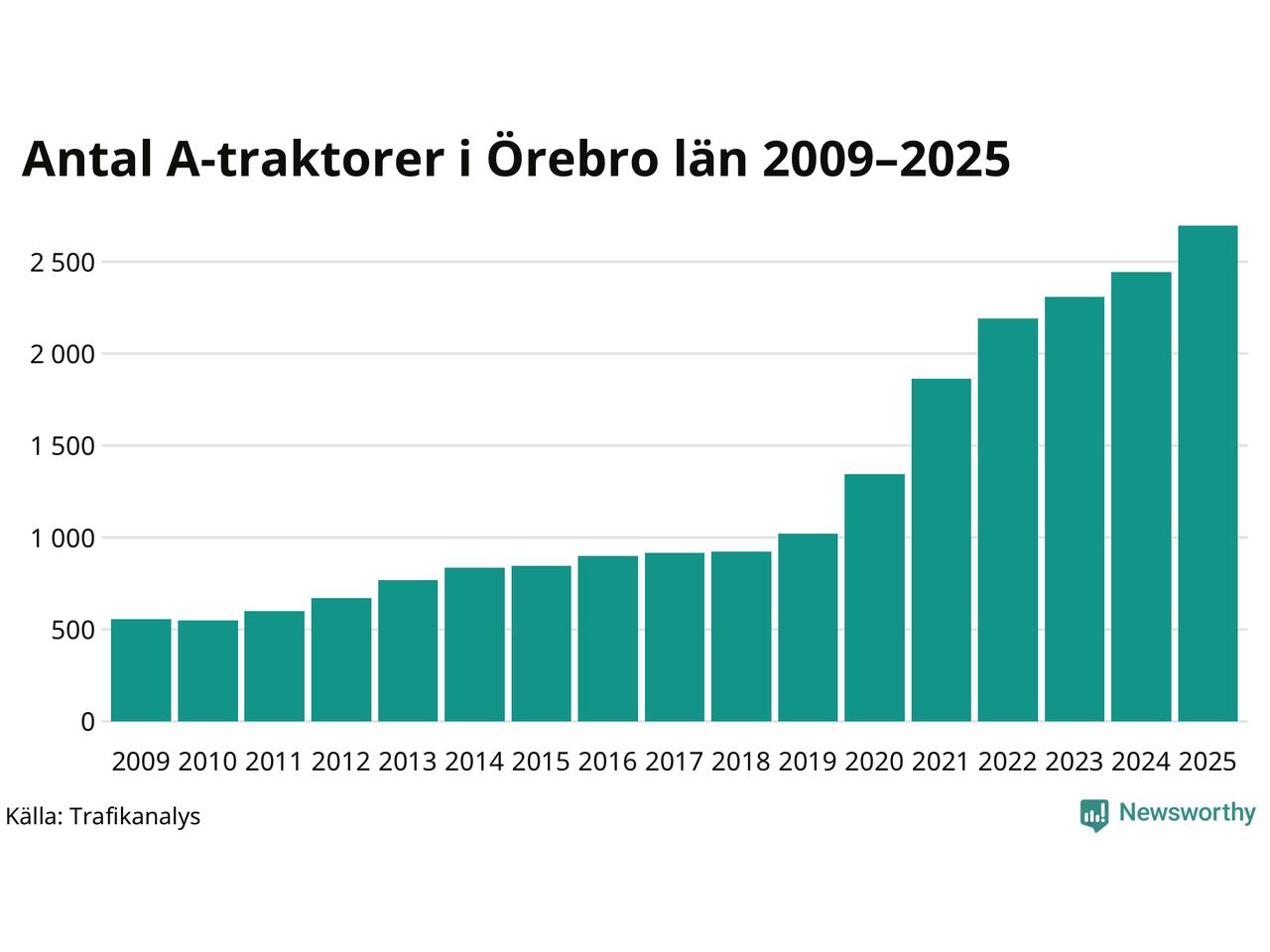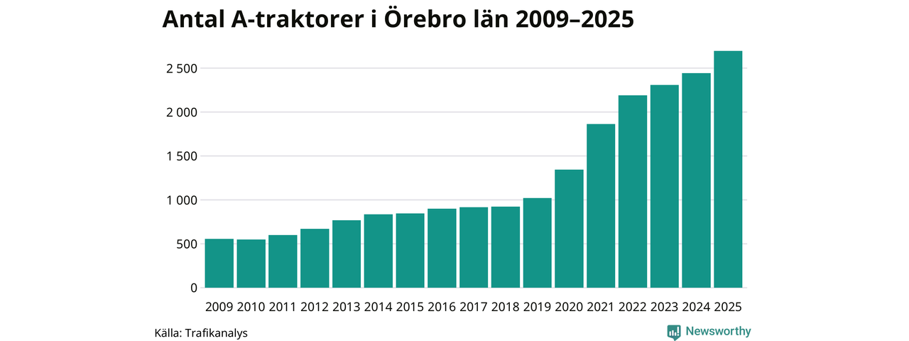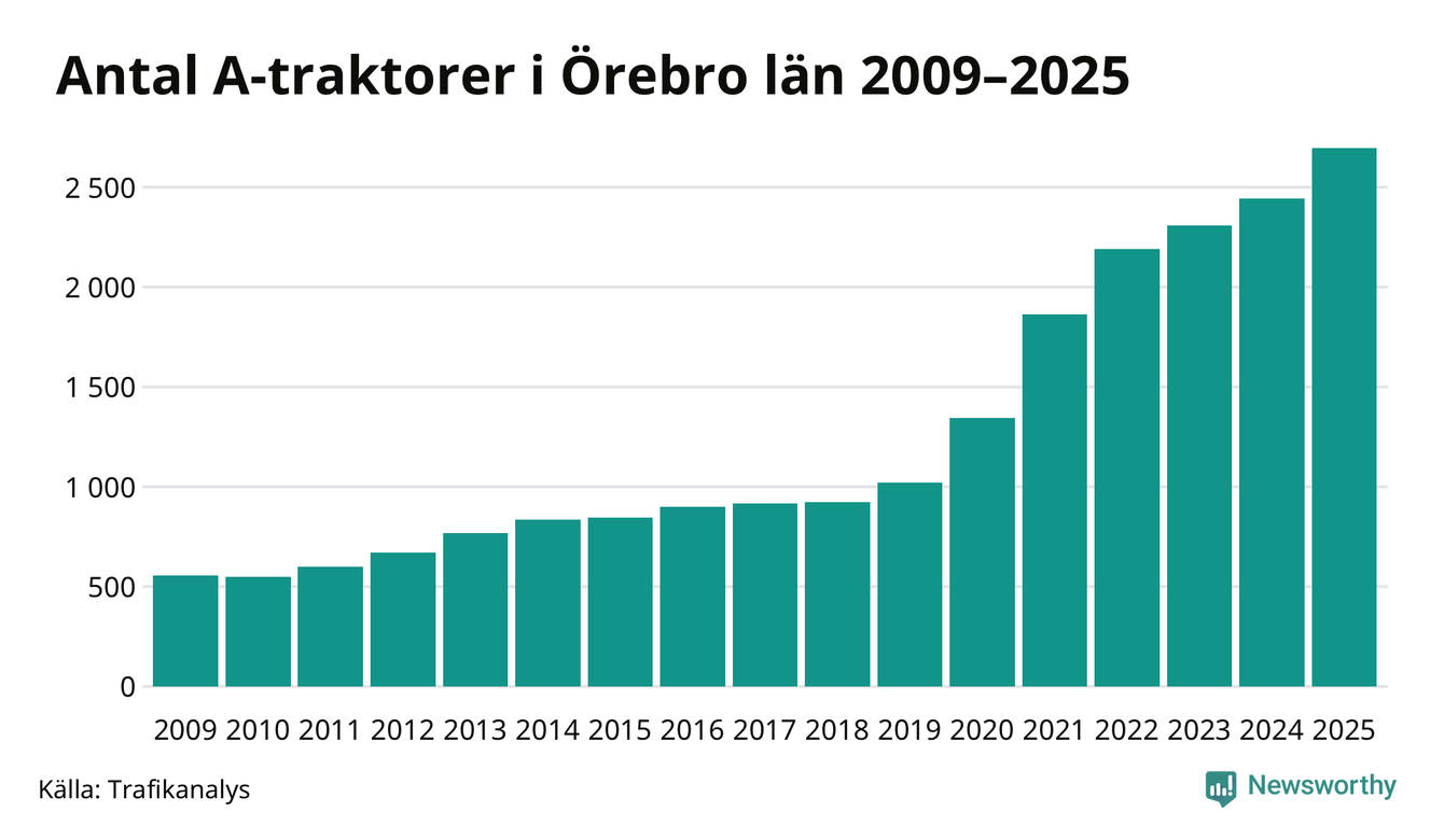 För 15:e året i rad ökar antalet A-traktorer i Örebro län, visar nya siffror från Trafikanalys. I slutet av 2025 fanns 2 696 A-traktorer registrerade i länet, vilket är 253 mer än året innan – en ökning med 10 procent. Inte sedan åtminstone 2009, som är det första året vi har statistik för, har det funnits så många A-traktorer i länet.