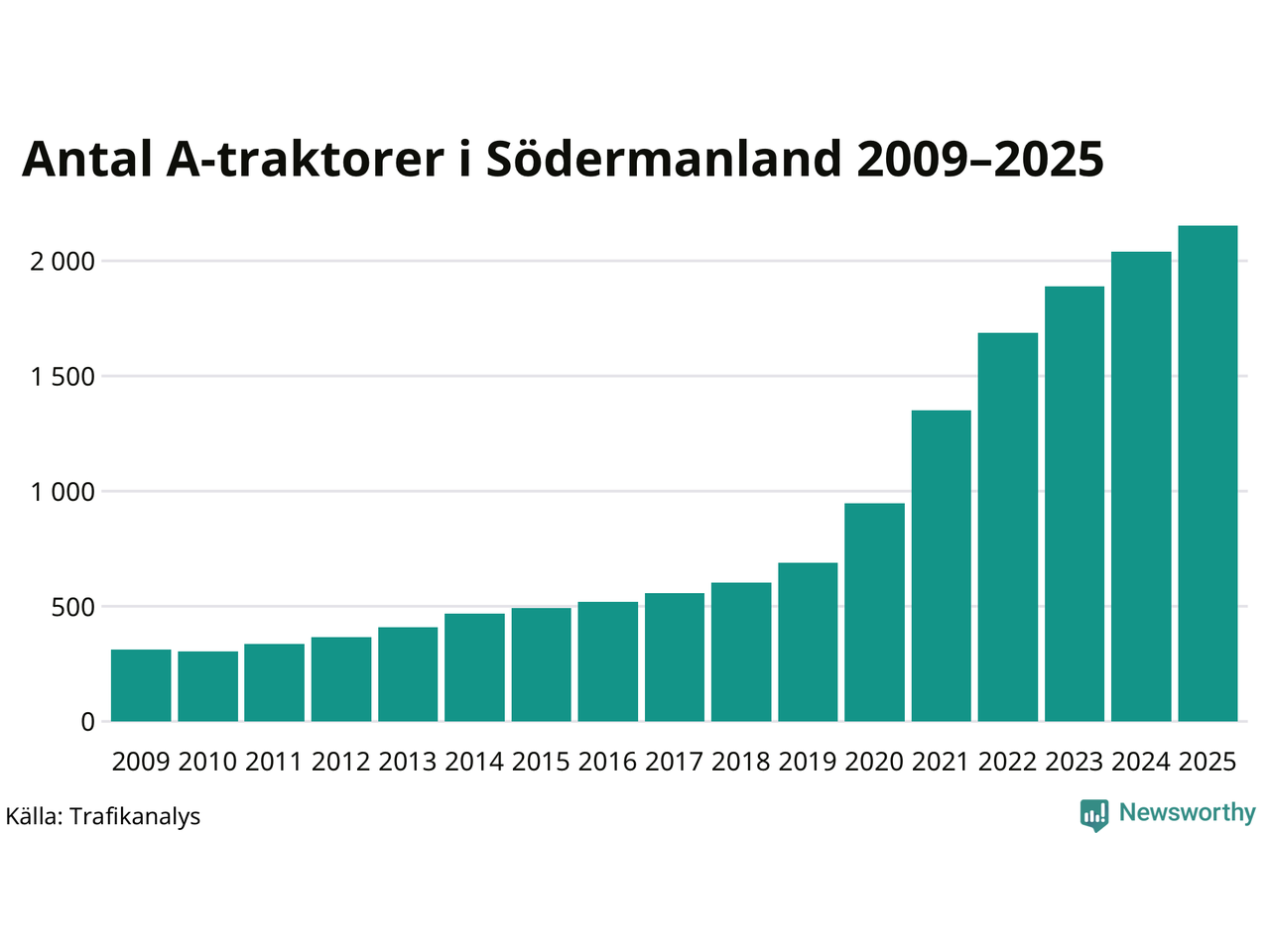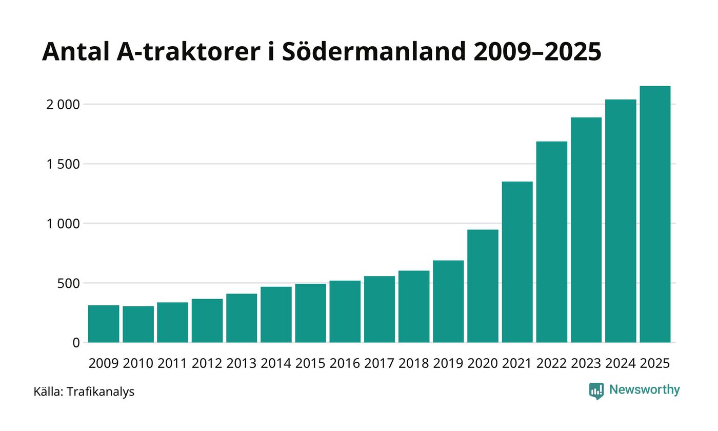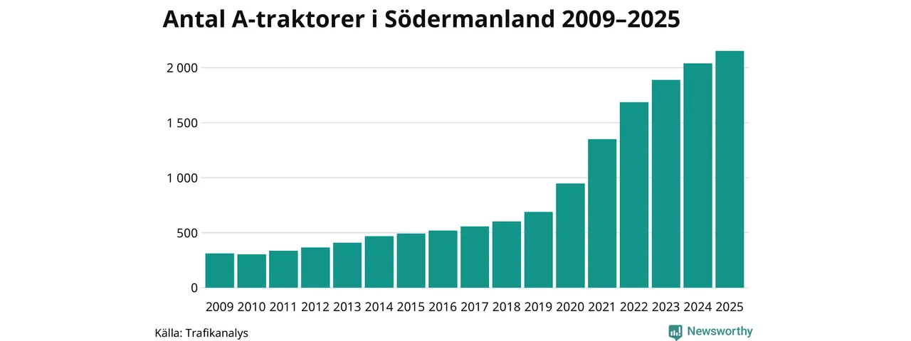 För 15:e året i rad ökar antalet A-traktorer i Södermanlands län, visar nya siffror från Trafikanalys. I slutet av 2025 fanns 2 153 A-traktorer registrerade i länet, vilket är 112 mer än året innan – en ökning med 5 procent. Inte sedan åtminstone 2009, som är det första året vi har statistik för, har det funnits så många A-traktorer i länet.