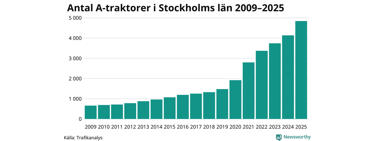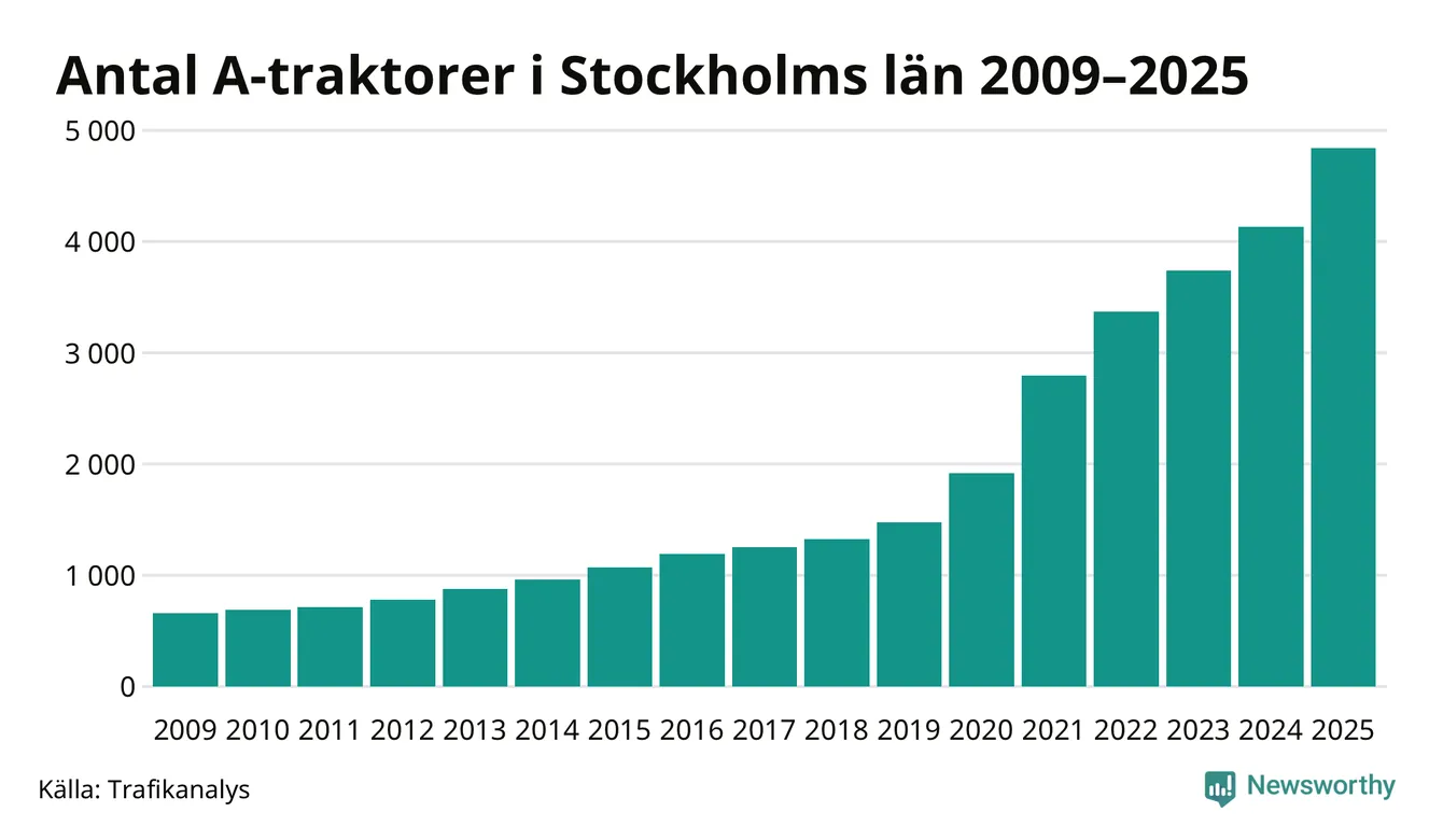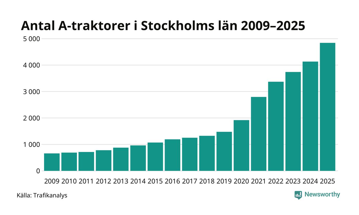 För åtminstone 16:e året i rad ökar antalet A-traktorer i Stockholms län, visar nya siffror från Trafikanalys. I slutet av 2025 fanns 4 841 A-traktorer registrerade i länet, vilket är 710 mer än året innan – en ökning med 17 procent. Det är den största procentuella ökningen i landet. Inte sedan åtminstone 2009, som är det första året vi har statistik för, har det funnits så många A-traktorer i länet.