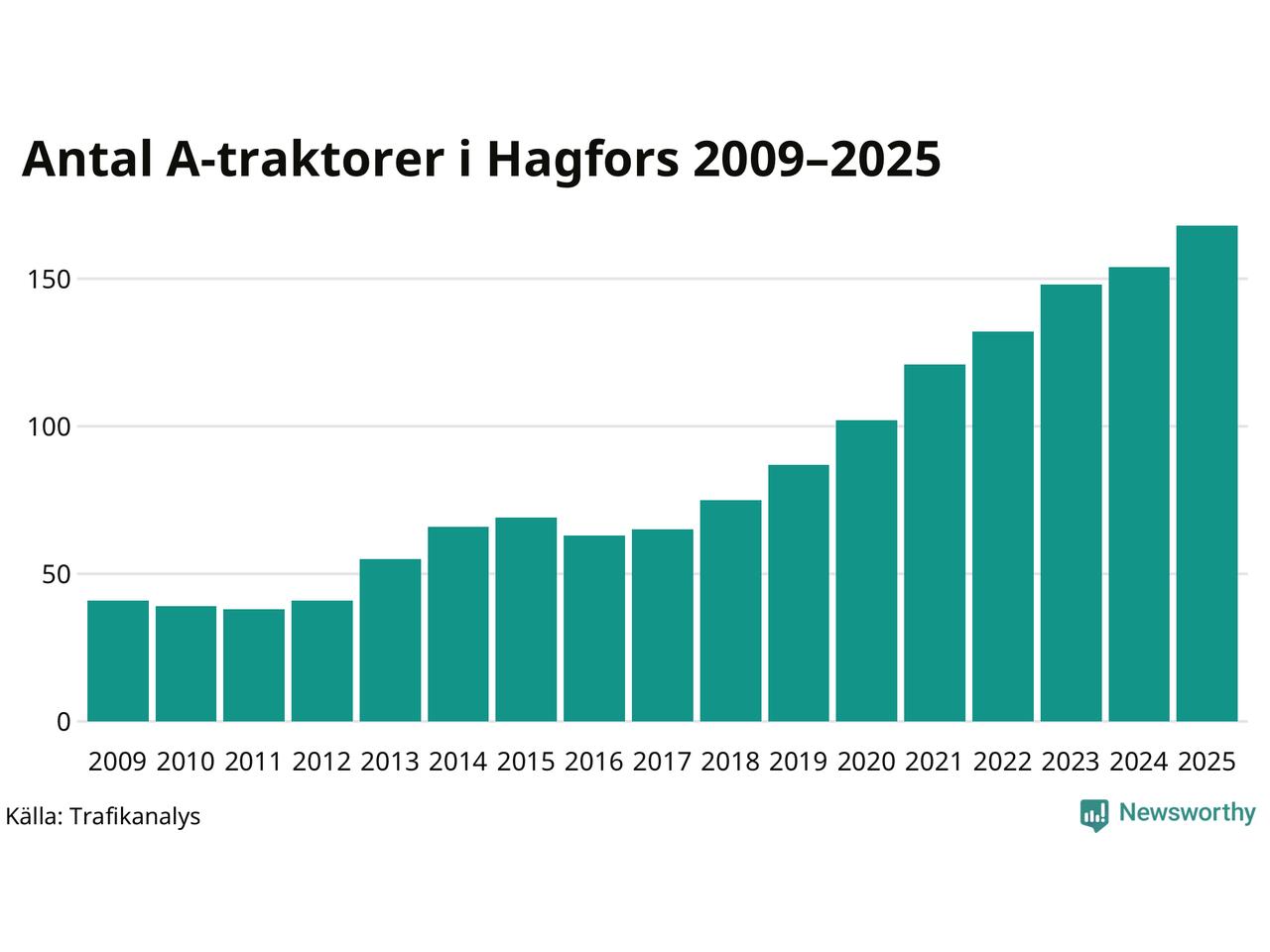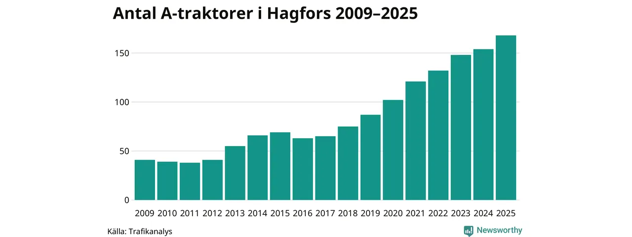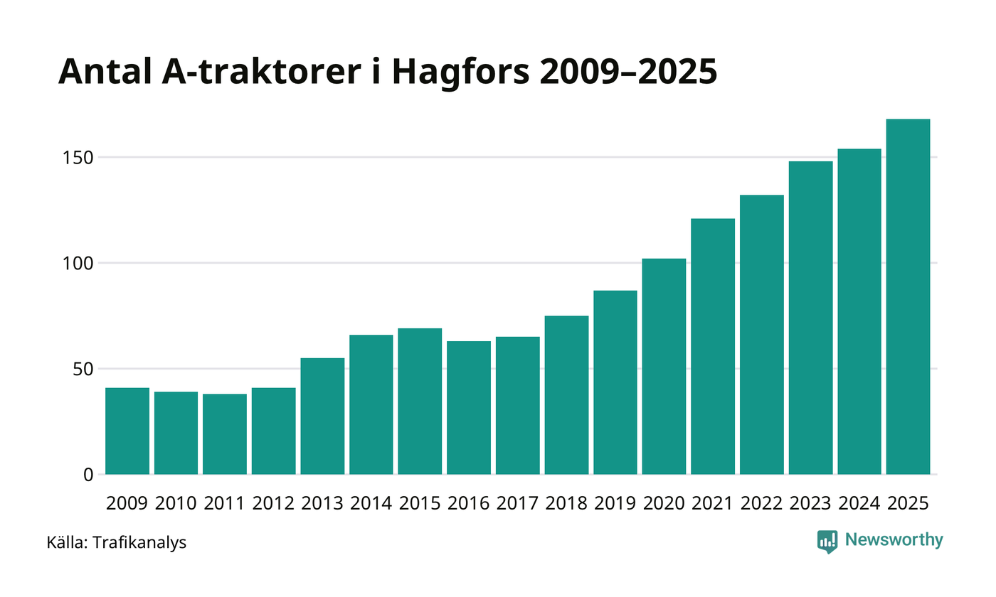För nionde året i rad ökar antalet A-traktorer i Hagfors kommun, visar nya siffror från Trafikanalys. I slutet av 2025 fanns 168 A-traktorer registrerade i kommunen, vilket är 14 mer än året innan – en ökning med 9 procent. Inte sedan åtminstone 2009, som är det första året vi har statistik för, har det funnits så många A-traktorer i kommunen.