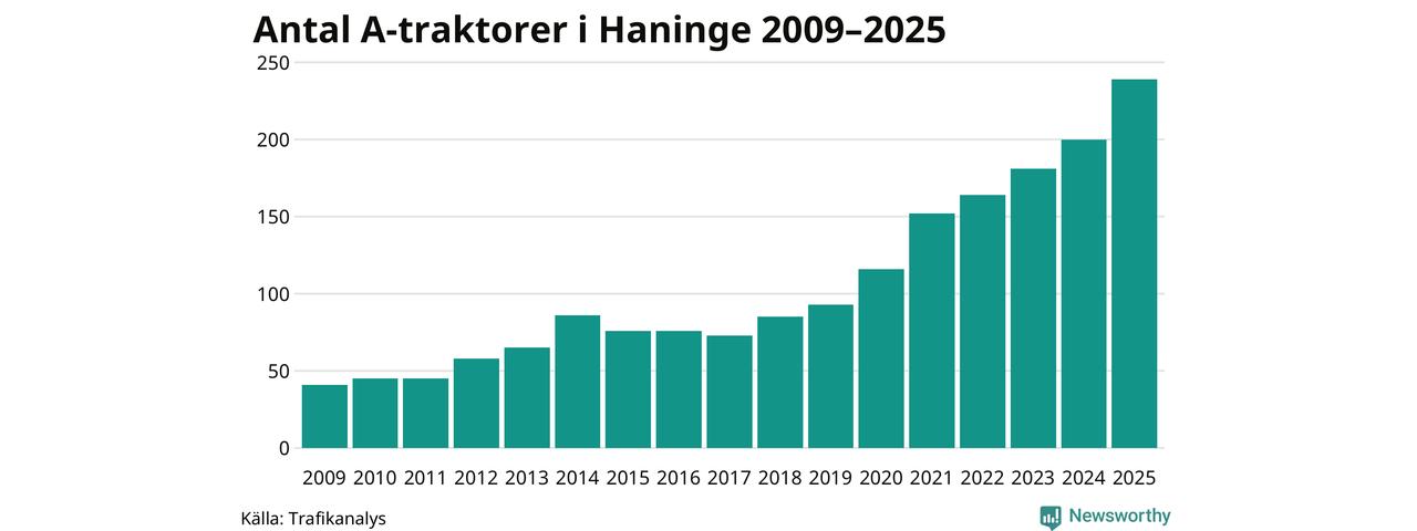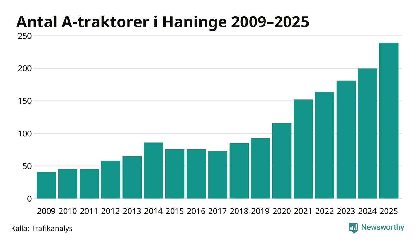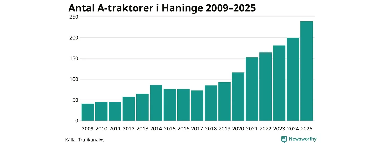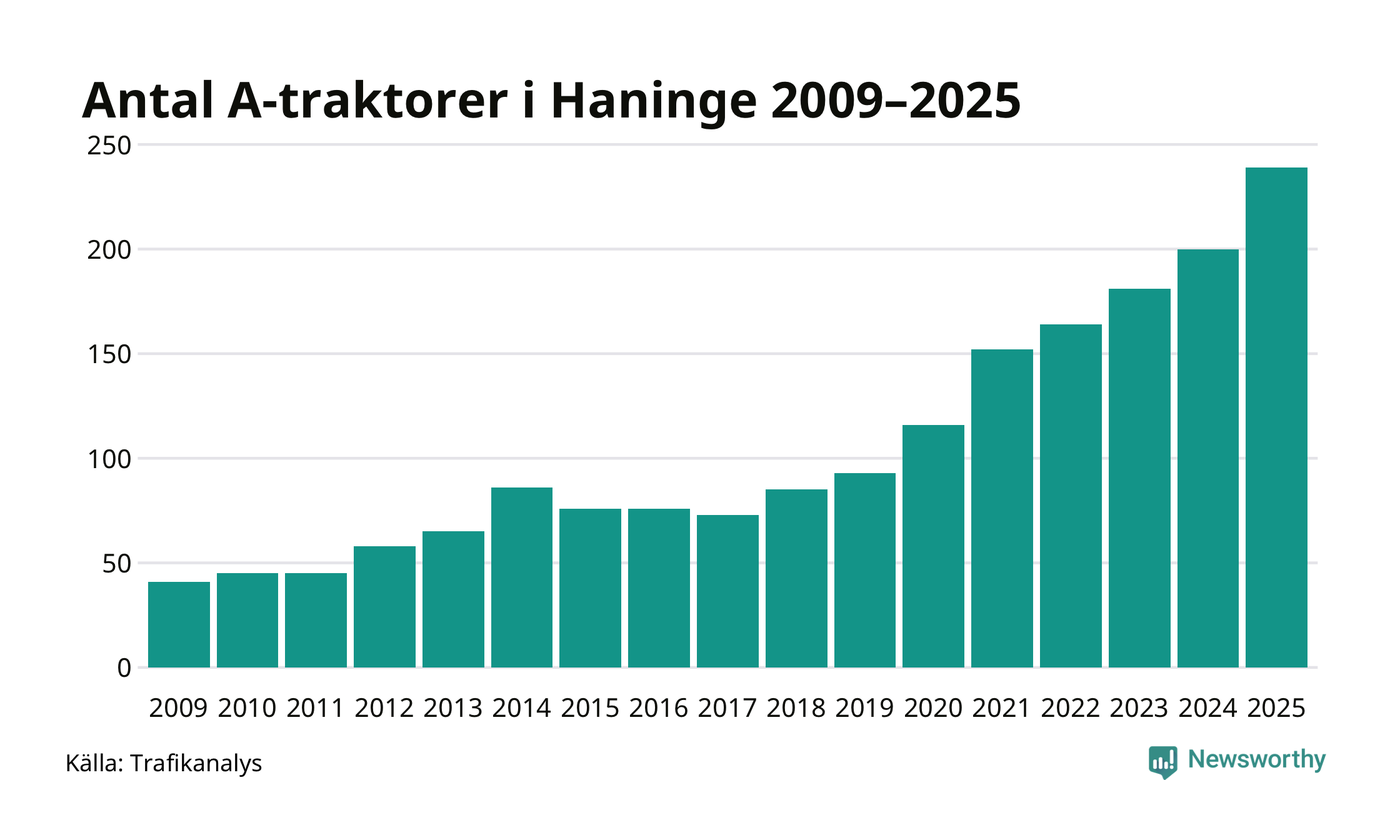 För åttonde året i rad ökar antalet A-traktorer i Haninge kommun, visar nya siffror från Trafikanalys. I slutet av 2025 fanns 239 A-traktorer registrerade i kommunen, vilket är 39 mer än året innan – en ökning med 20 procent. Ökningen är den största från ett år till ett annat någonsin i Haninge kommun i absoluta tal.