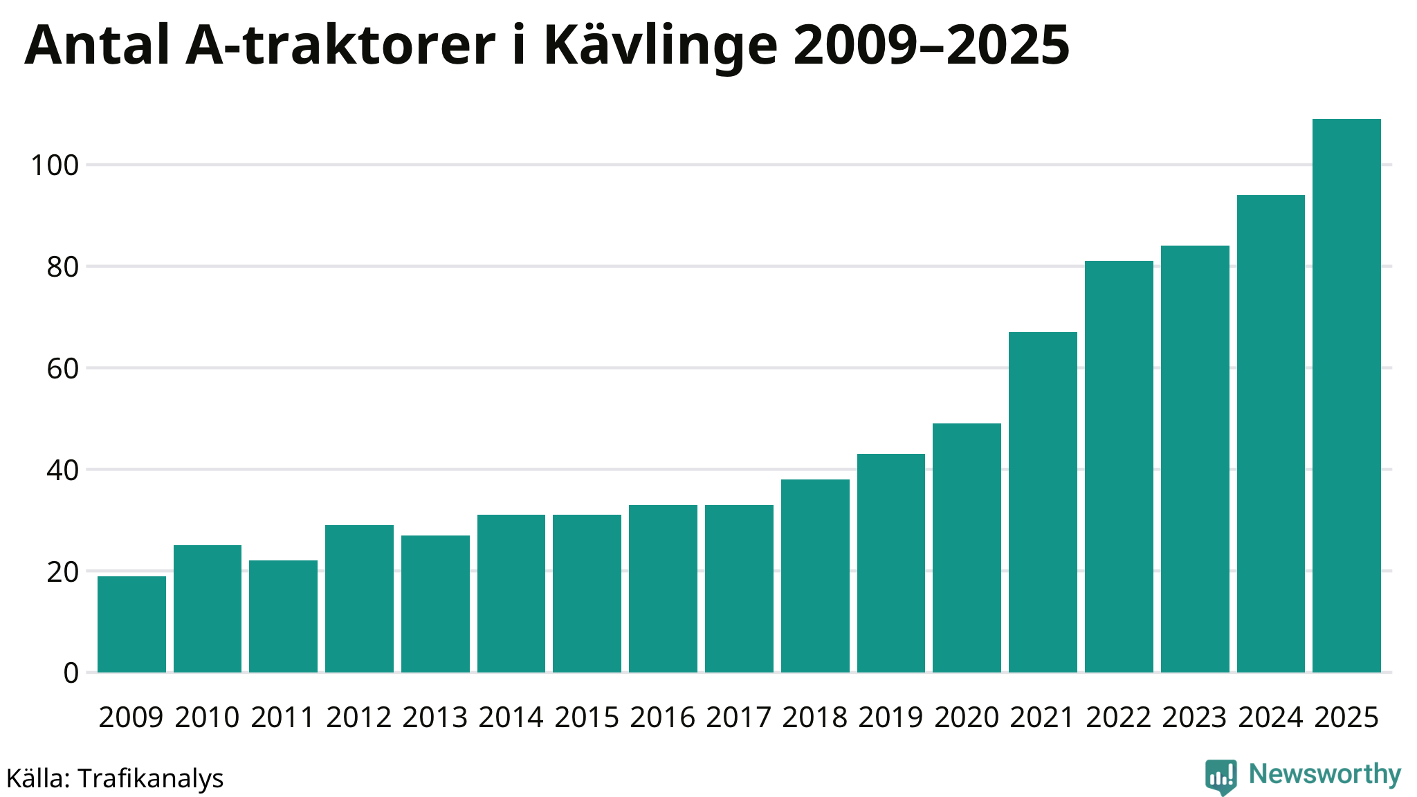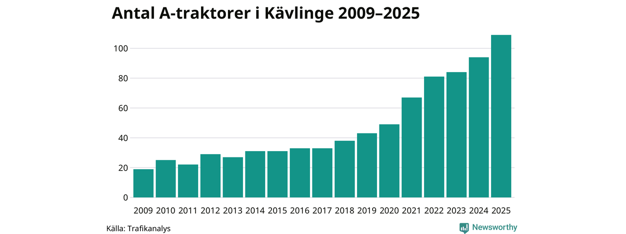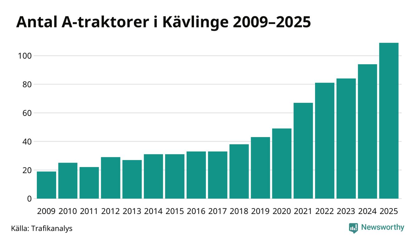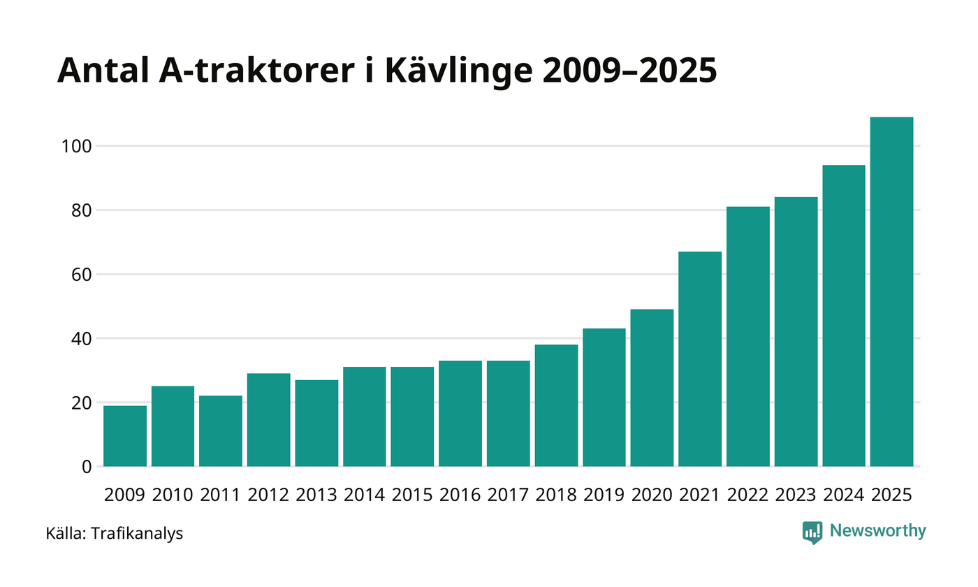 För åttonde året i rad ökar antalet A-traktorer i Kävlinge kommun, visar nya siffror från Trafikanalys. I slutet av 2025 fanns 109 A-traktorer registrerade i kommunen, vilket är 15 mer än året innan – en ökning med 16 procent. Inte sedan åtminstone 2009, som är det första året vi har statistik för, har det funnits så många A-traktorer i kommunen.