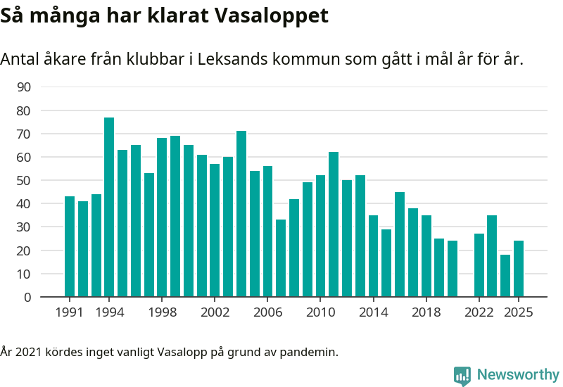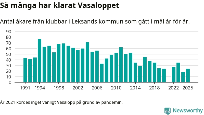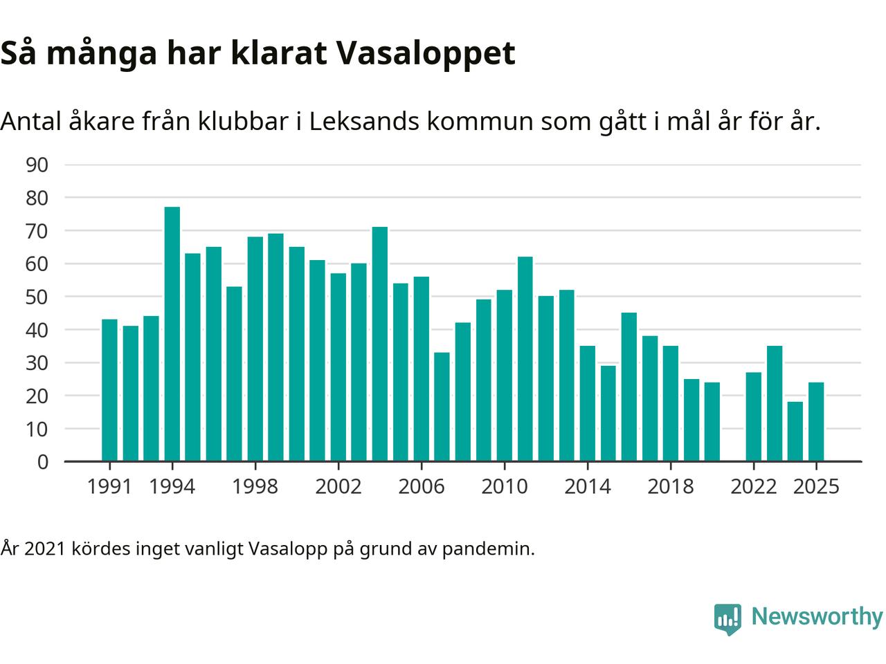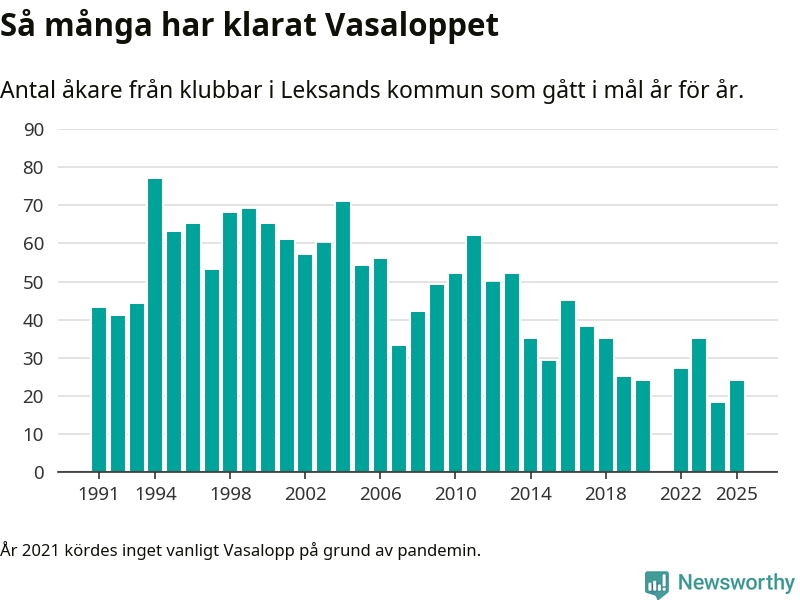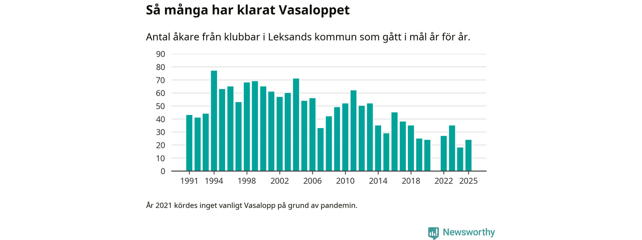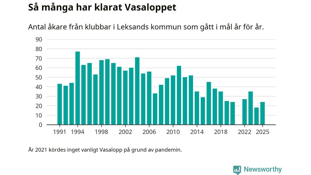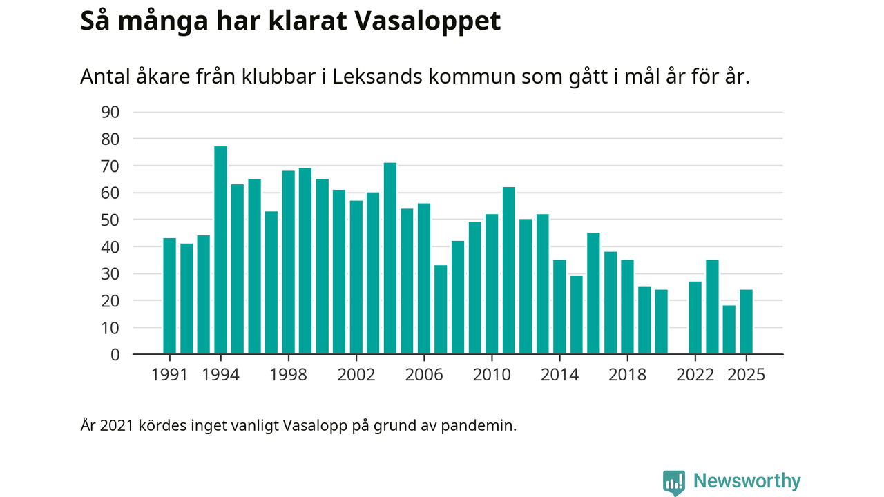 På söndag går starten för det 102:a Vasaloppet. Newsworthy har samlat in och sammanställt samtliga Vasaloppsresultat sedan 1991. Det ger en unik bild av hur skidåkare från klubbar i Leksands kommun har klarat sig genom åren.