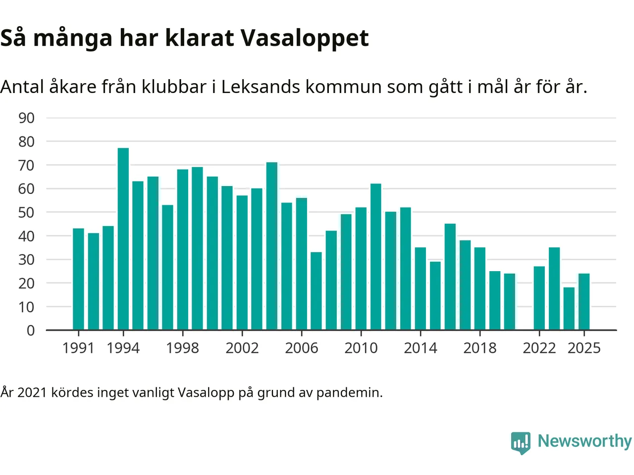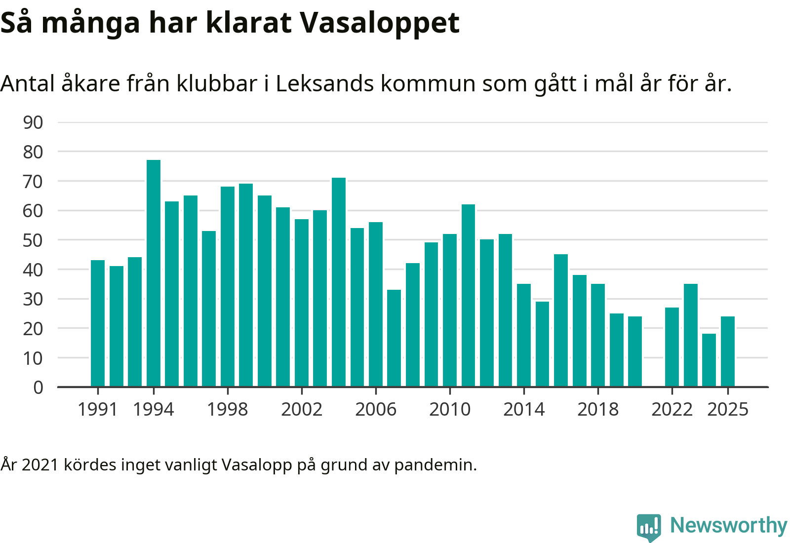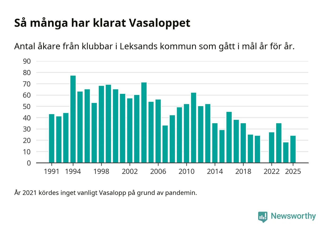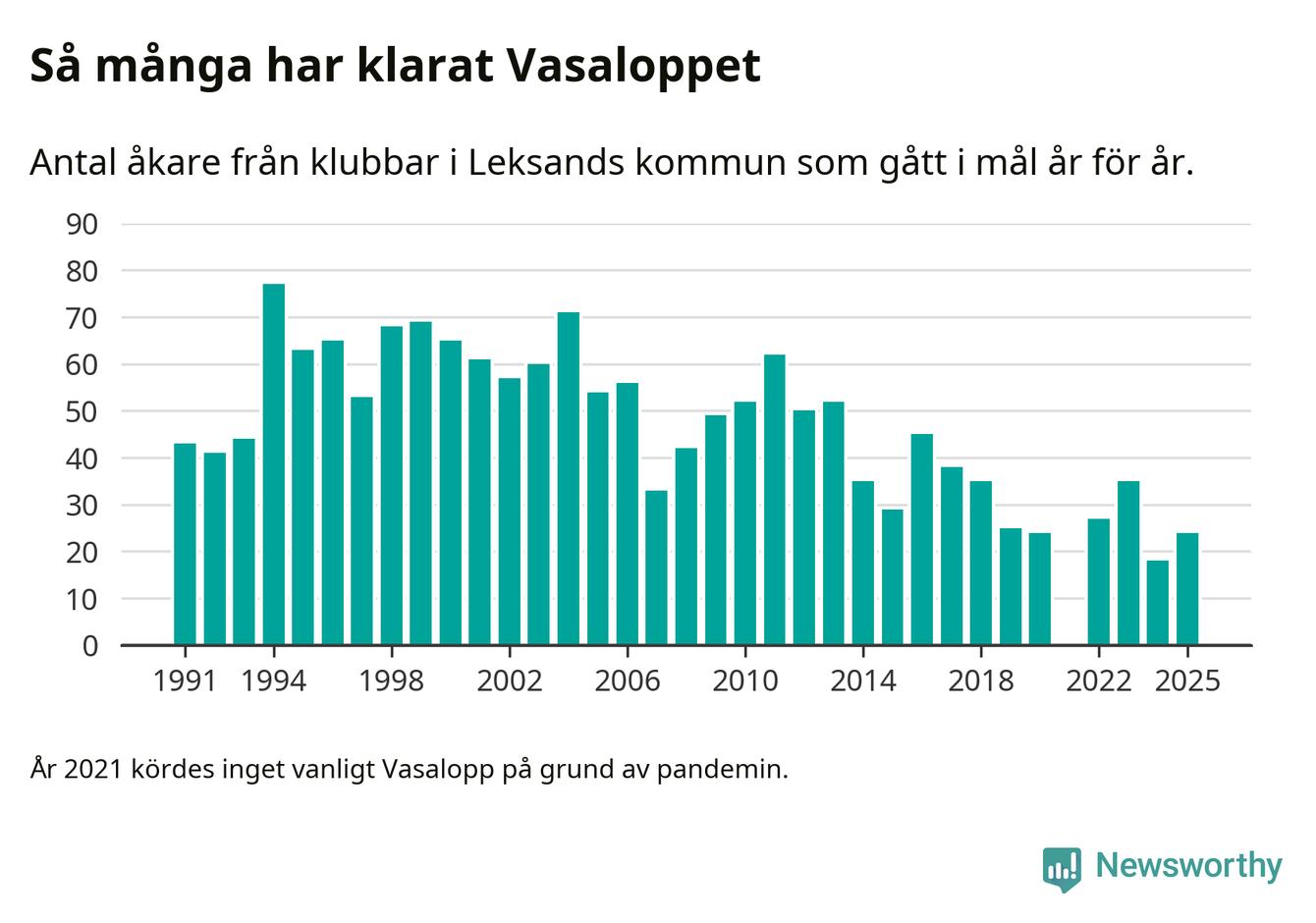 På söndag går starten för det 102:a Vasaloppet. Newsworthy har samlat in och sammanställt samtliga Vasaloppsresultat sedan 1991. Det ger en unik bild av hur skidåkare från klubbar i Leksands kommun har klarat sig genom åren.