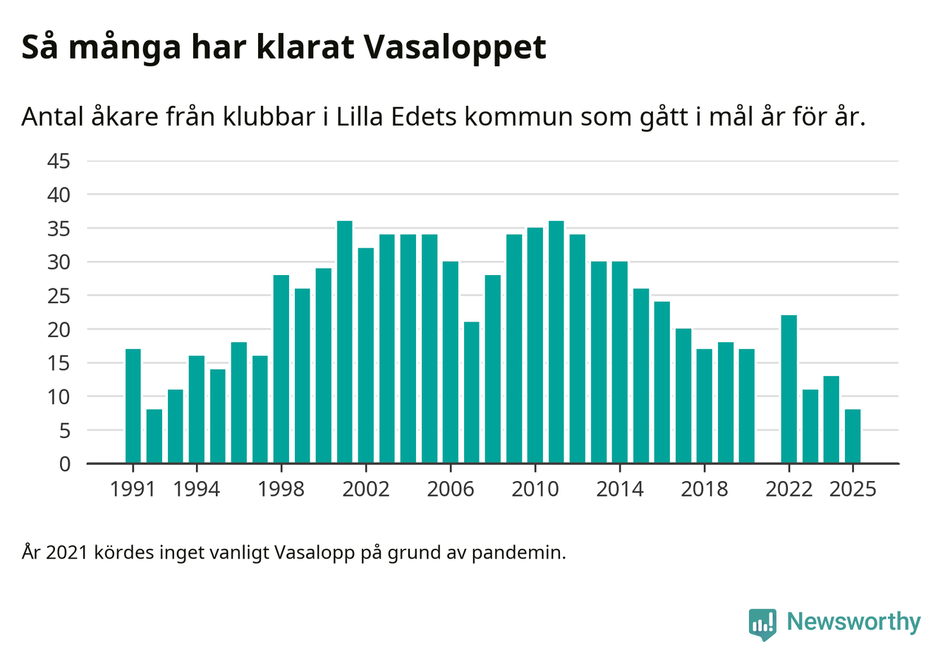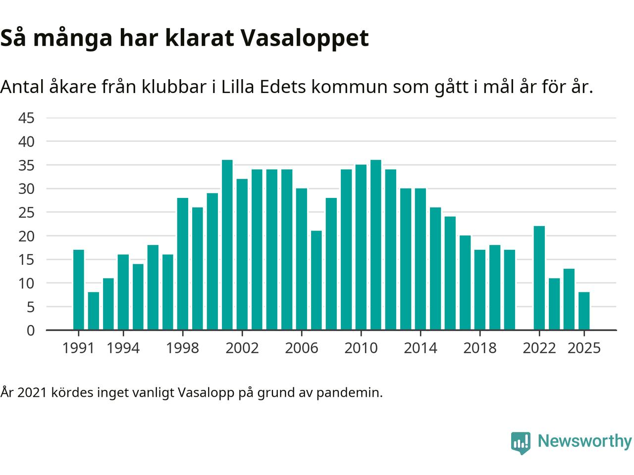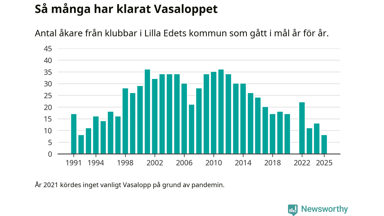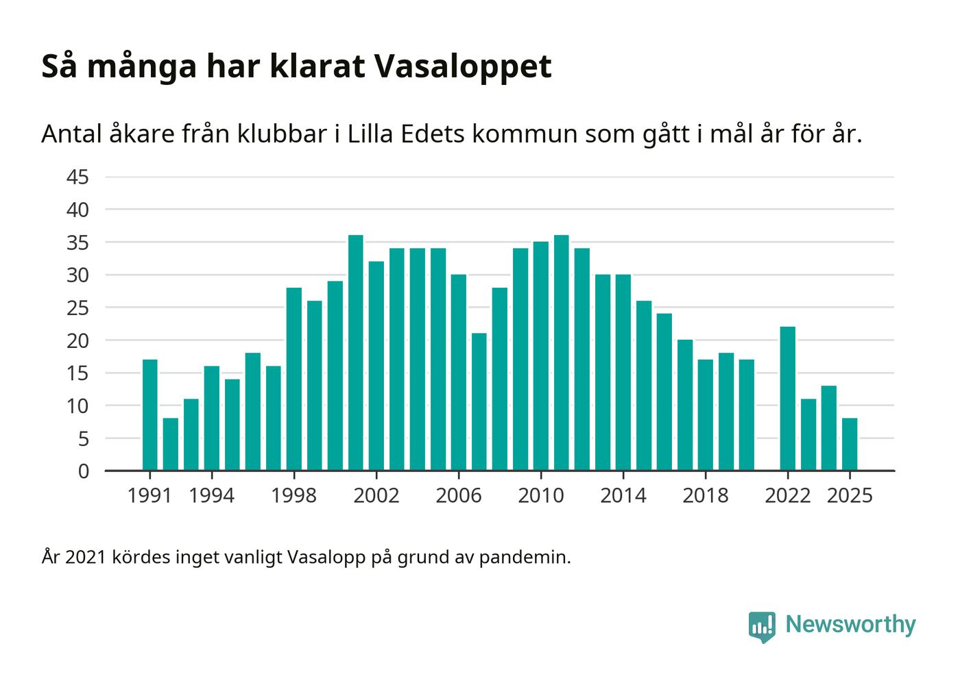 På söndag går starten för det 102:a Vasaloppet. Newsworthy har samlat in och sammanställt samtliga Vasaloppsresultat sedan 1991. Det ger en unik bild av hur skidåkare från klubbar i Lilla Edets kommun har klarat sig genom åren.