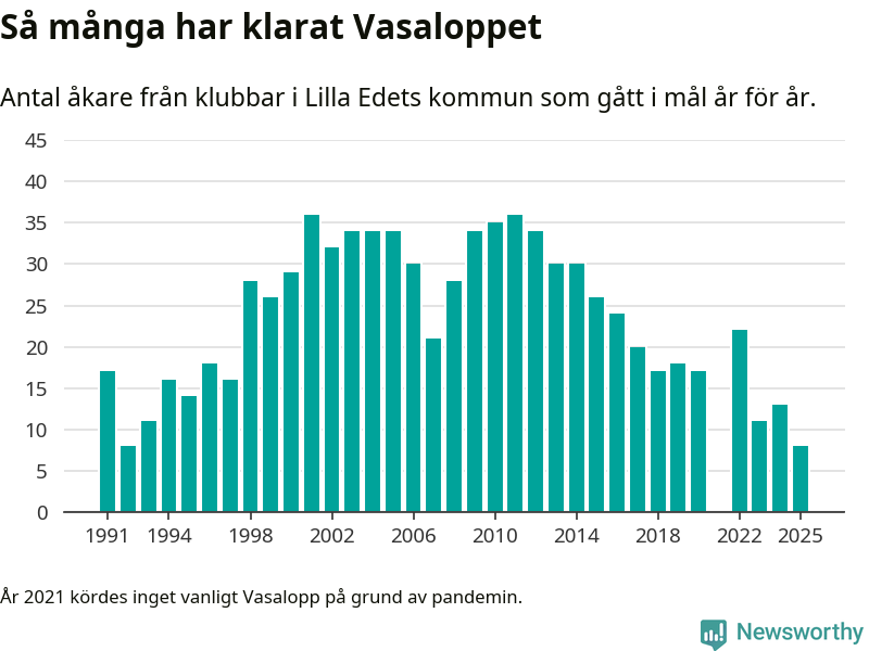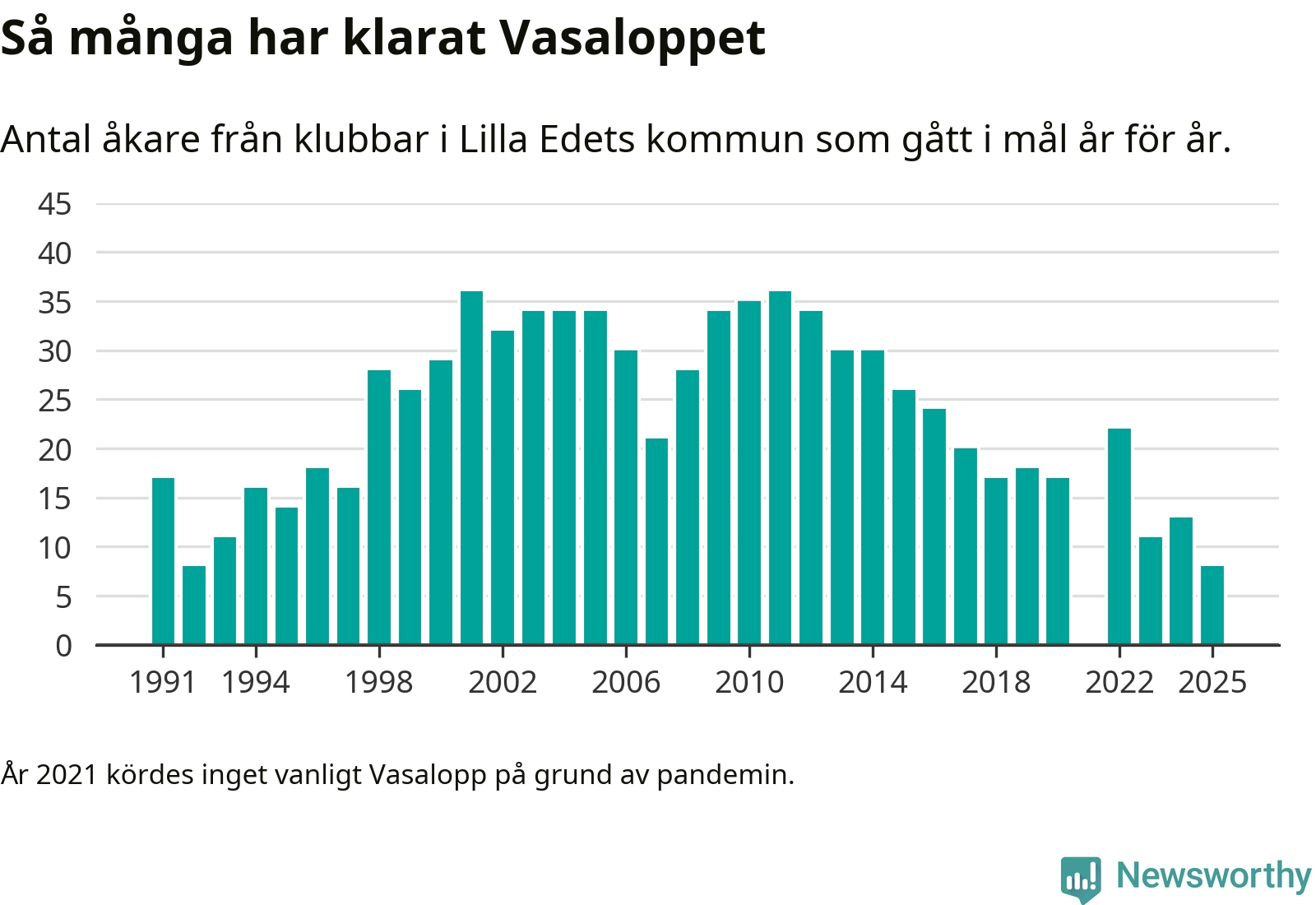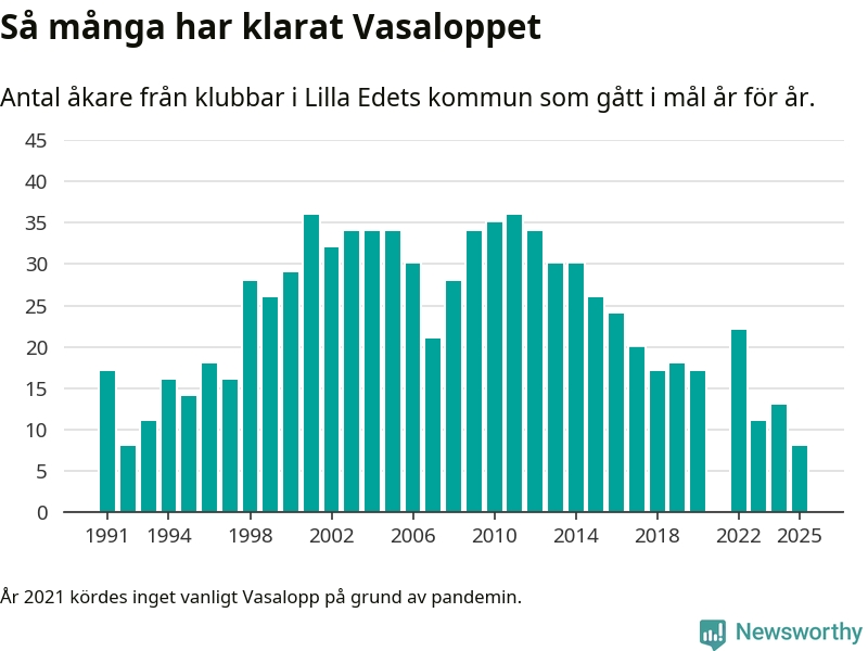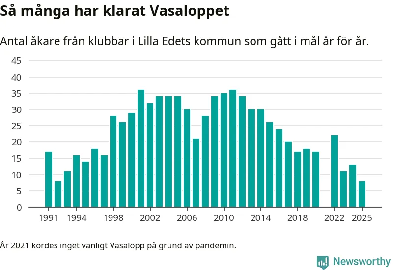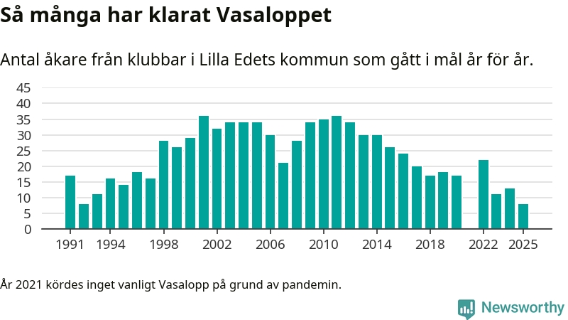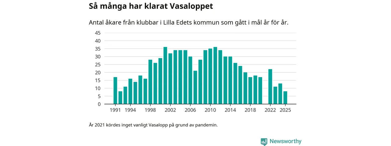 På söndag går starten för det 102:a Vasaloppet. Newsworthy har samlat in och sammanställt samtliga Vasaloppsresultat sedan 1991. Det ger en unik bild av hur skidåkare från klubbar i Lilla Edets kommun har klarat sig genom åren.