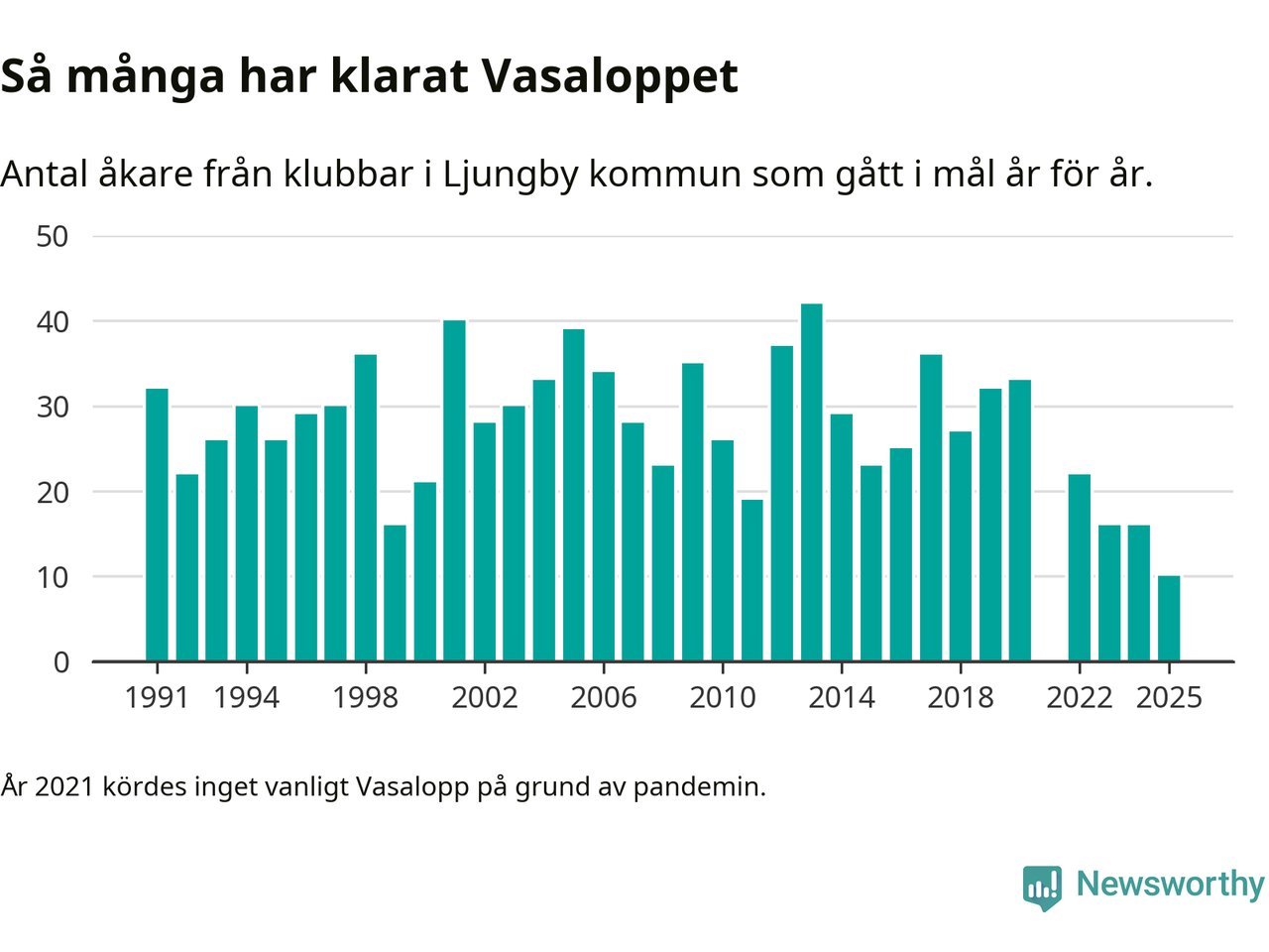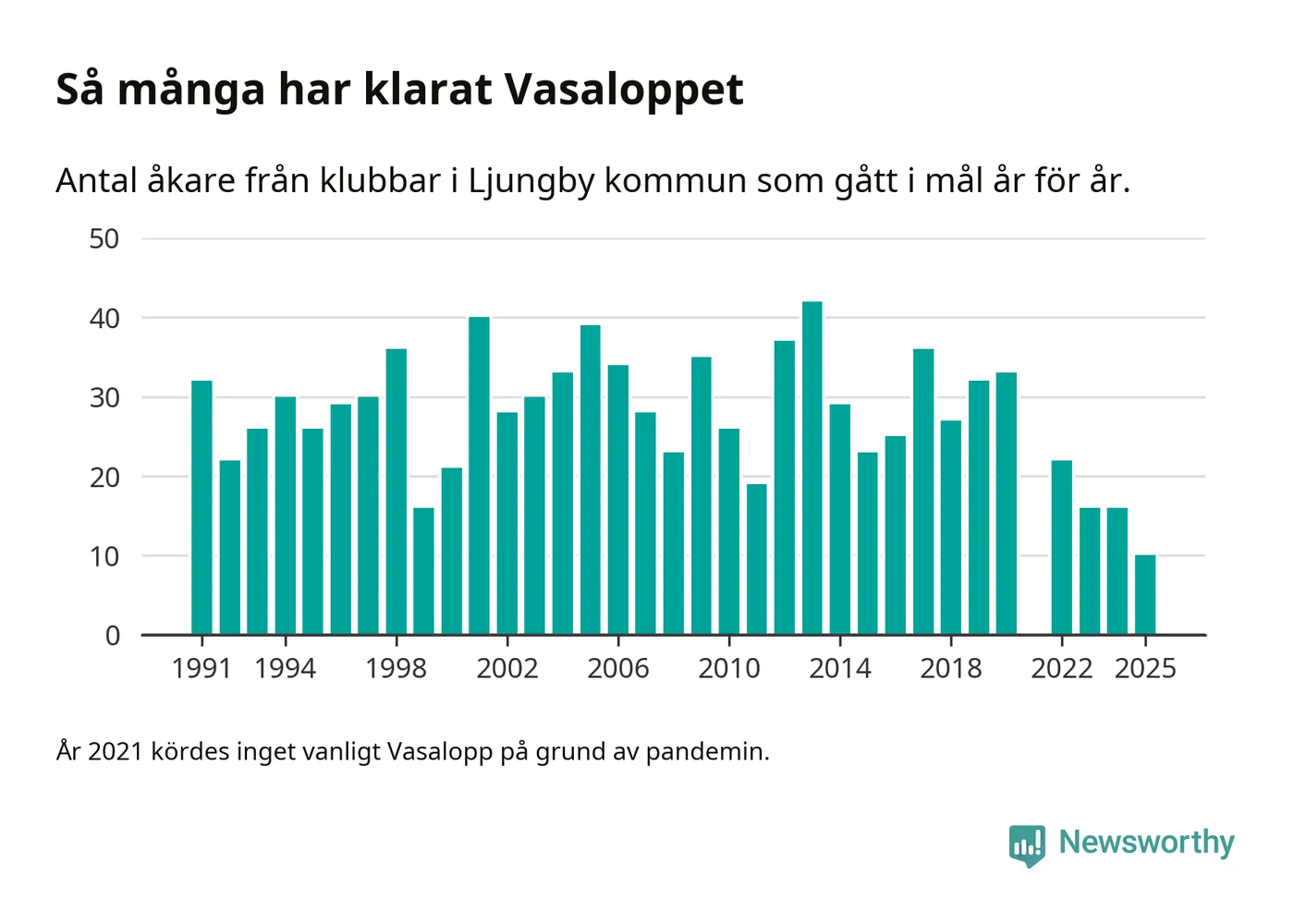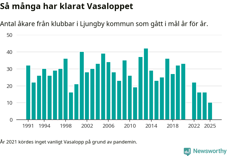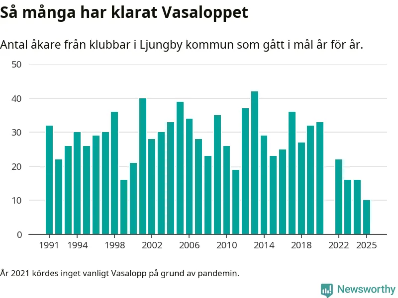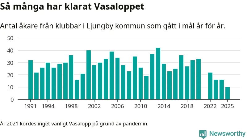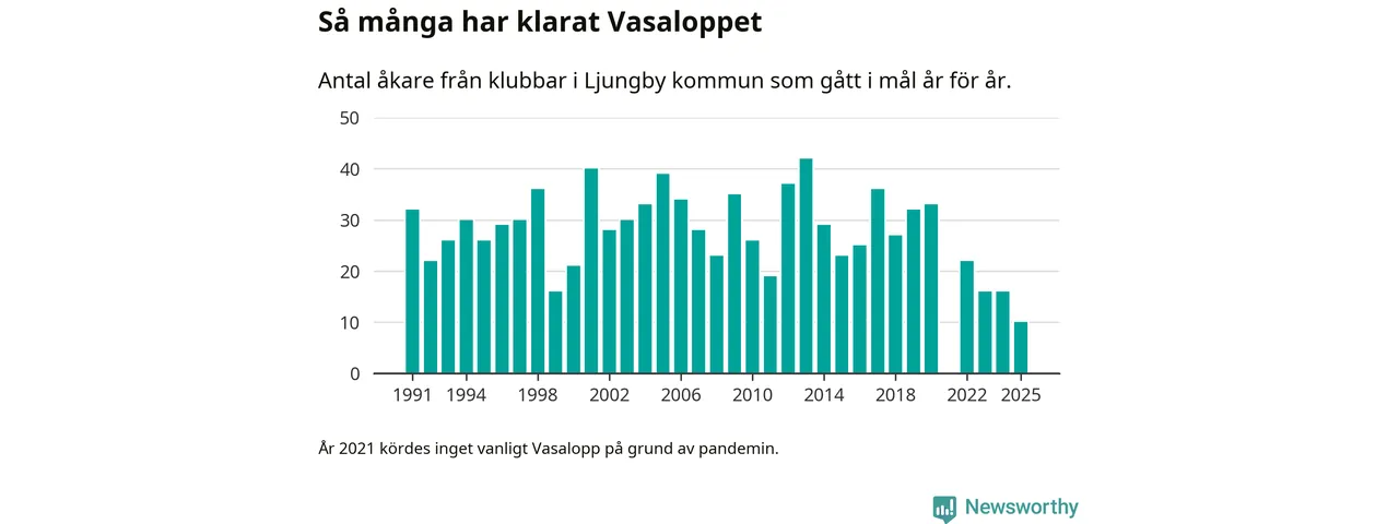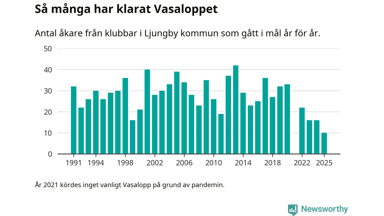På söndag går starten för det 102:a Vasaloppet. Newsworthy har samlat in och sammanställt samtliga Vasaloppsresultat sedan 1991. Det ger en unik bild av hur skidåkare från klubbar i Ljungby kommun har klarat sig genom åren.