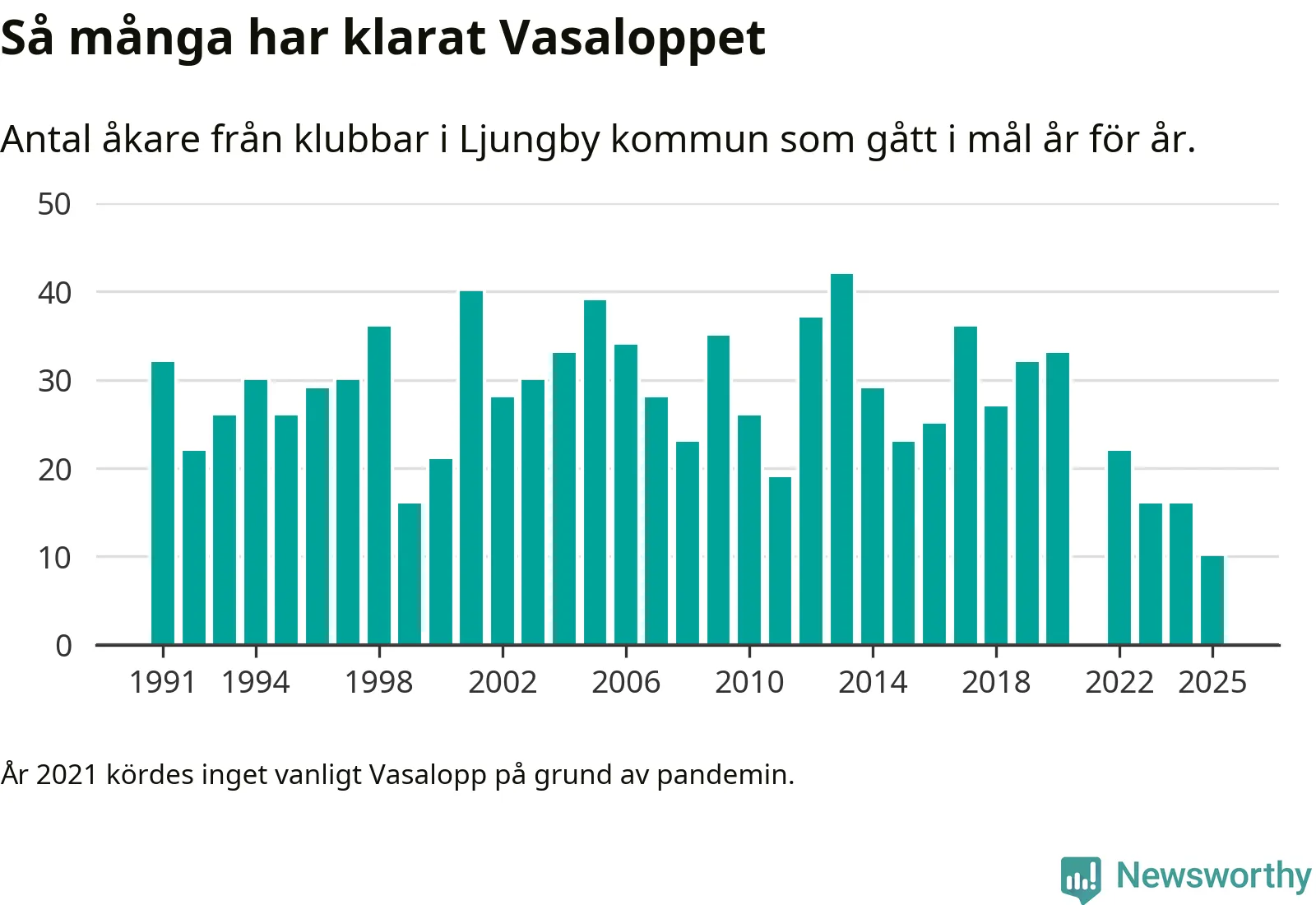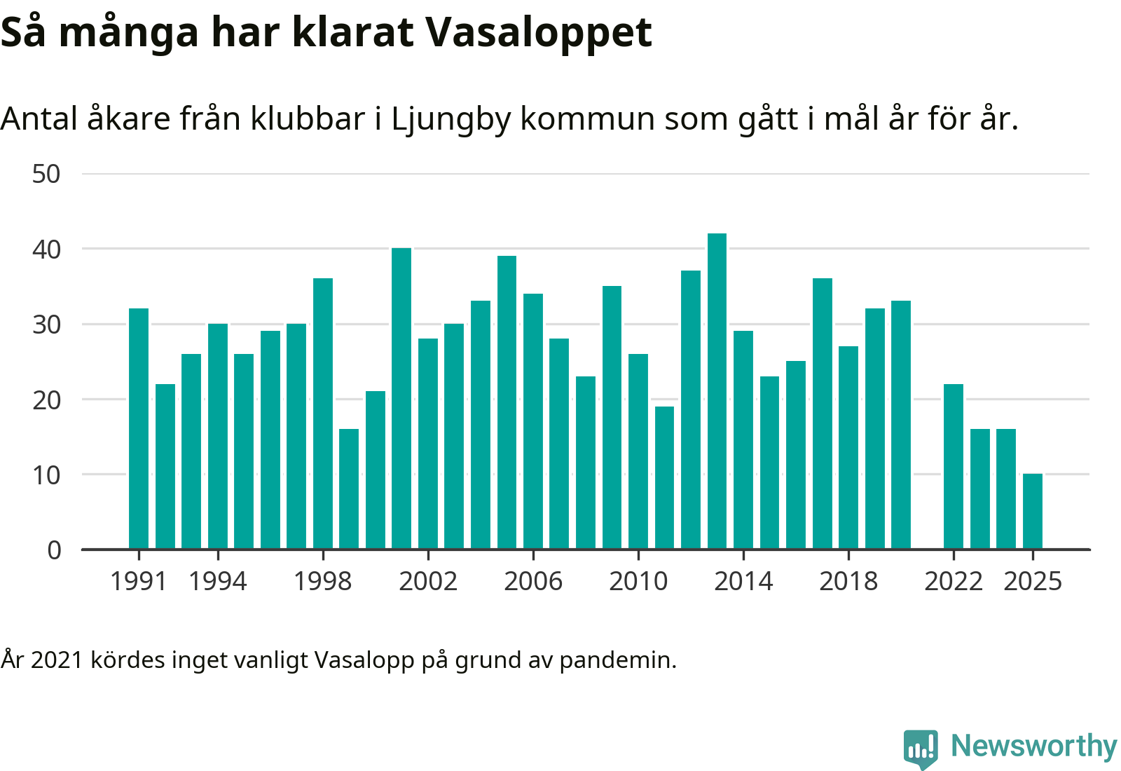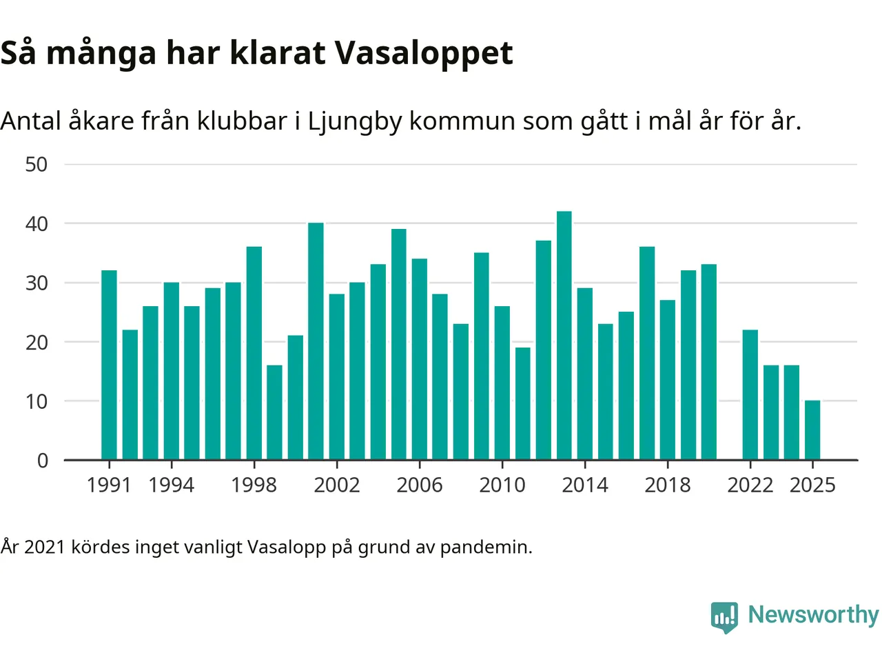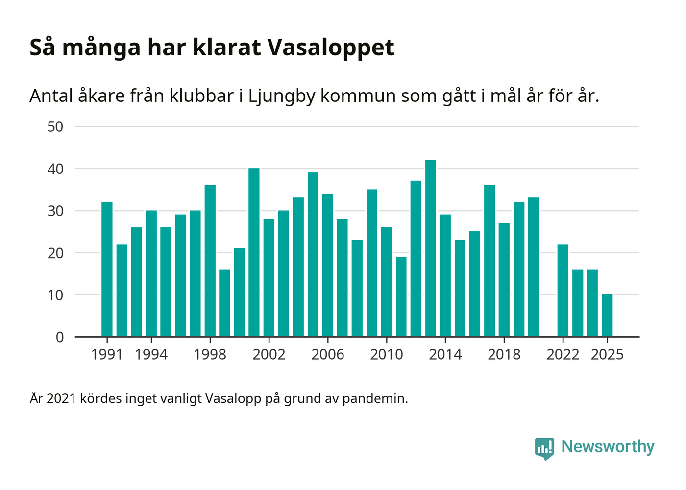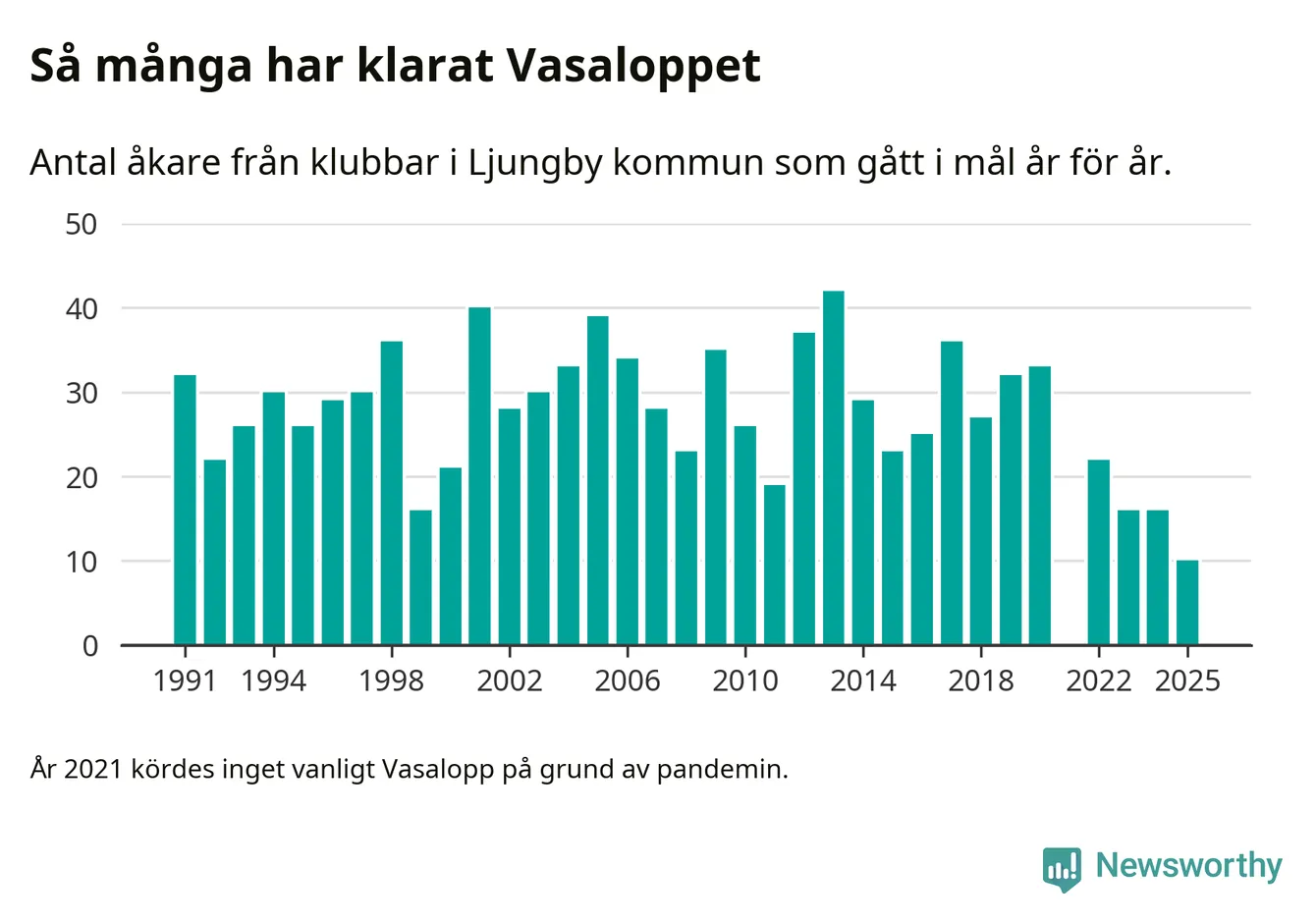 På söndag går starten för det 102:a Vasaloppet. Newsworthy har samlat in och sammanställt samtliga Vasaloppsresultat sedan 1991. Det ger en unik bild av hur skidåkare från klubbar i Ljungby kommun har klarat sig genom åren.