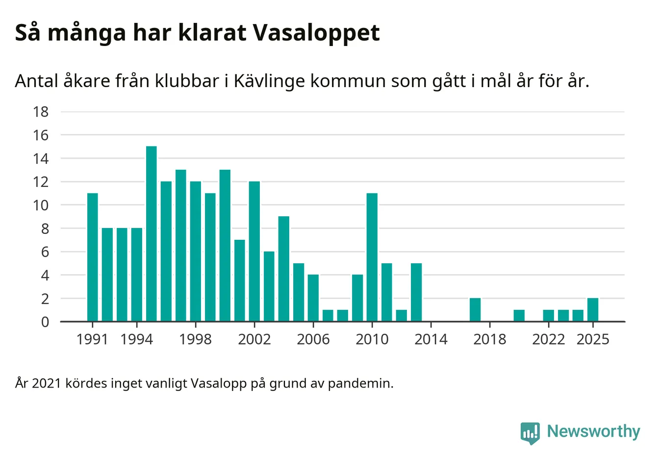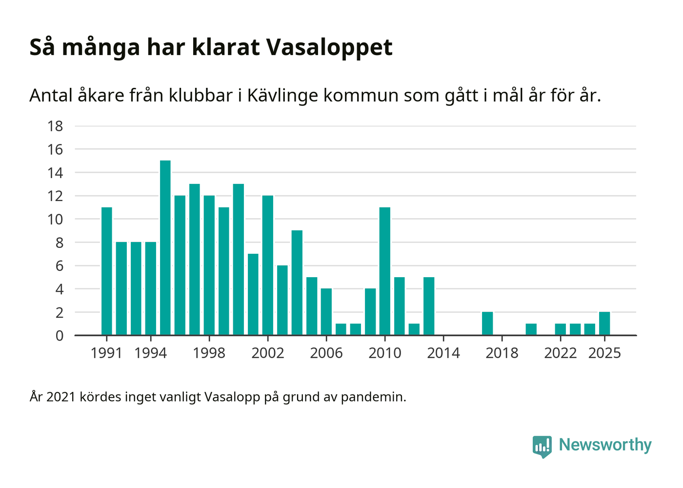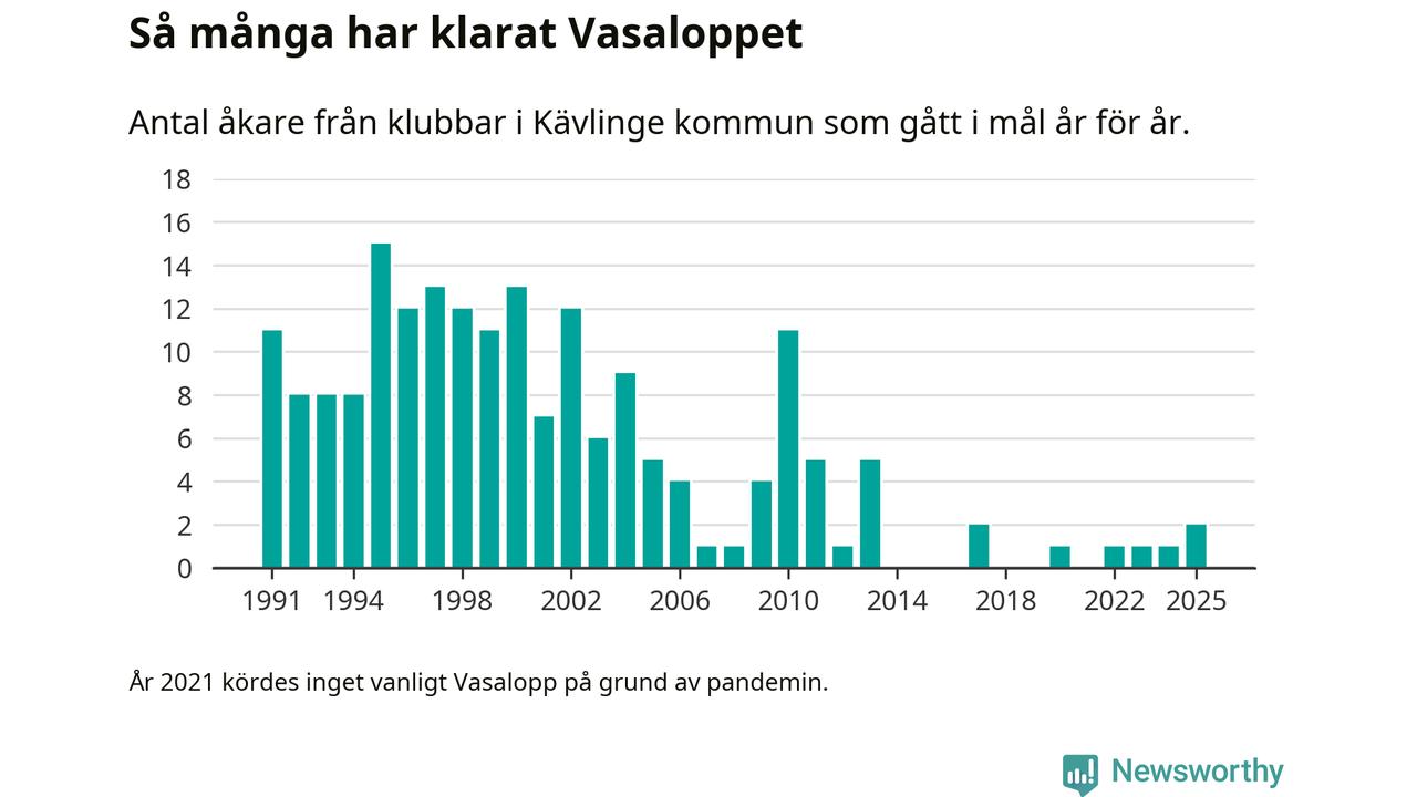 På söndag går starten för det 102:a Vasaloppet. Newsworthy har samlat in och sammanställt samtliga Vasaloppsresultat sedan 1991. Det ger en unik bild av hur skidåkare från klubbar i Kävlinge kommun har klarat sig genom åren.