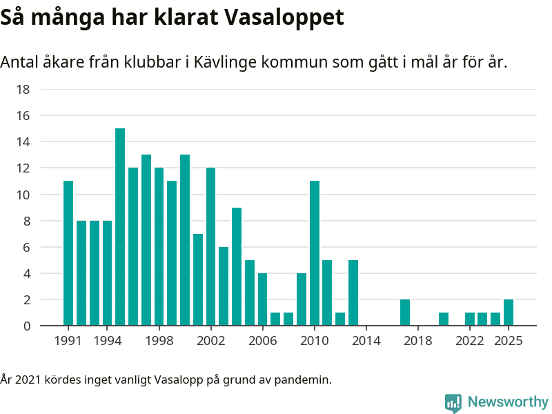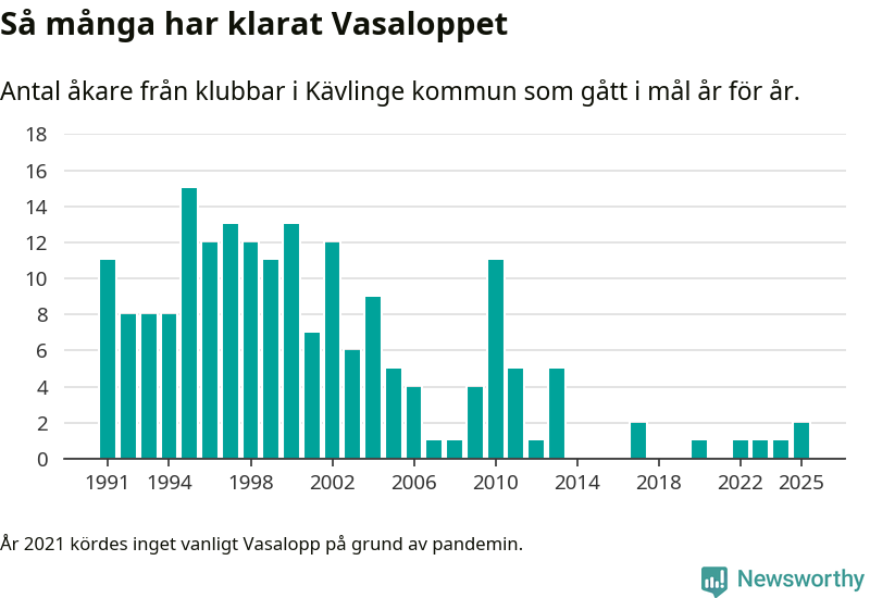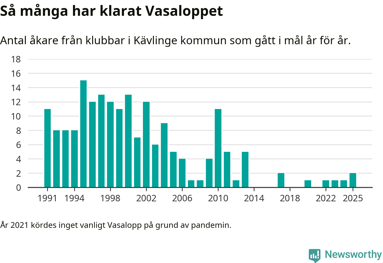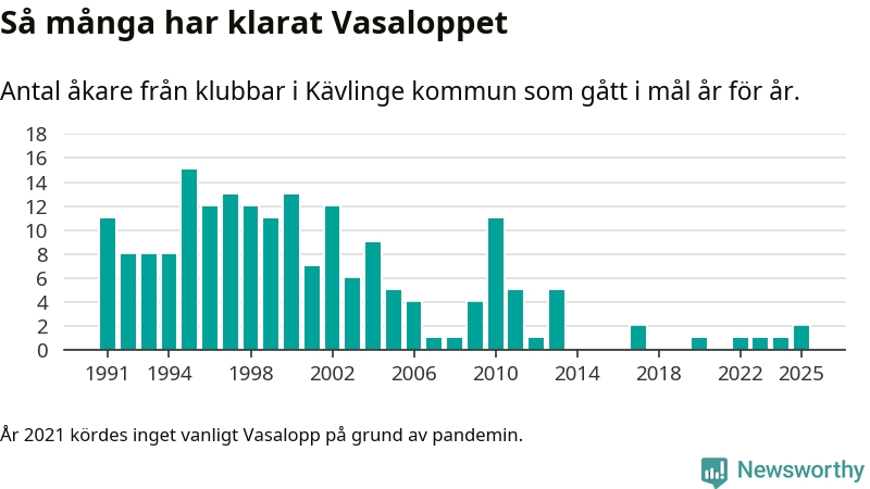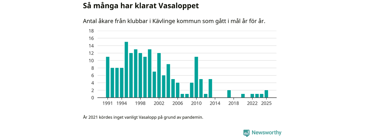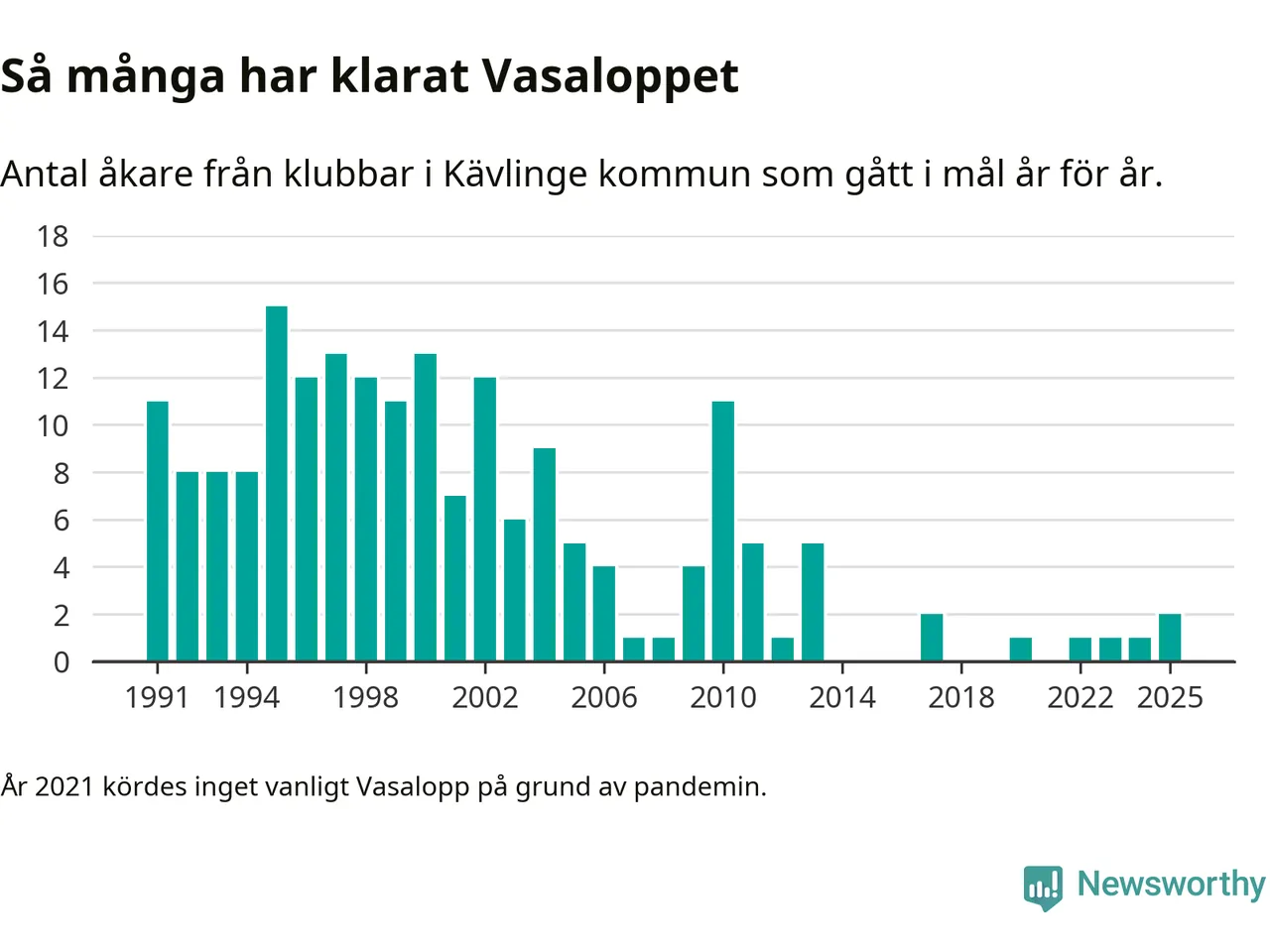 På söndag går starten för det 102:a Vasaloppet. Newsworthy har samlat in och sammanställt samtliga Vasaloppsresultat sedan 1991. Det ger en unik bild av hur skidåkare från klubbar i Kävlinge kommun har klarat sig genom åren.