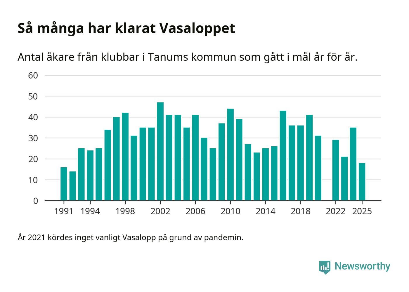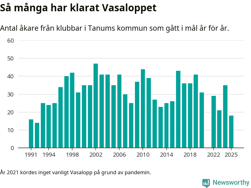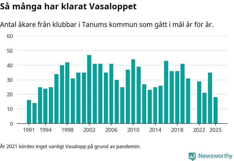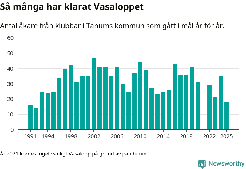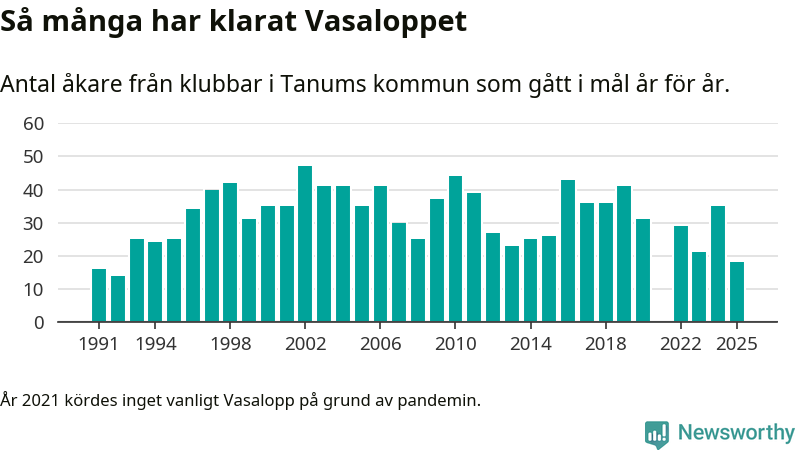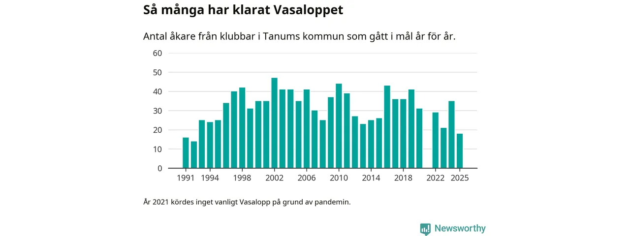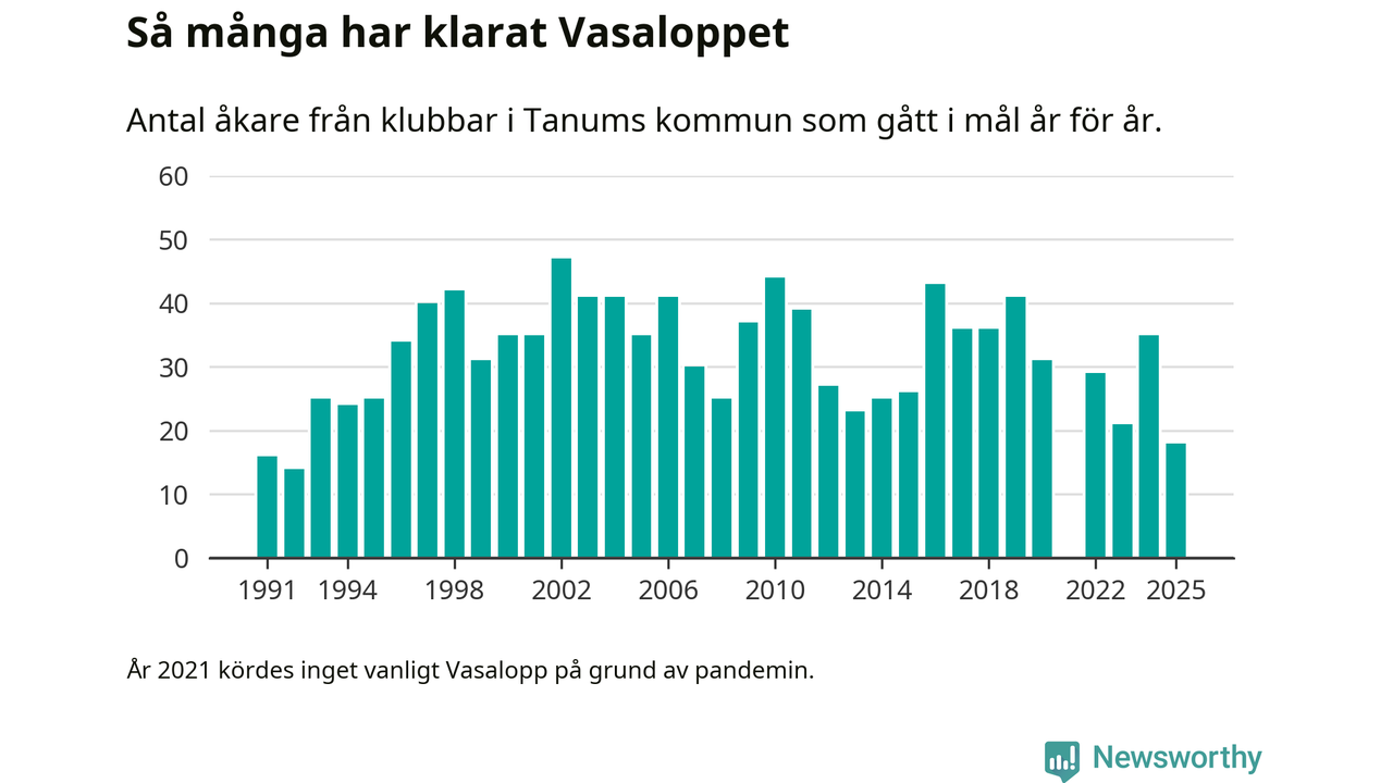 På söndag går starten för det 102:a Vasaloppet. Newsworthy har samlat in och sammanställt samtliga Vasaloppsresultat sedan 1991. Det ger en unik bild av hur skidåkare från klubbar i Tanums kommun har klarat sig genom åren.