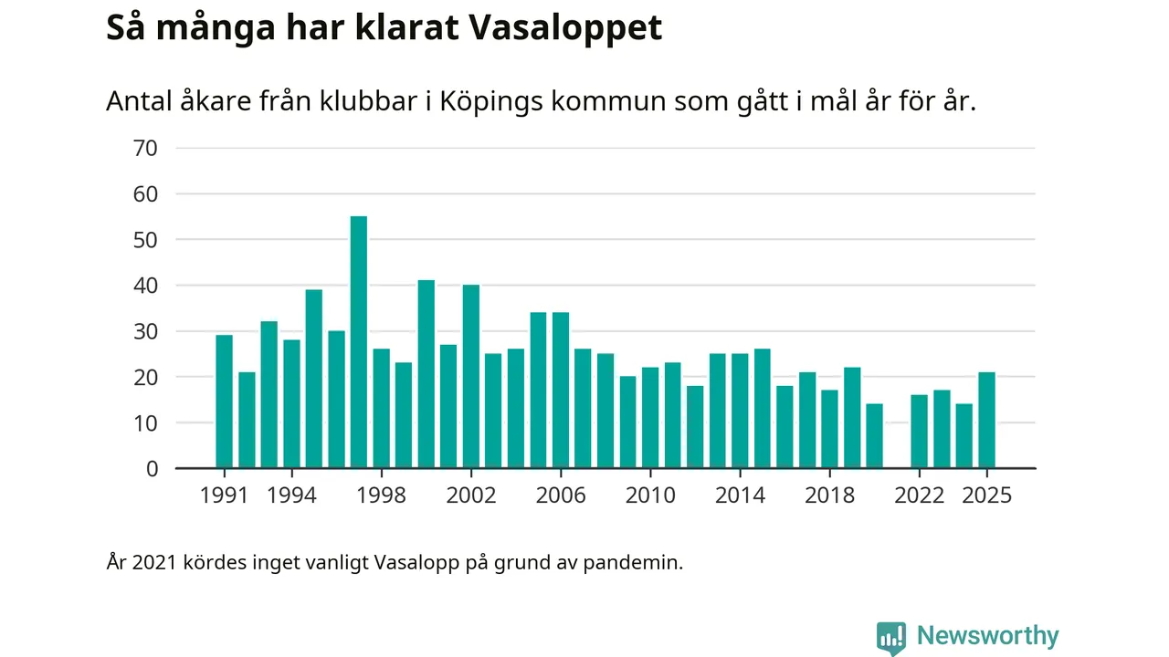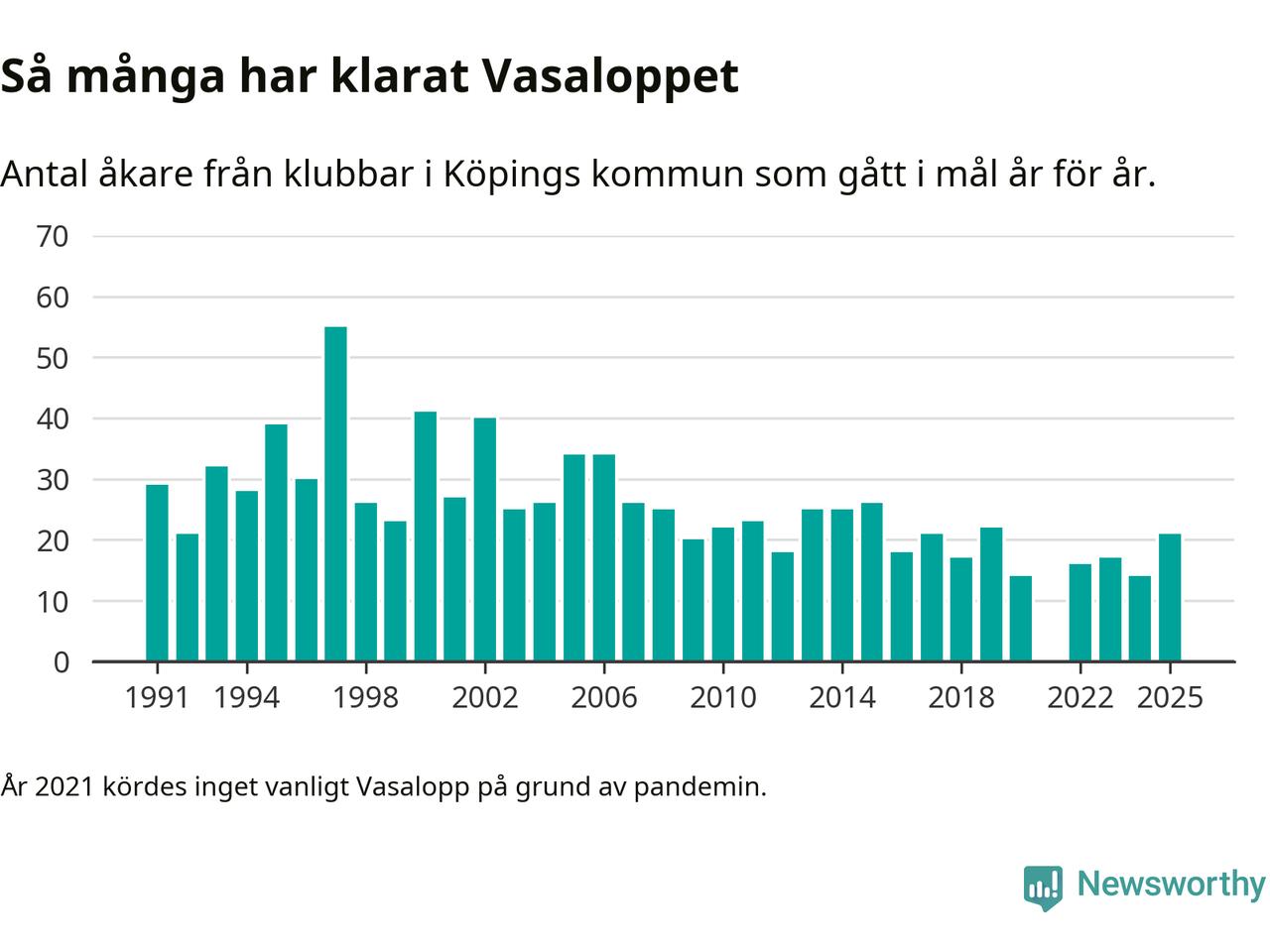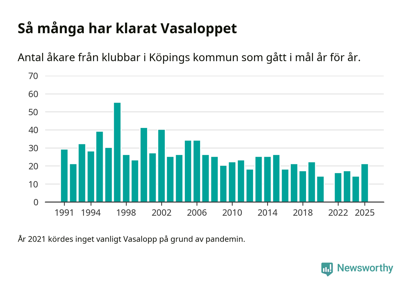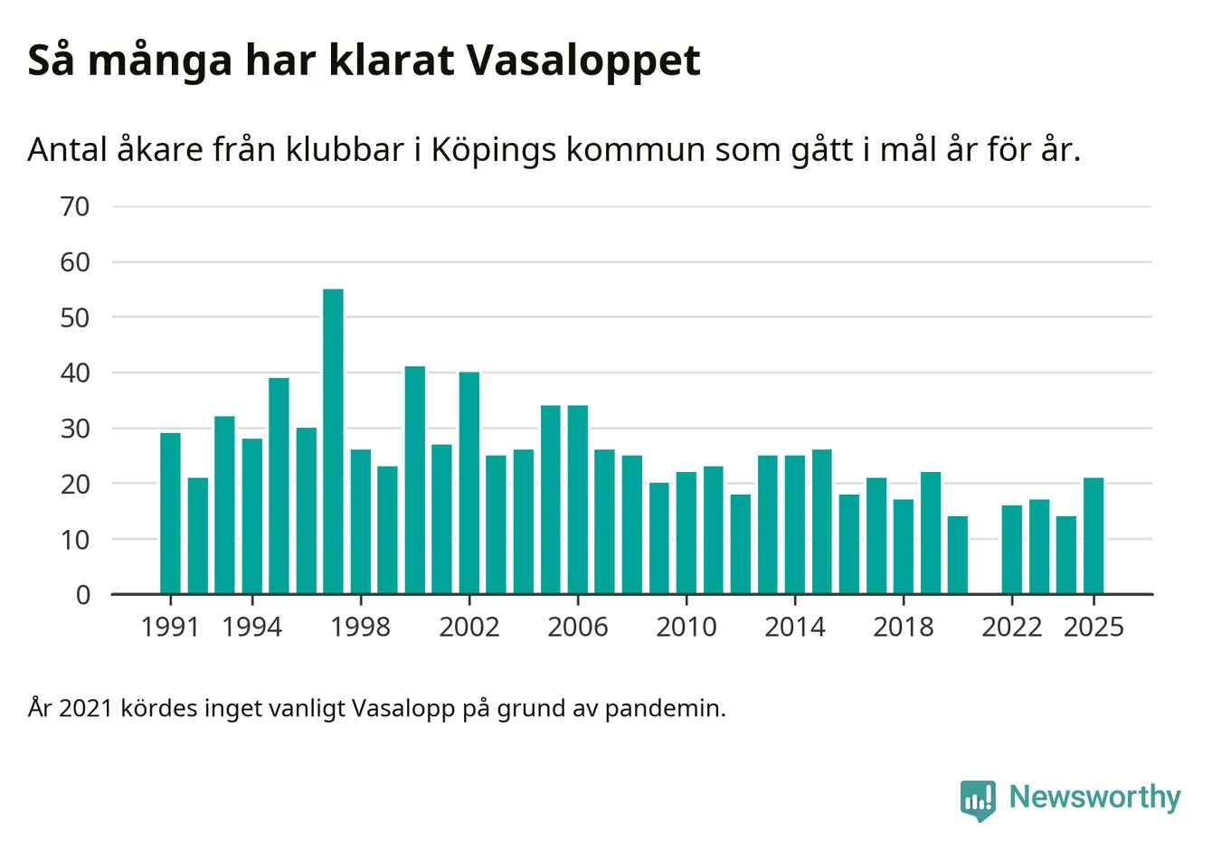 På söndag går starten för det 102:a Vasaloppet. Newsworthy har samlat in och sammanställt samtliga Vasaloppsresultat sedan 1991. Det ger en unik bild av hur skidåkare från klubbar i Köpings kommun har klarat sig genom åren.