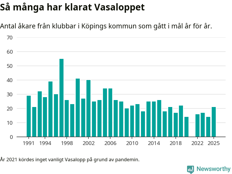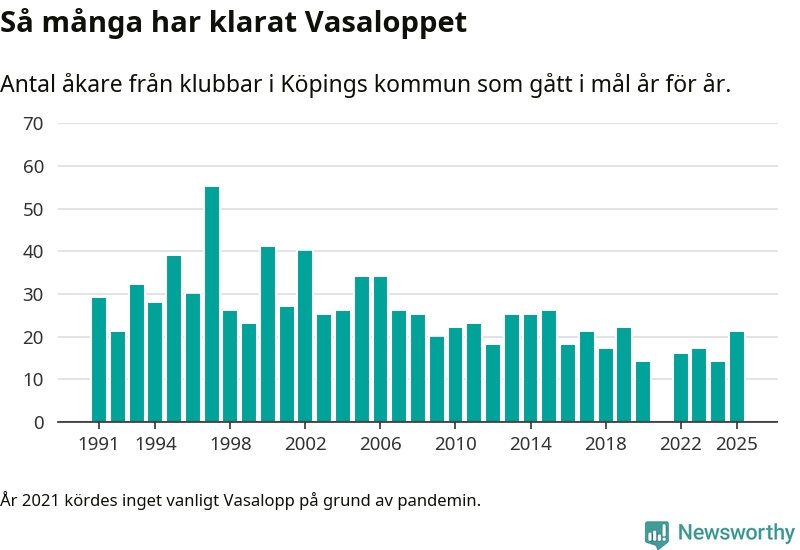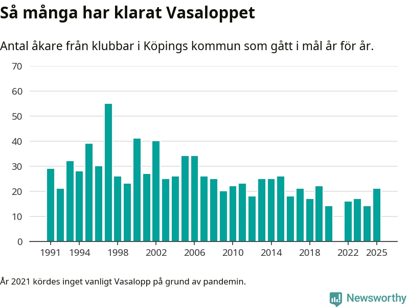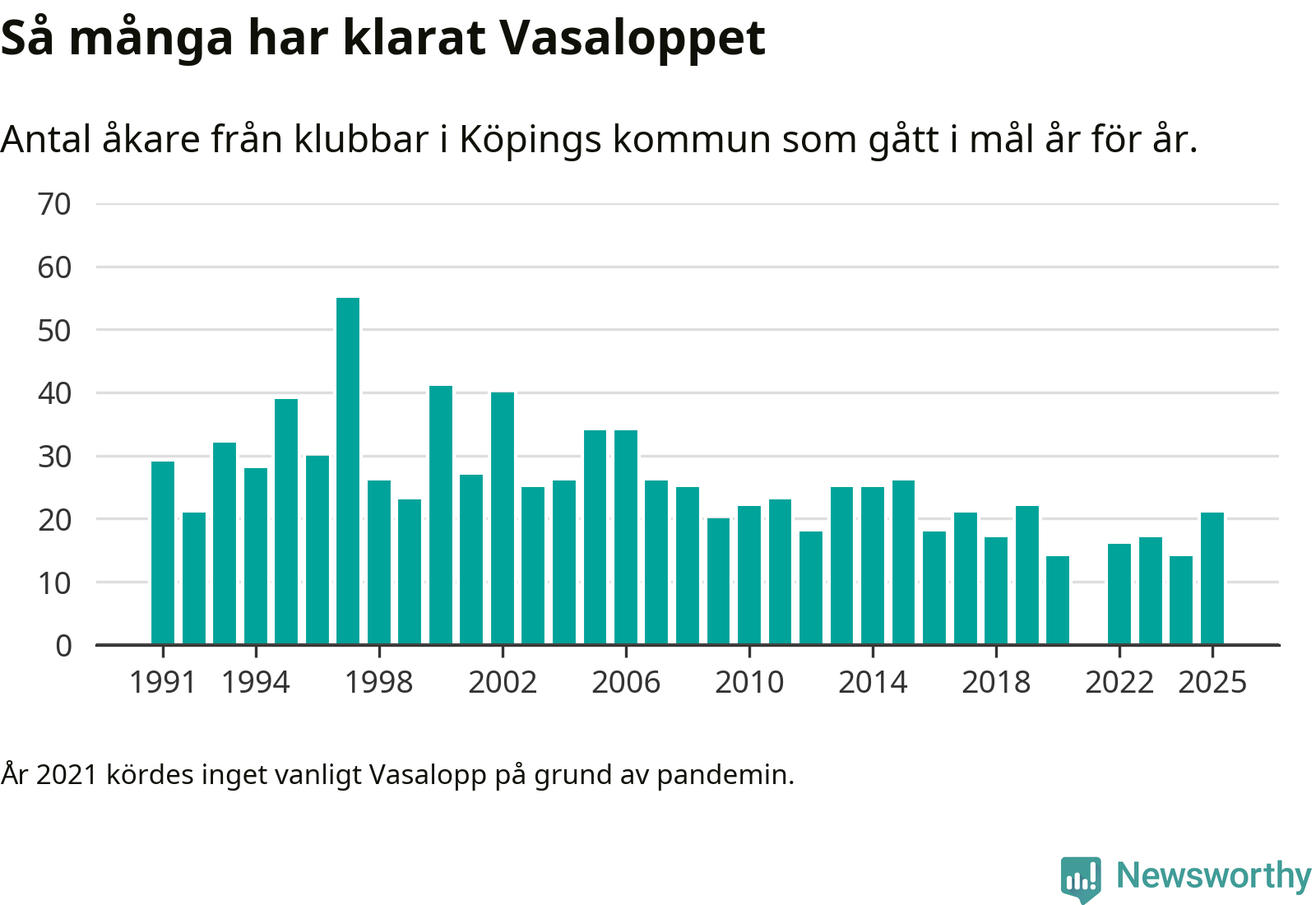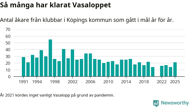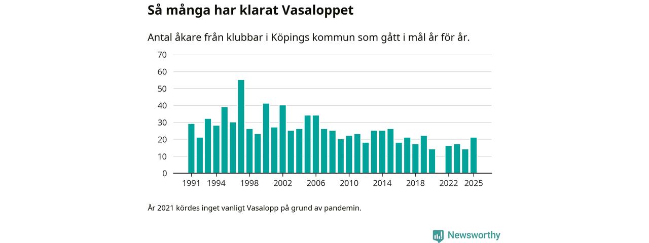 På söndag går starten för det 102:a Vasaloppet. Newsworthy har samlat in och sammanställt samtliga Vasaloppsresultat sedan 1991. Det ger en unik bild av hur skidåkare från klubbar i Köpings kommun har klarat sig genom åren.
