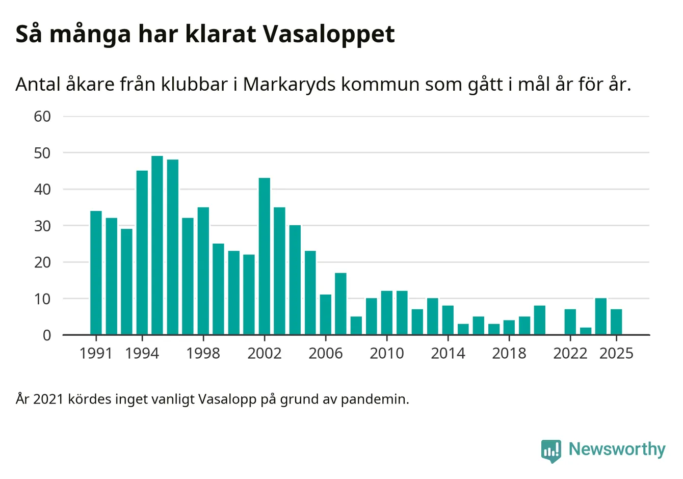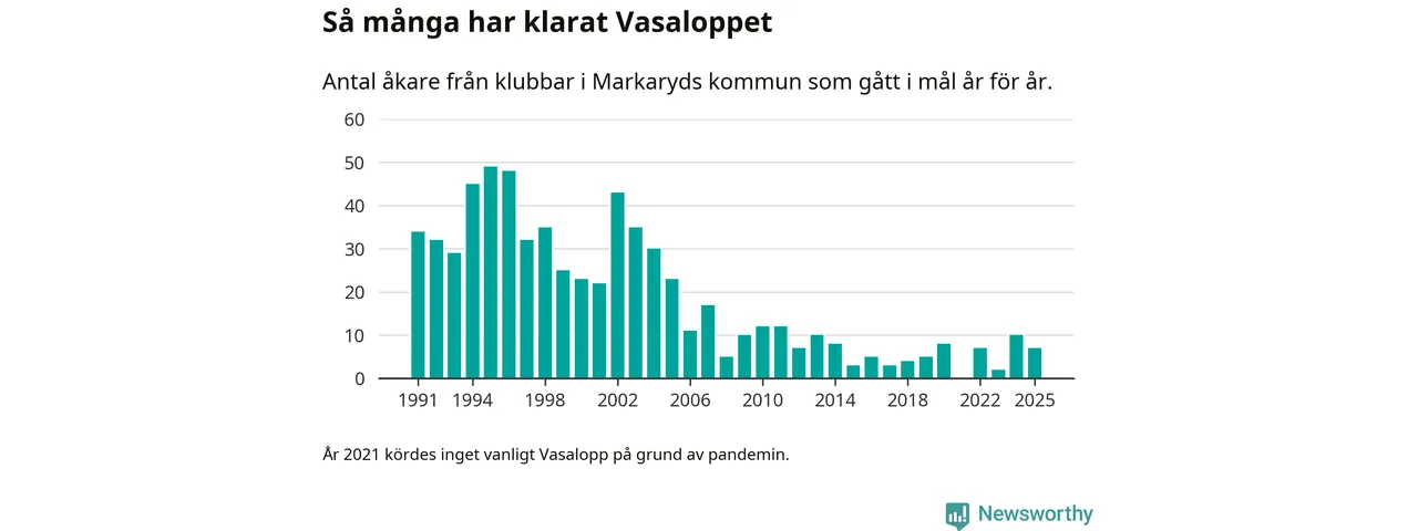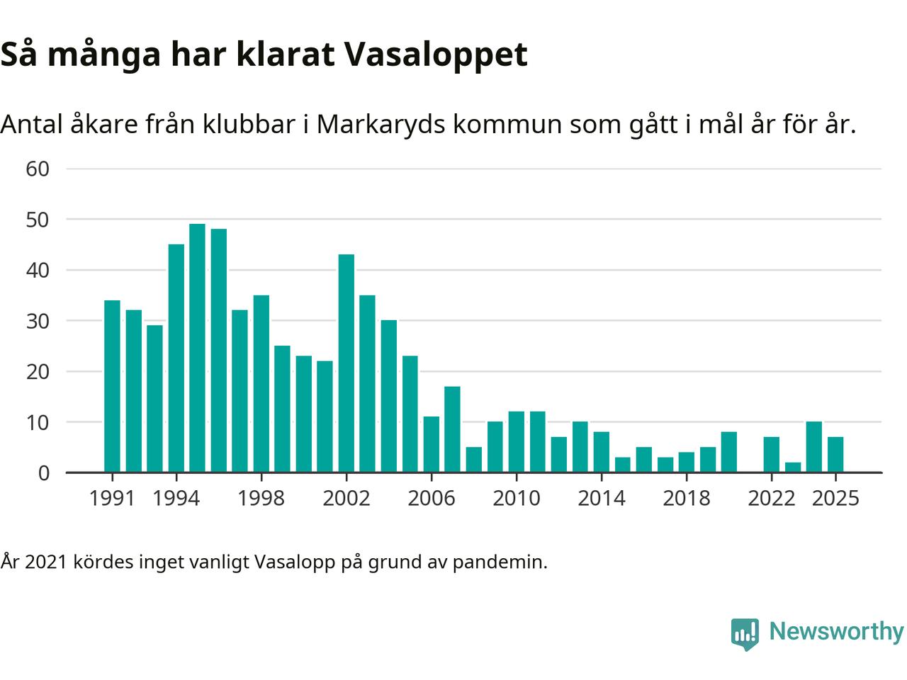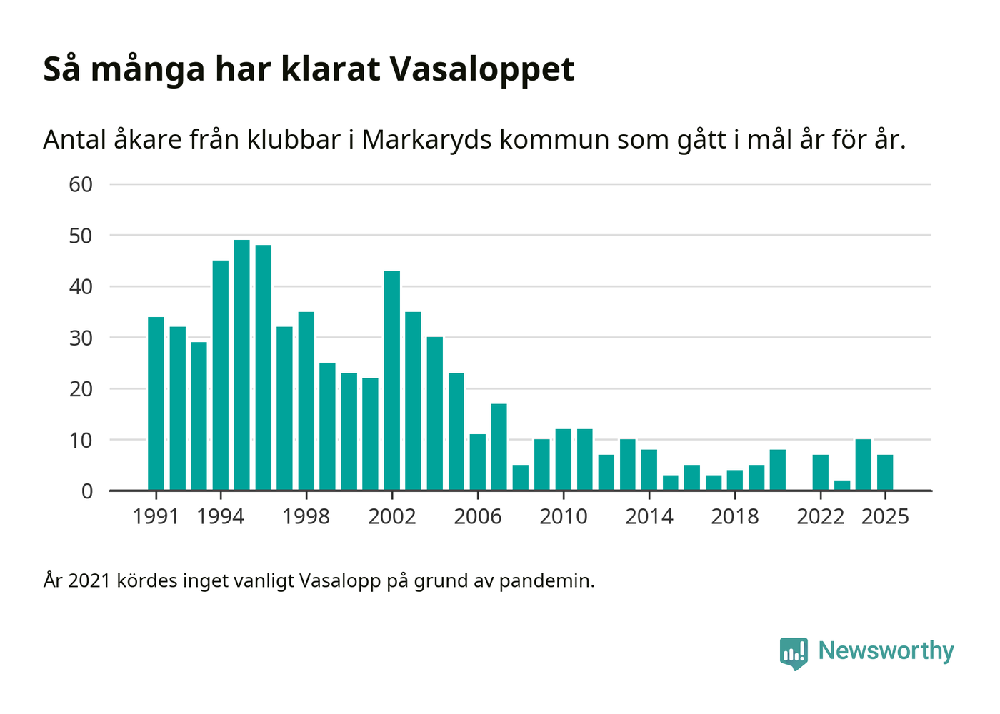 På söndag går starten för det 102:a Vasaloppet. Newsworthy har samlat in och sammanställt samtliga Vasaloppsresultat sedan 1991. Det ger en unik bild av hur skidåkare från klubbar i Markaryds kommun har klarat sig genom åren.