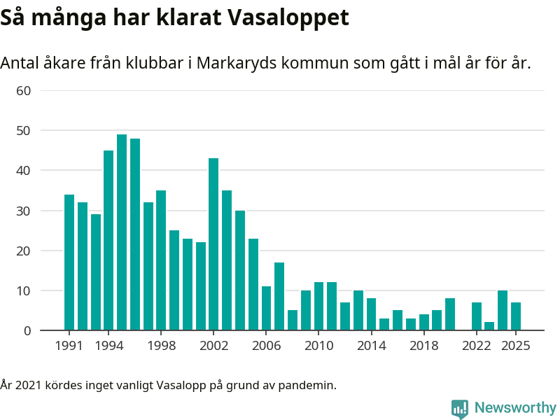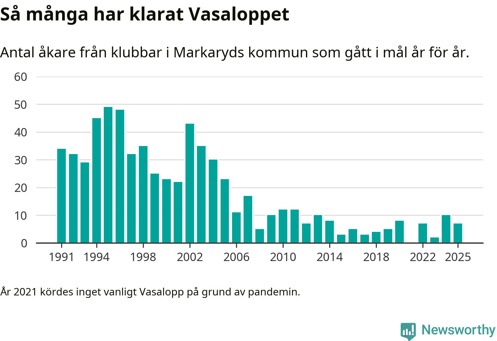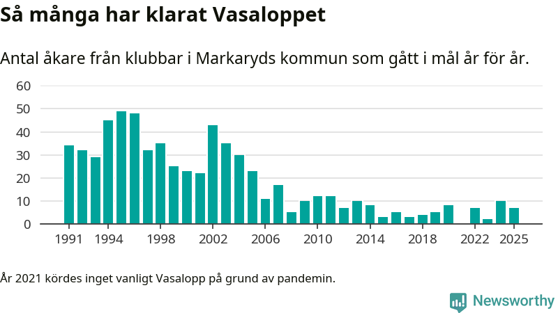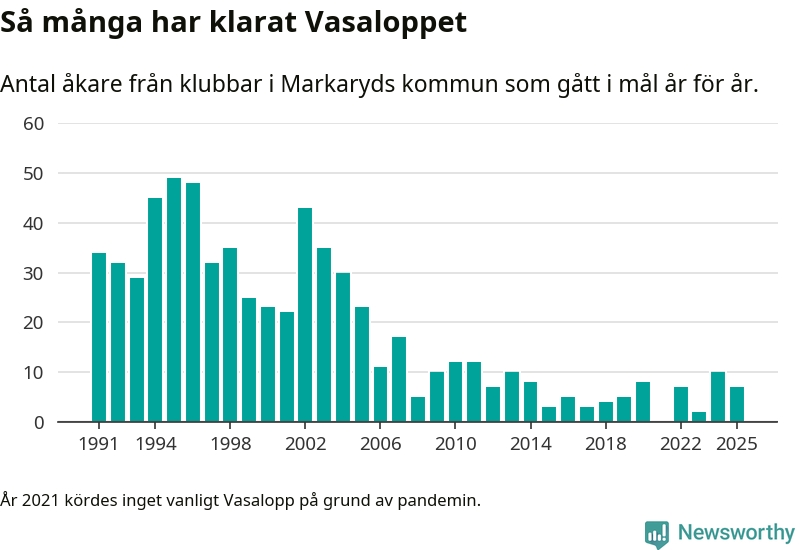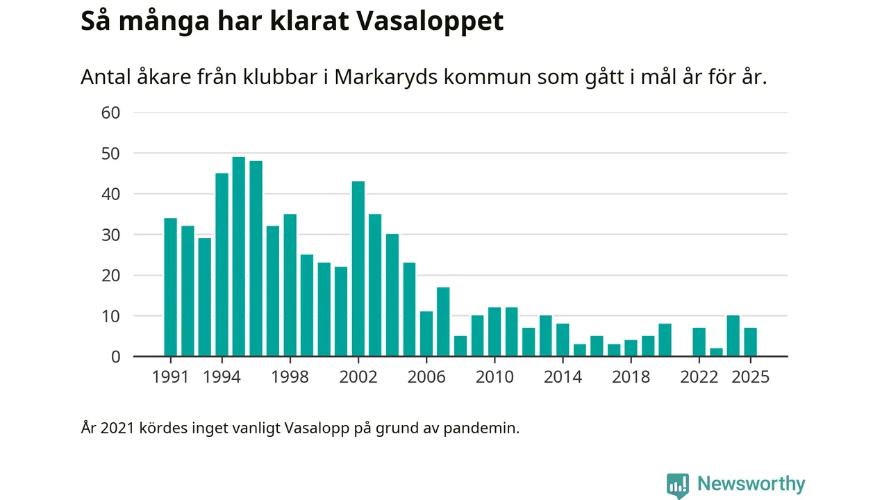 På söndag går starten för det 102:a Vasaloppet. Newsworthy har samlat in och sammanställt samtliga Vasaloppsresultat sedan 1991. Det ger en unik bild av hur skidåkare från klubbar i Markaryds kommun har klarat sig genom åren.