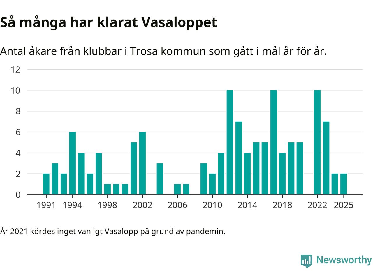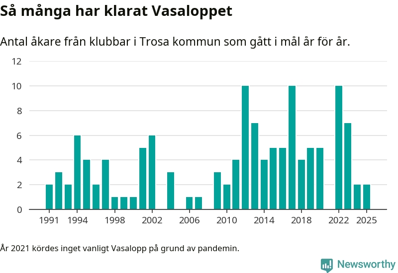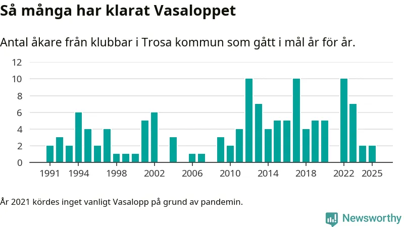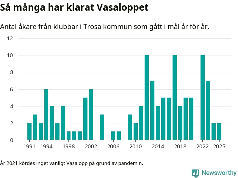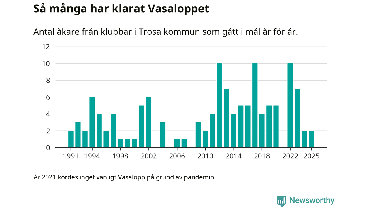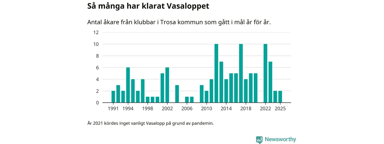 På söndag går starten för det 102:a Vasaloppet. Newsworthy har samlat in och sammanställt samtliga Vasaloppsresultat sedan 1991. Det ger en unik bild av hur skidåkare från klubbar i Trosa kommun har klarat sig genom åren.