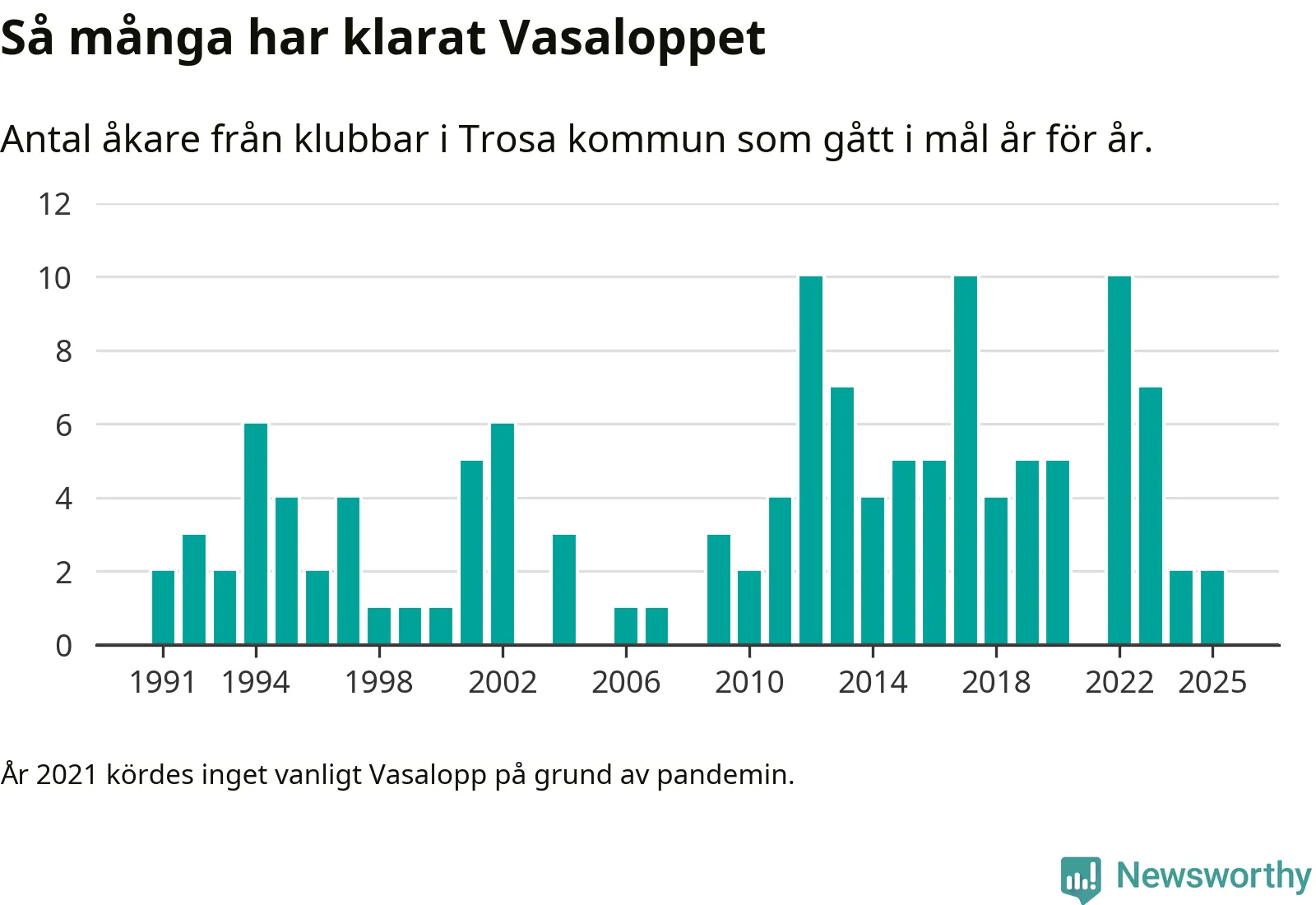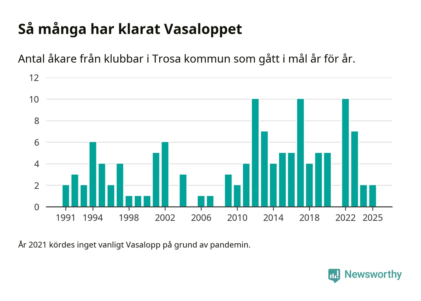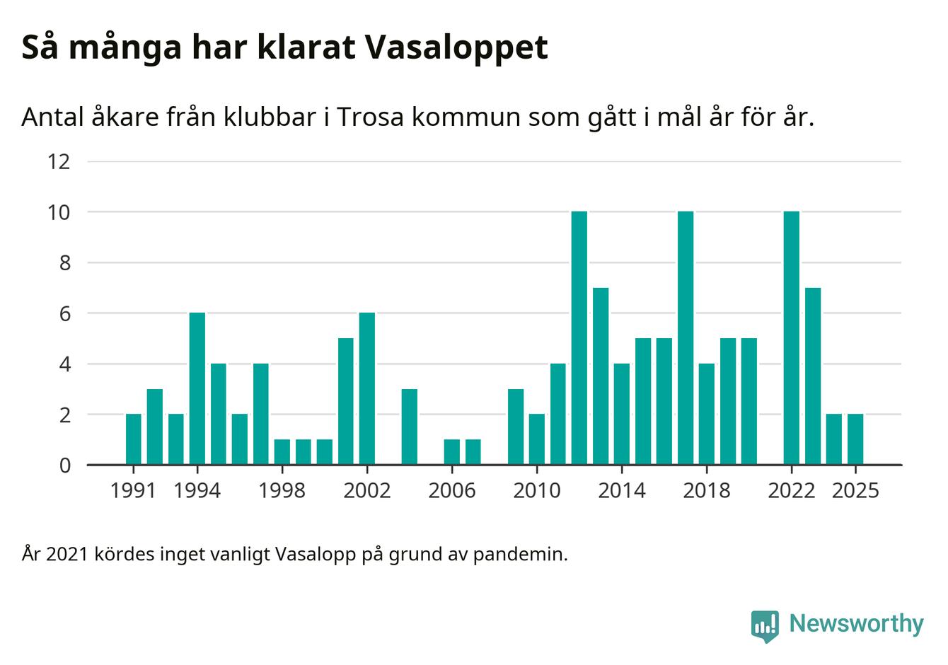 På söndag går starten för det 102:a Vasaloppet. Newsworthy har samlat in och sammanställt samtliga Vasaloppsresultat sedan 1991. Det ger en unik bild av hur skidåkare från klubbar i Trosa kommun har klarat sig genom åren.
